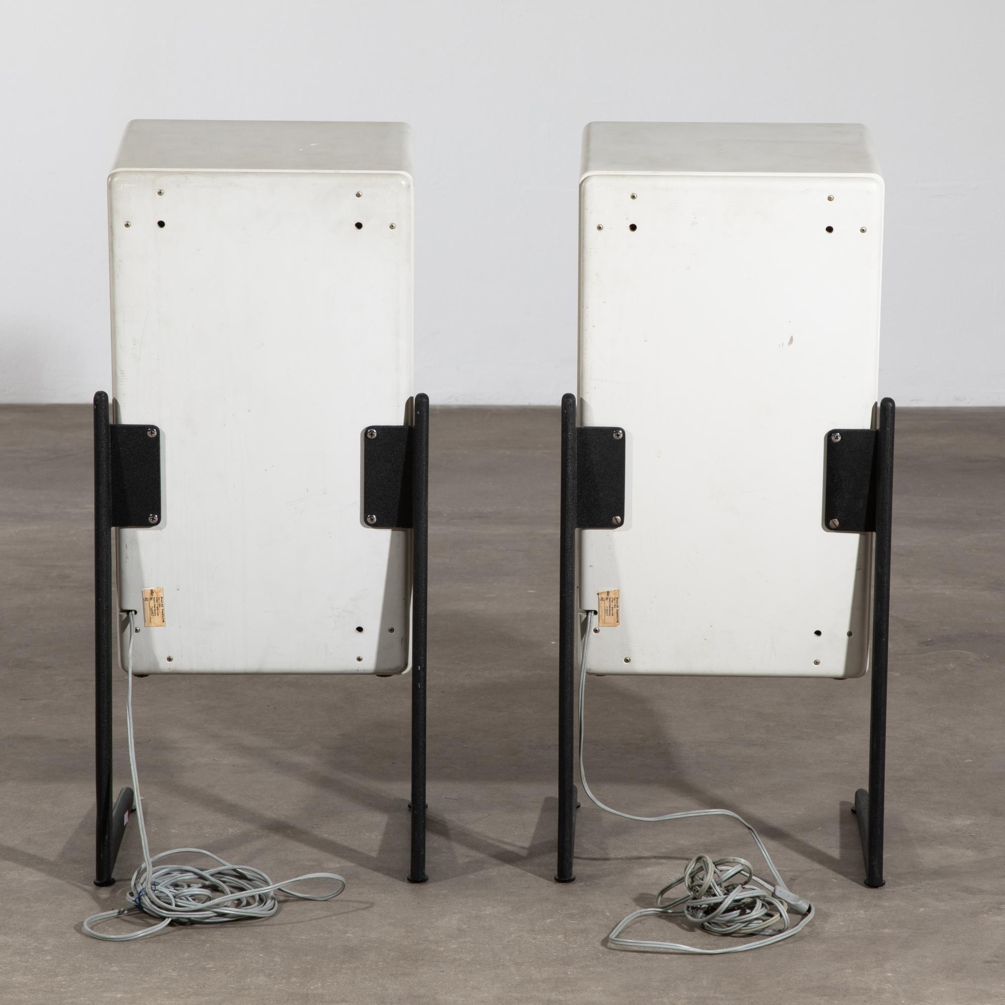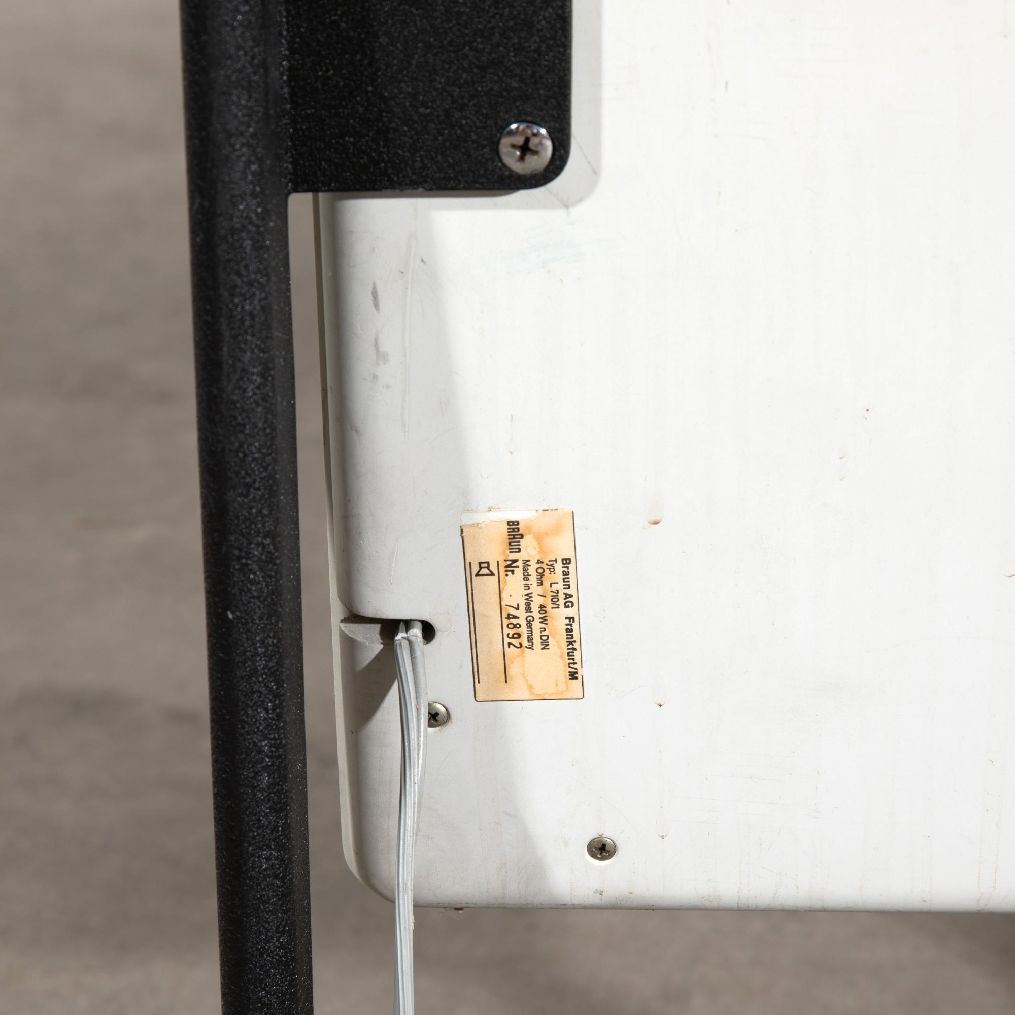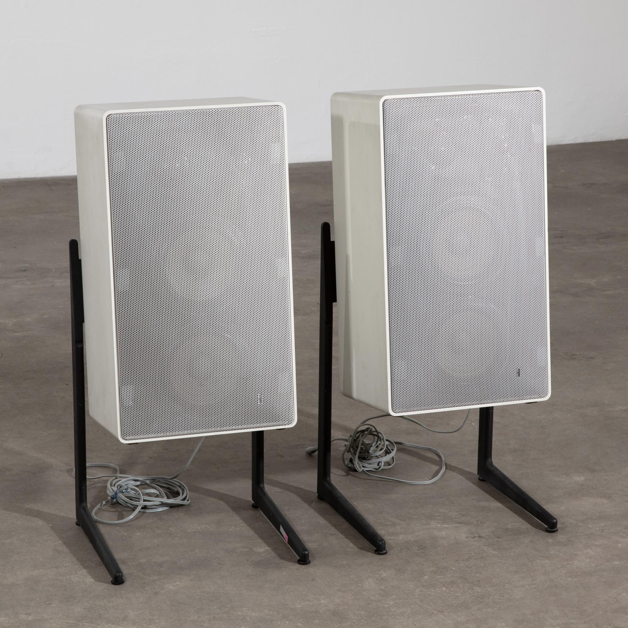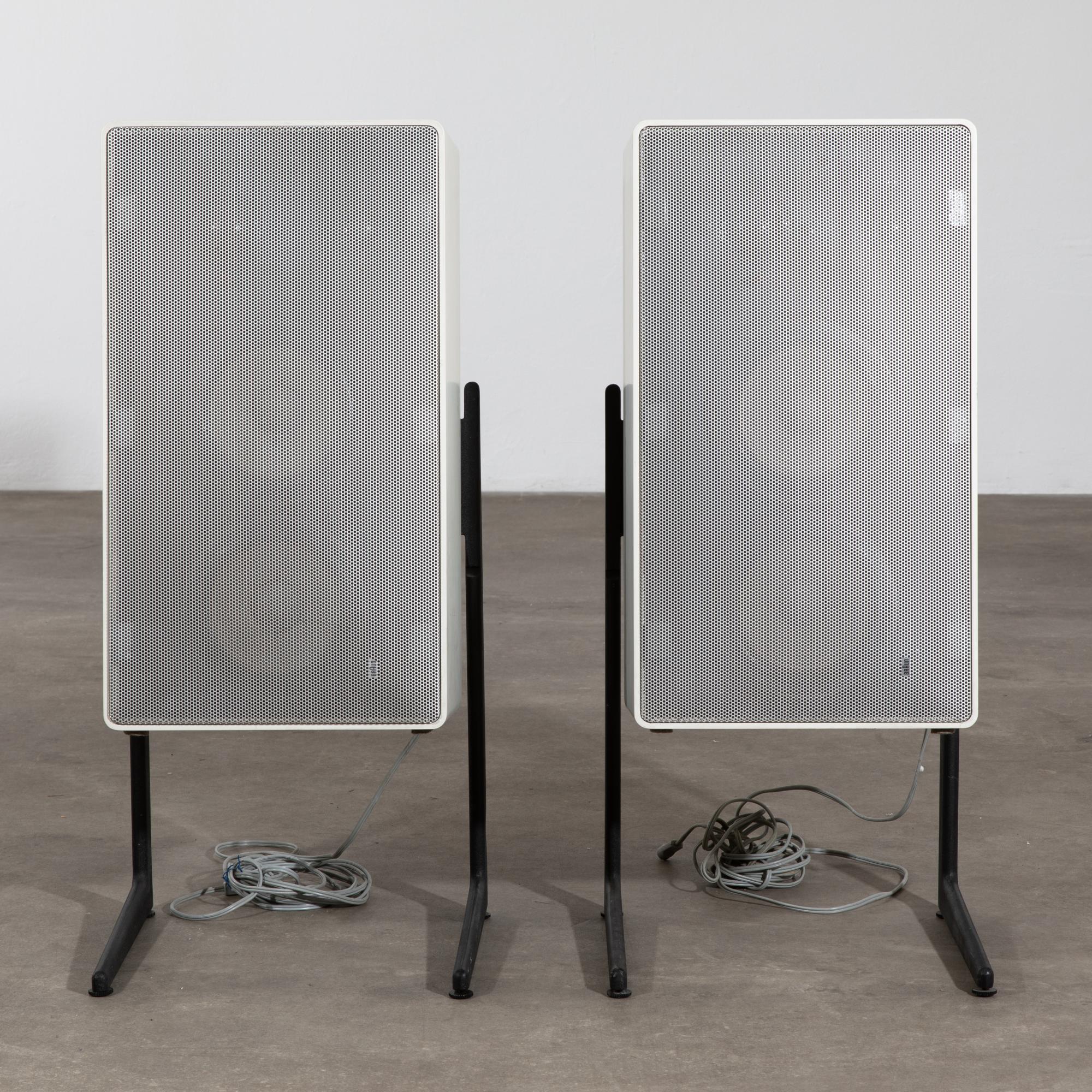 Entwurf 1973. Ausführung Braun AG. Weiß lackiertes Holz, Lochblech, Beine aus Aluguss mit Oberfläche in Schrumpflack. Boxen: 55,5 x 31 x 25 cm. Beine: 52 x 31 x 7 cm. Mit Typenschild bezeichnet.