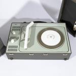 Allgemein guter Zustand mit altersgemäßen Gebrauchsspuren. An der Unterkante ist der Bezug ein wenig eingerissen. Der Tonarm wurde geklebt, die Nadel ist defekt. Der Ton wird übertragen. Die Funktion wurde getestet, wobei die Funktion nicht garantiert oder gewährleistet werden kann.