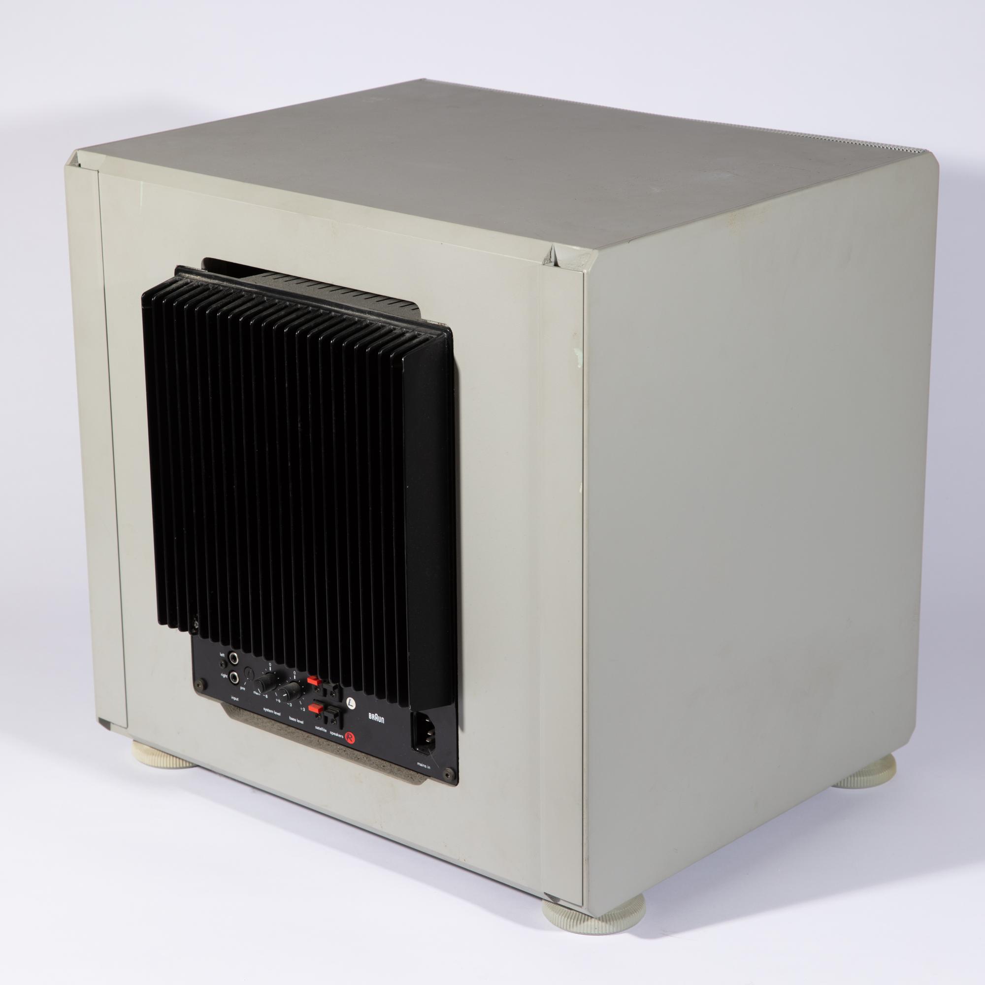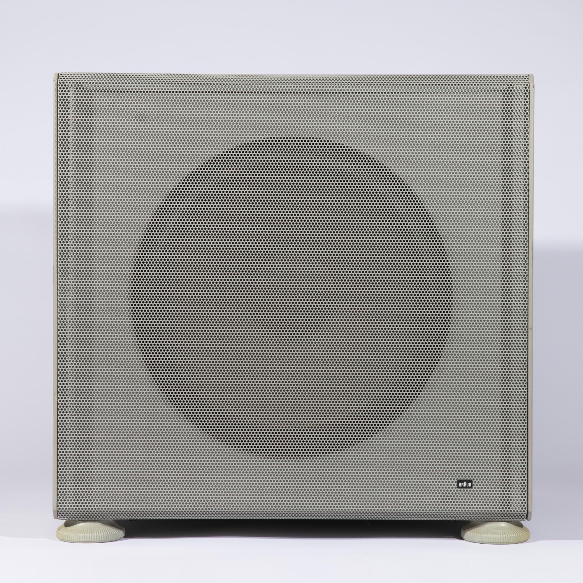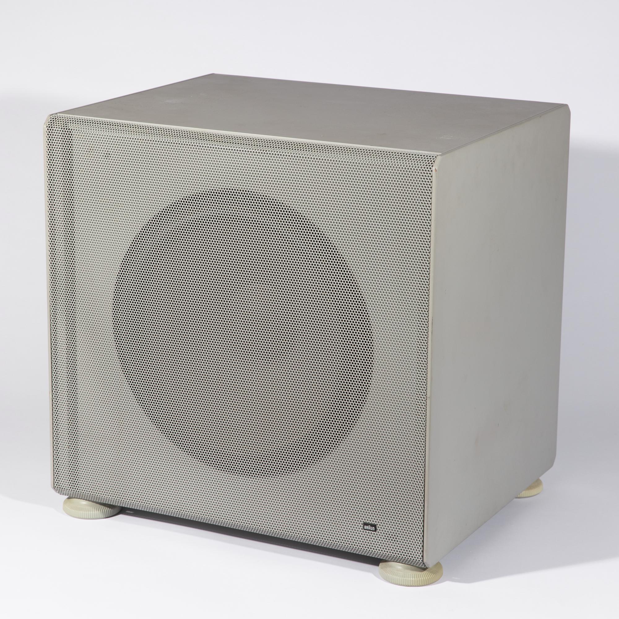 Entwurf 1983. Ausführung Braun AG. Grau und schwarz lackiertes Metall, Lochblech, Kunststoff. 43,5 x 44,5 x 40 cm. Bezeichnet.