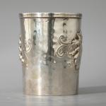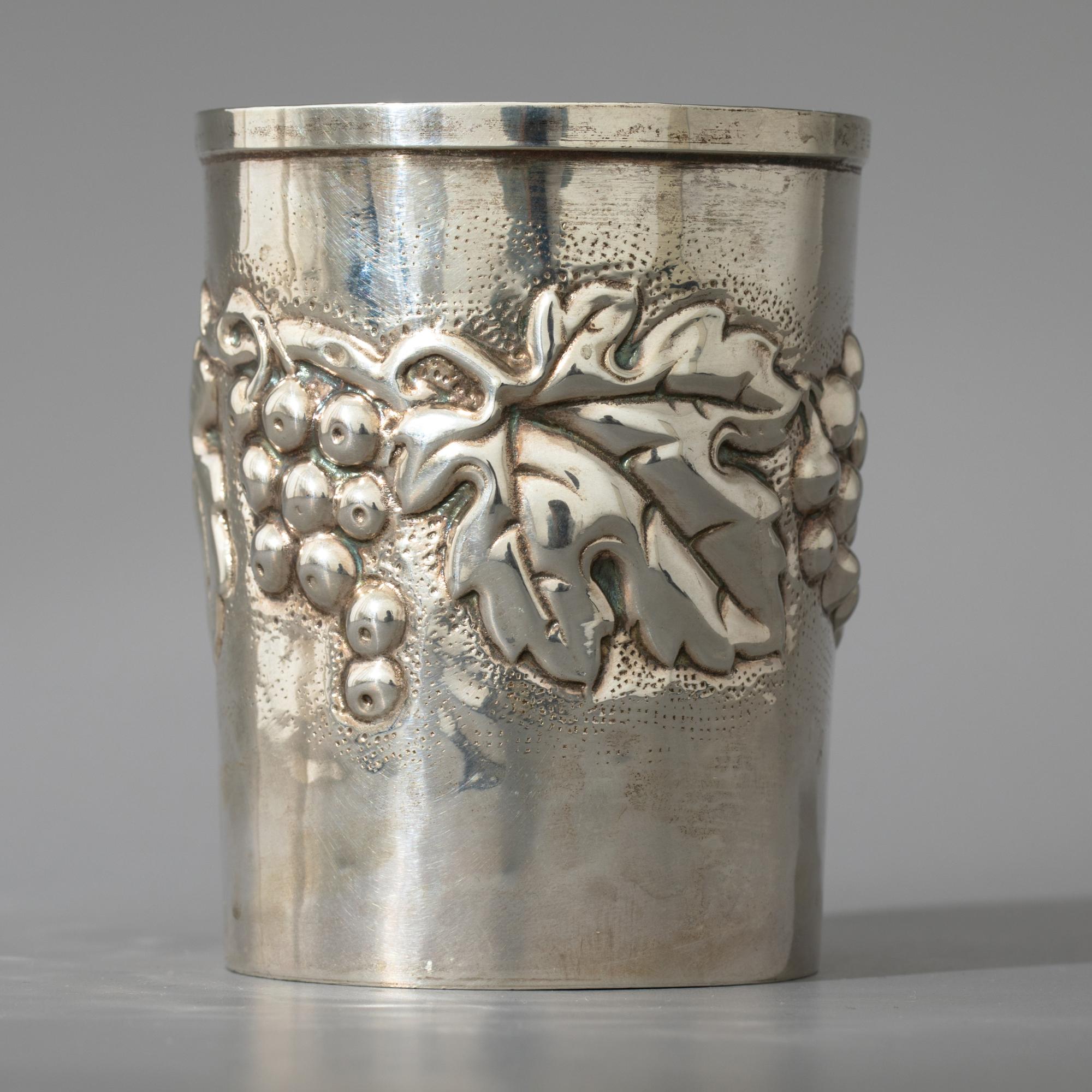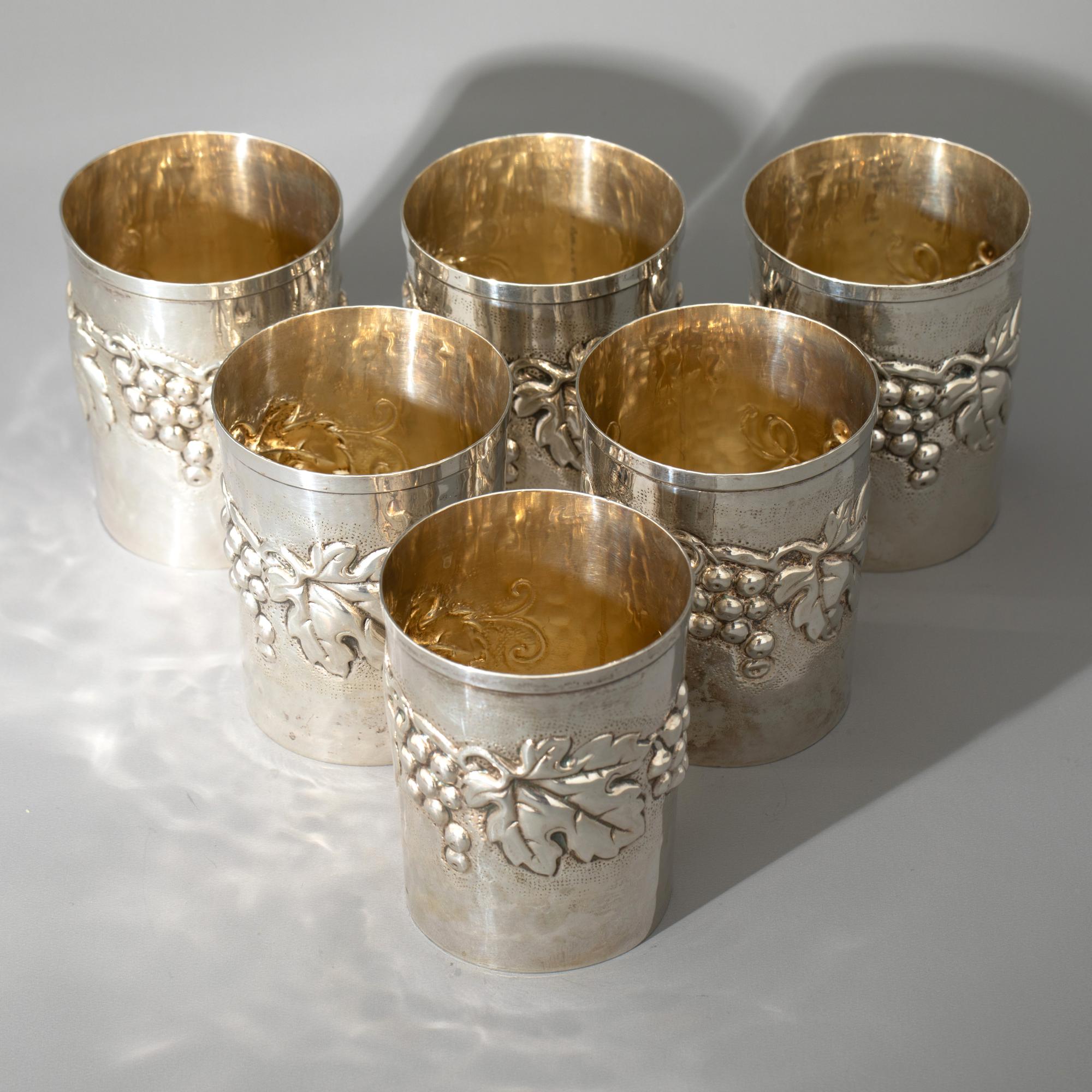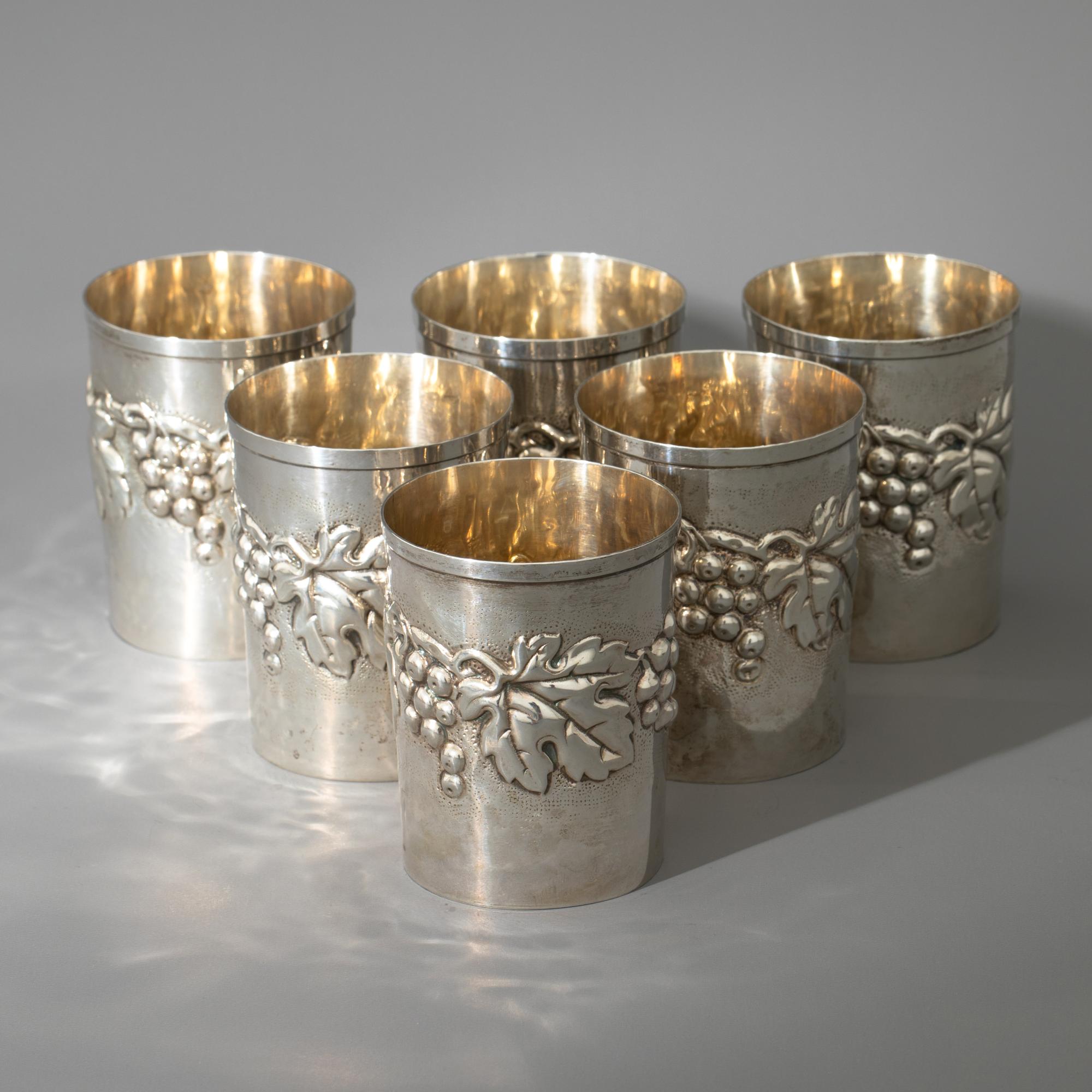 800er Silber, Florenz. Becher mit Weinlaub-Dekor. H. 9 cm, D. 7,1 cm. Gewicht 598 g. Bezeichnet: Lav. a mano, 800, 665 FI. (6)