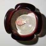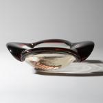 Überfangglas, fablos, partiell violett mit eingeschmolzenem Fisch in weißem und rotem Glas mit Goldfolie. 6 x 19,3 x 20 cm.