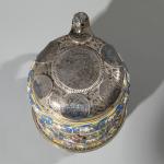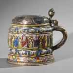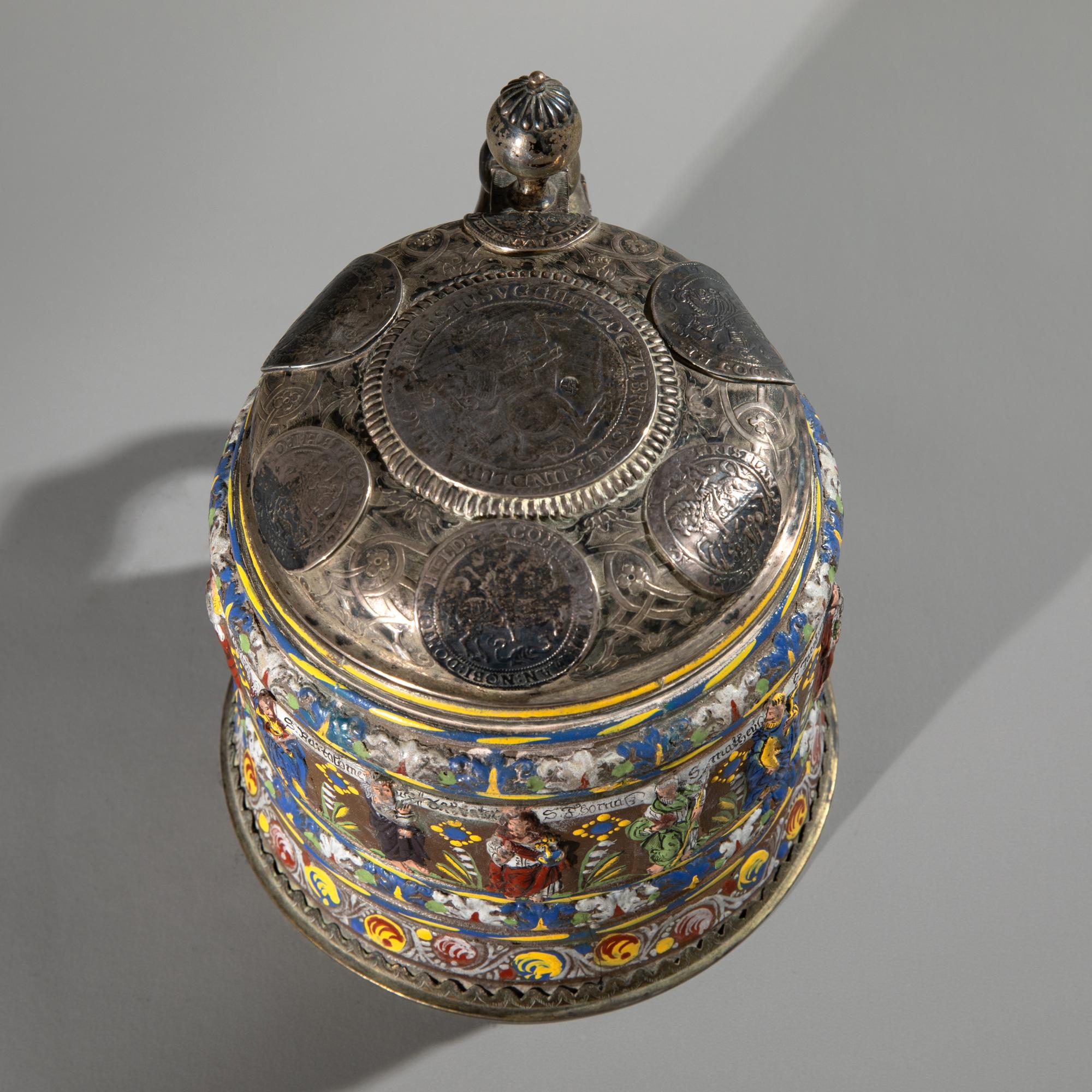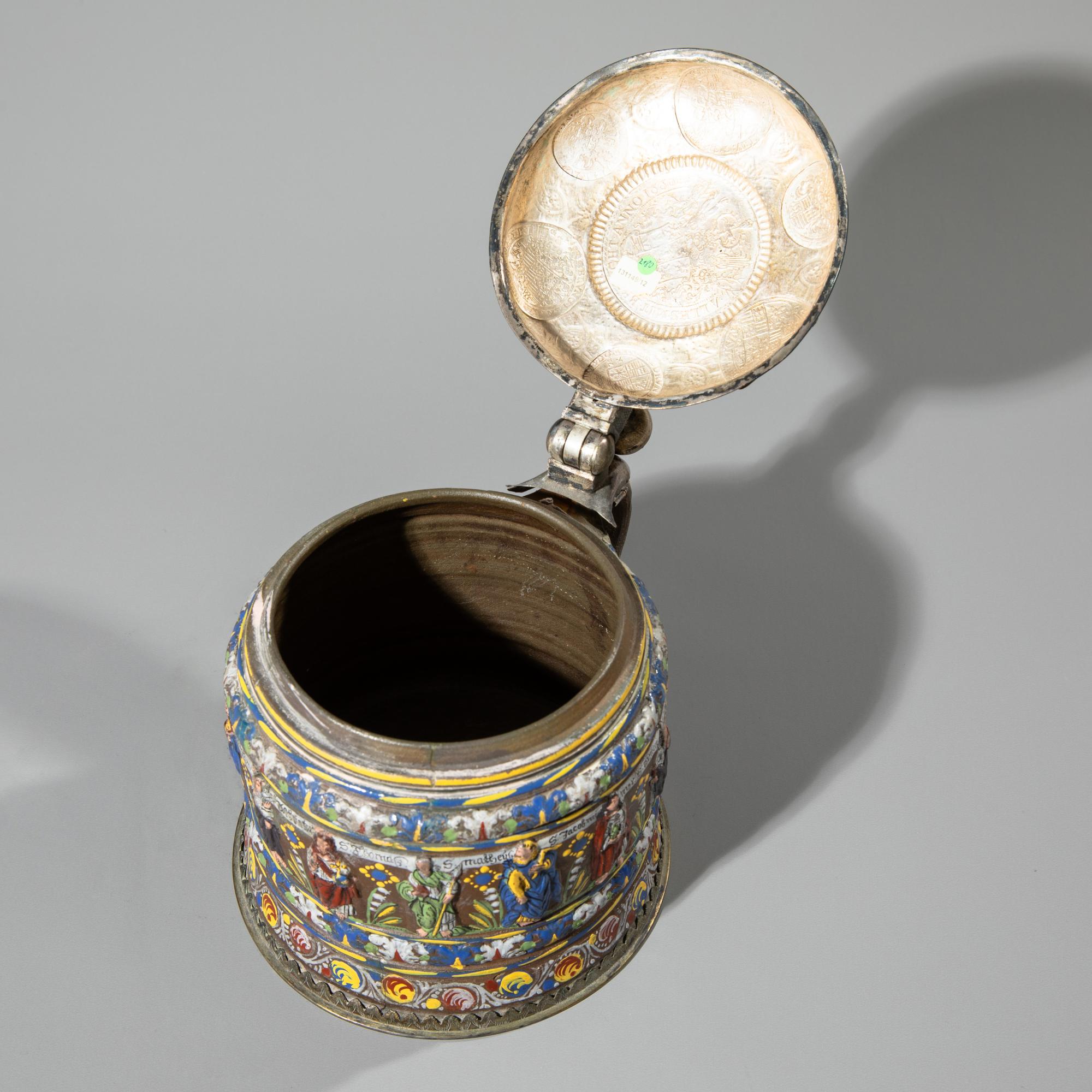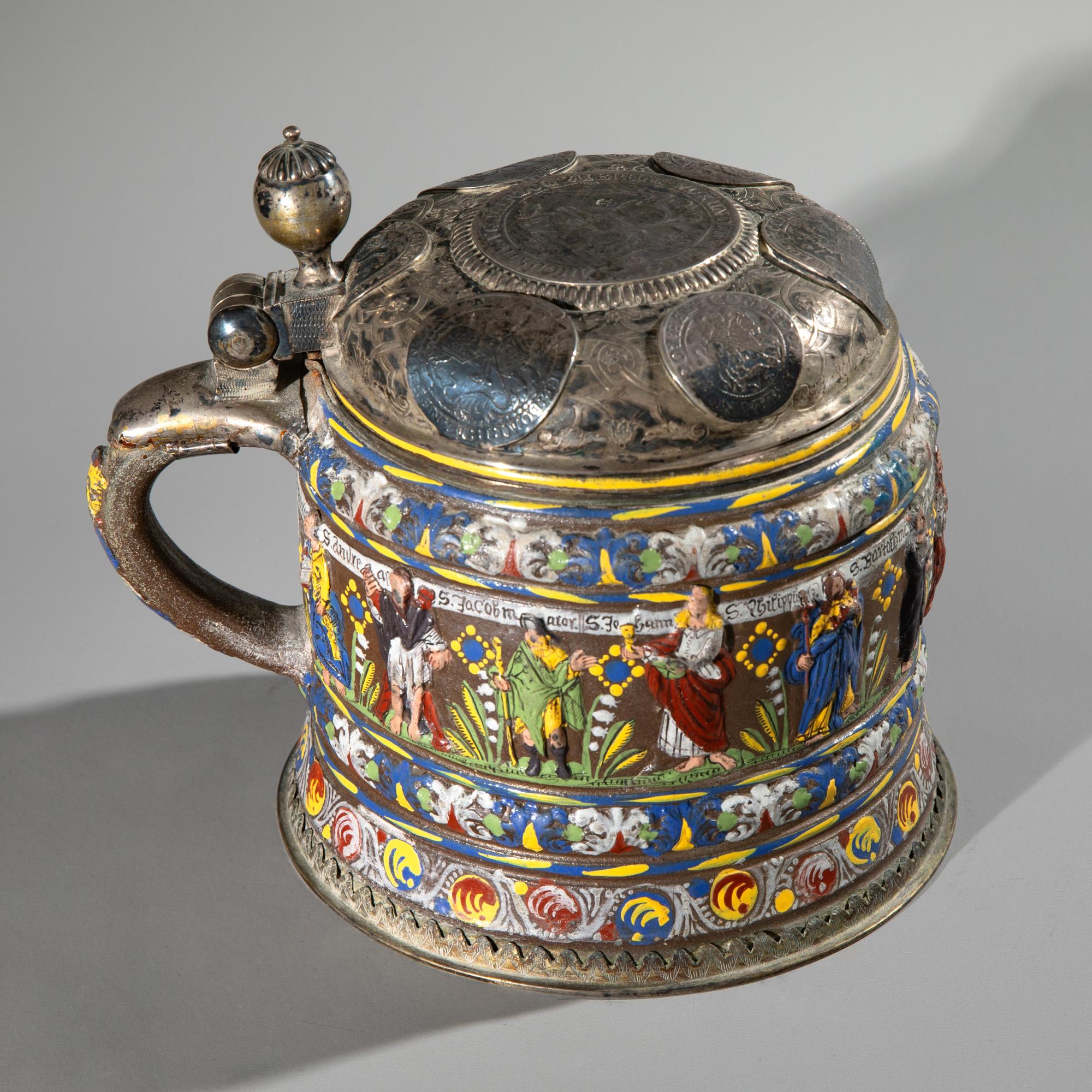Braunes, salzglasiertes Steinzeug mit polychromen Emaildekor. Münzdeckel aus Silber.Zwischen Wulstringen mit Reliefornament die zwölf Apostel auf Rasensockel, zwischen ihren großen Maiglöckchen. Über ihnen weißes Schriftband mit den jeweiligen Namen. Unter dem Henkel datiert 1667. Unterer Rand zusätzlich mit einem gezackten Silberband eingefasst. Silberdeckel undeutlich gemarkt. Daumenrast mit Resten eines gravierten Allianzwappens.