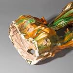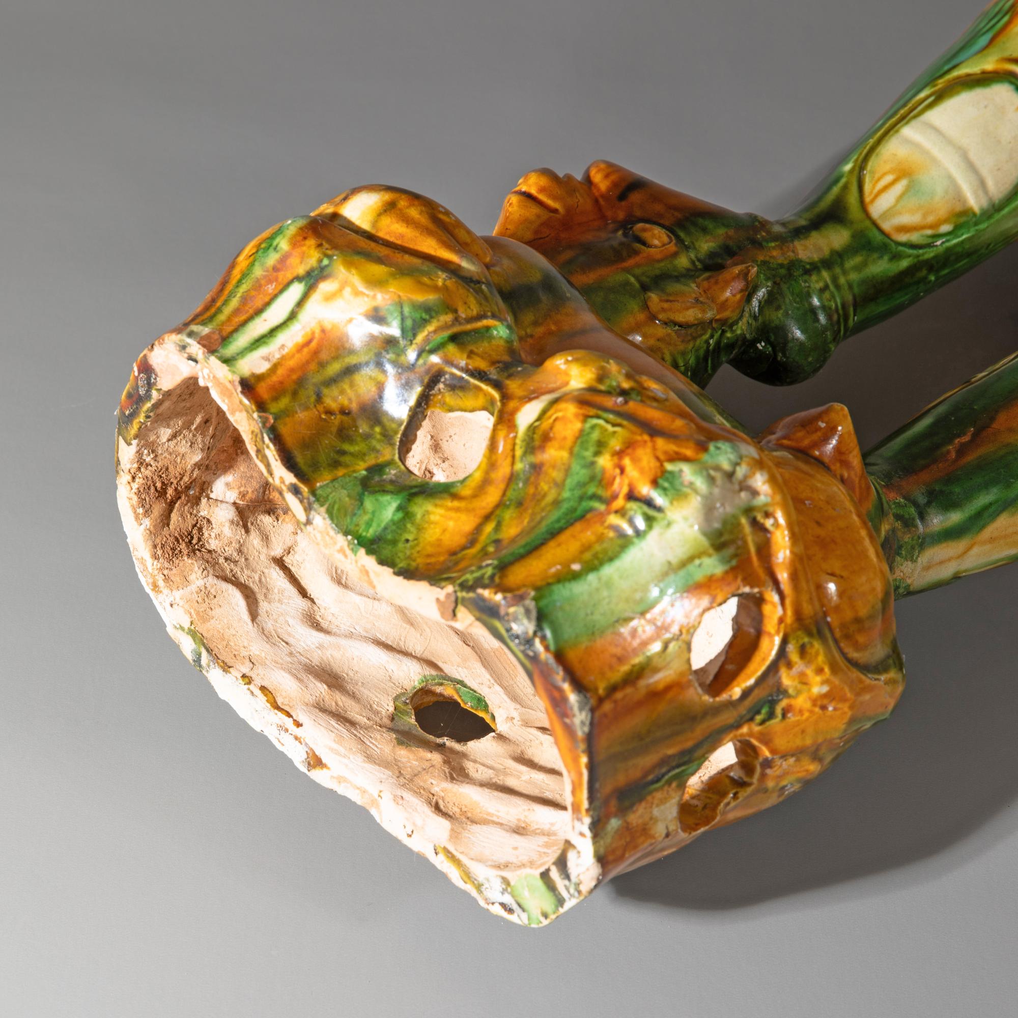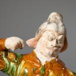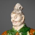 um ursprünglich einen Bogen zu halten, die des anderen Wächters vor den Bauch ausgestreckt, um eine Lanze zu halten. Die unglasierten Gesichter mit grimmigem Ausdruck. Beide Wächter in eine mit Ornamenten geschmückte Rüstung gekleidet. Heller Irdenwarenscherben mit grüner, brauner und strohfarbener, sehr fein gesprüngelter sancai-Glasur. H. je 80 cm.