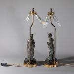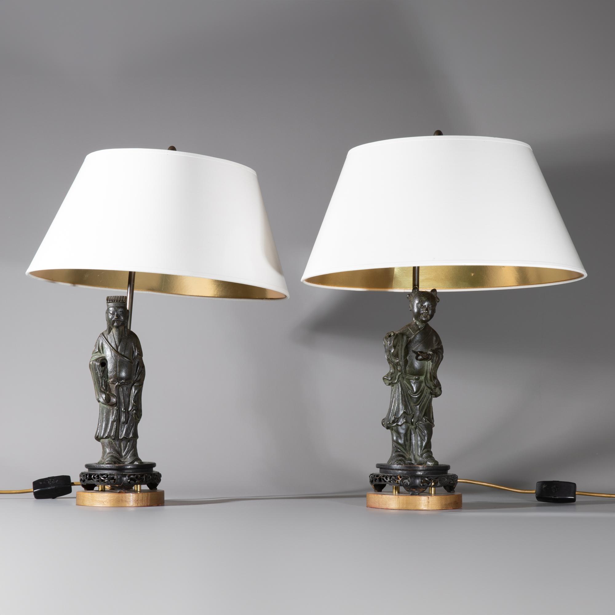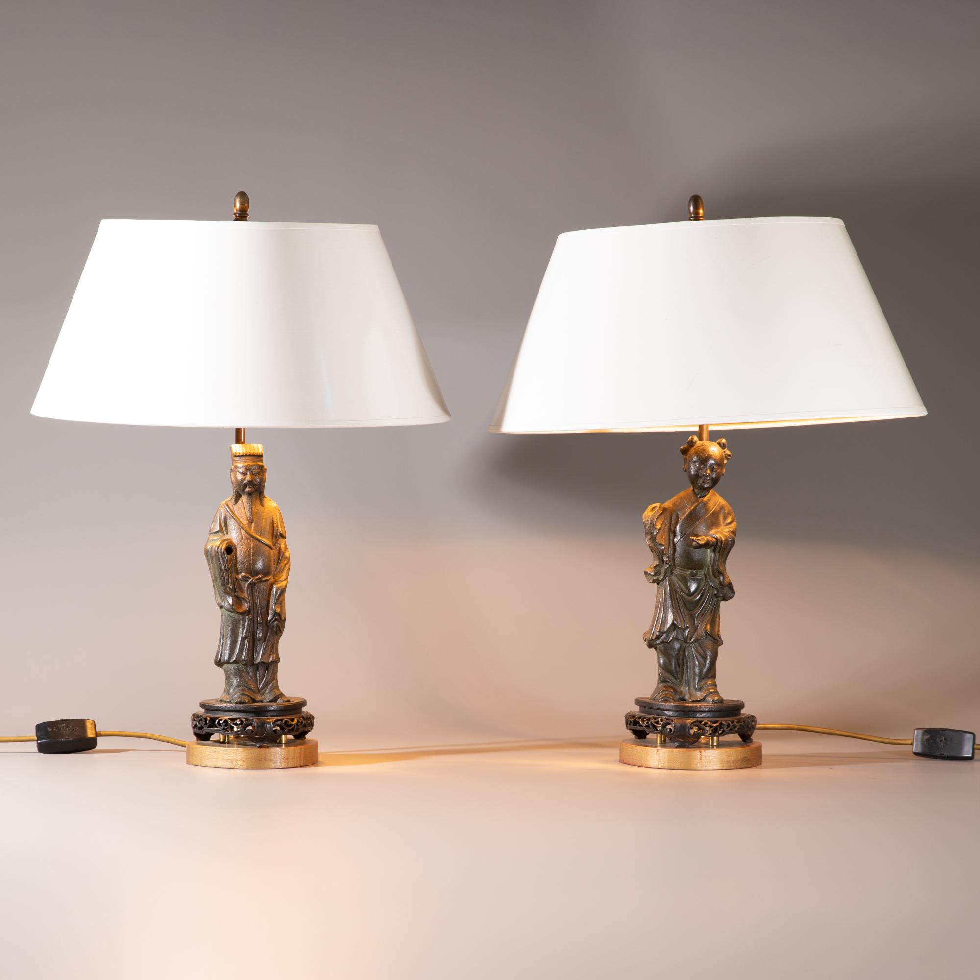 Beide Figuren in lange, faltenreich herabfallende gegürtete Gewänder gekleidet. Dargestellt sind Lü Dongbin, als Gelehrter mit langem Bart und magischem Schwert, sein anderes Symbol der Fliegenwedel fehlt, sowie He Xiangu mit Mundorgel, hier fehlt das zusätzliche Attribut der Lotosblüte. Beide Figuren auf durchbrochen geschnitztem chinesischen Holzsockeln stehend. Neuzeitlich als Leuchten montiert.