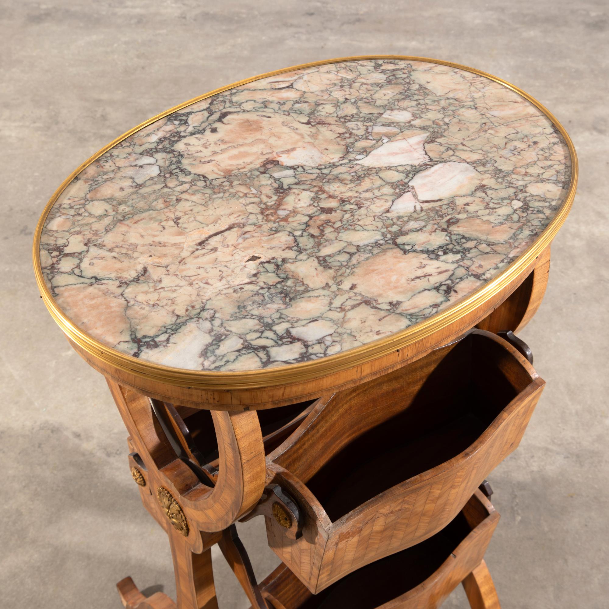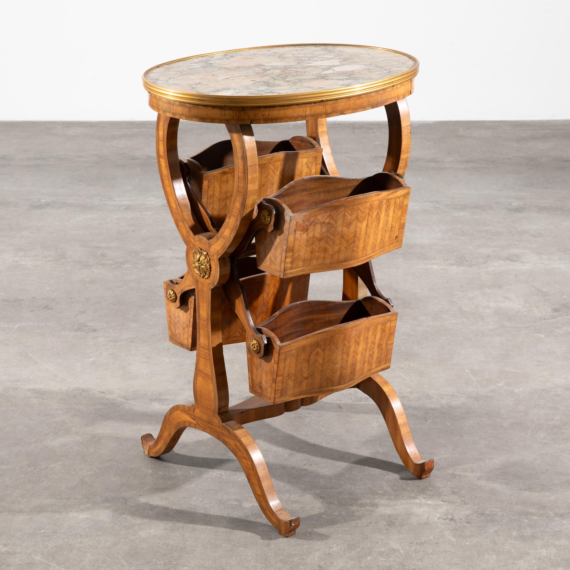 mit vier kastenartigen Fächern für die Aufnahme von Arbeitsutensilien. Die von einer Messingleiste eingefasste ovale Deckplatte aus Beige- und in unterschiedlichen Rottönen gemaserten, sog. Breche d'Alep Marmor. Allseitig gerahmte filetartige Furnierfelder. Rosetten aus vergoldeter Bronze. 83 x 56,5 x 41 cm.