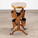 Mahagoni auf Weichholz furniert. Von zwei geschweiften Seitenwangen mit Brückenbeinen eingefasster, drehbarer Mechanismus in der Art eines Mühlrads