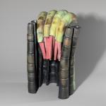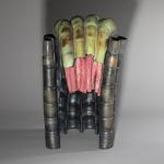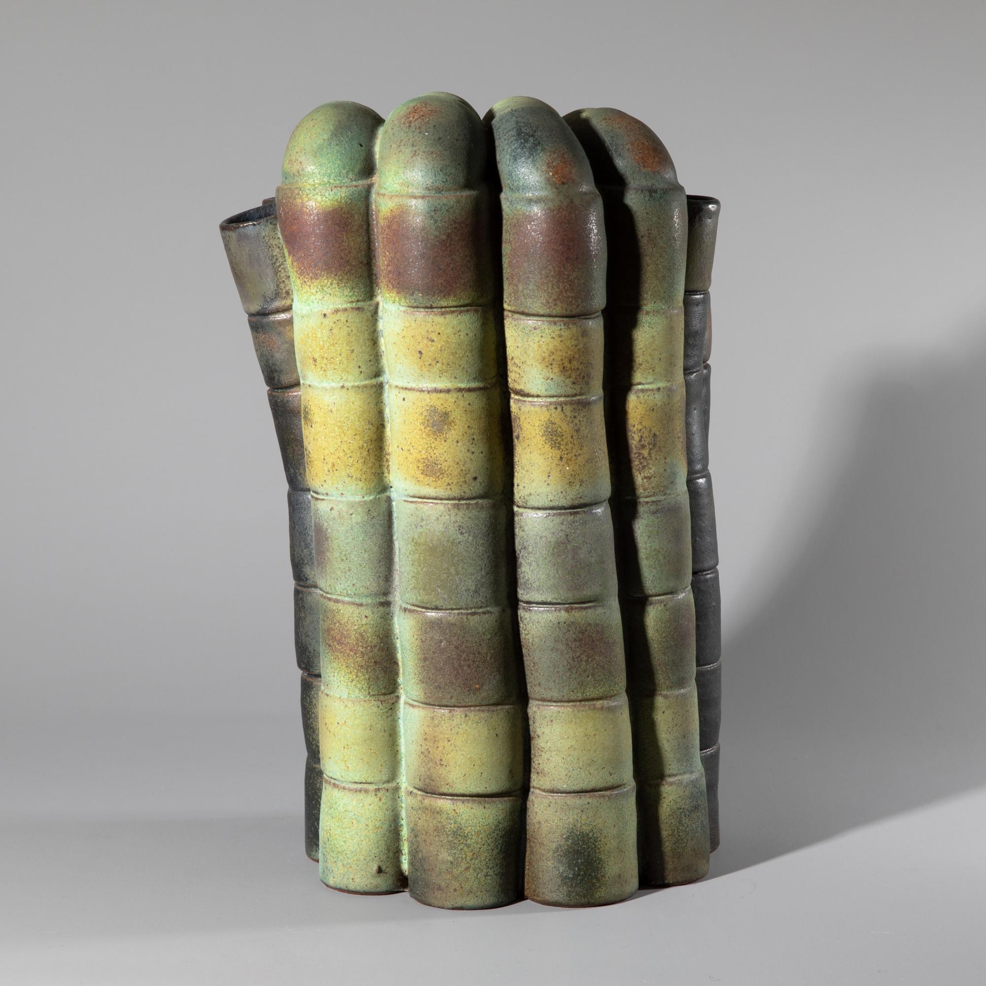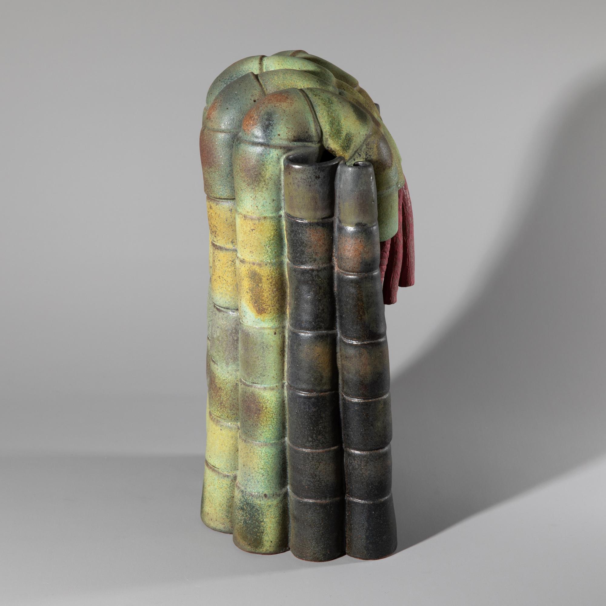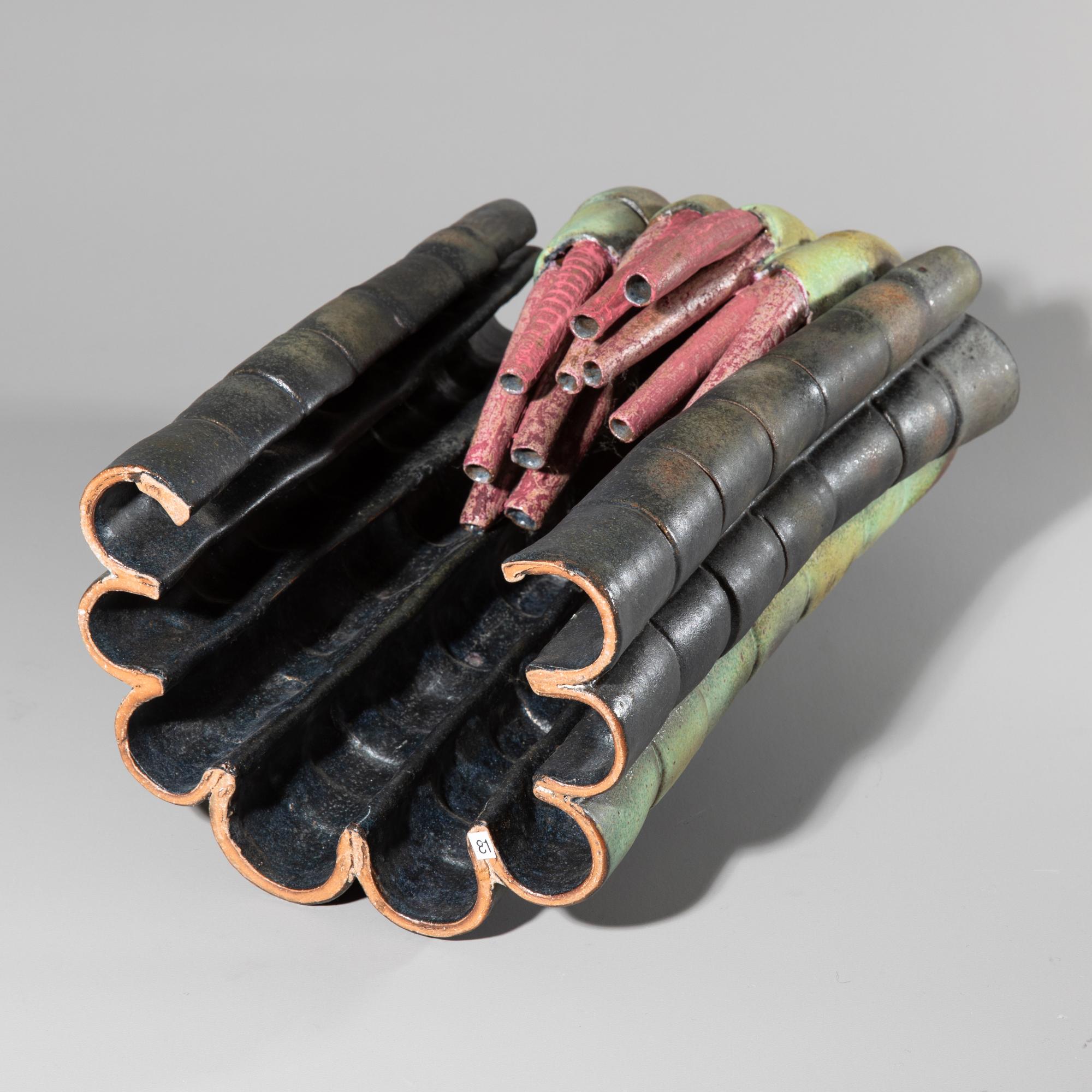 Keramik, mehrtonig in Braun, Rot und Grün glasiert. Montiert aus großen Halbröhren und kleineren Röhrenelementen. 37 x 20 x 17 cm. Guter Zustand.