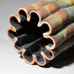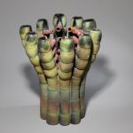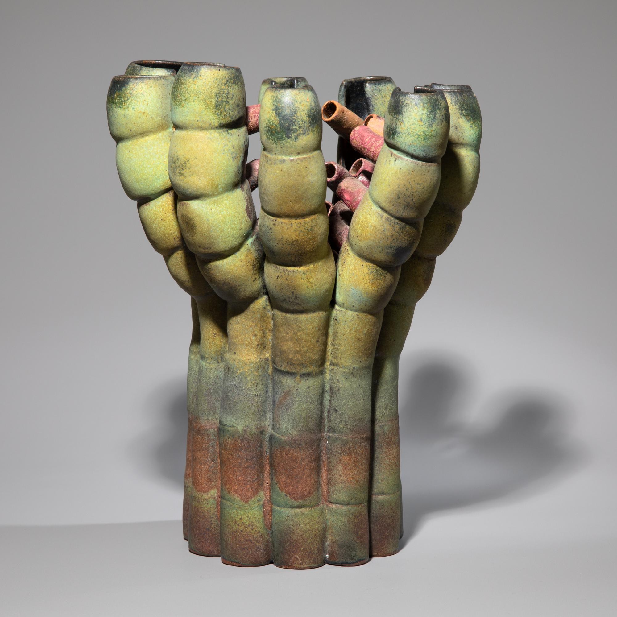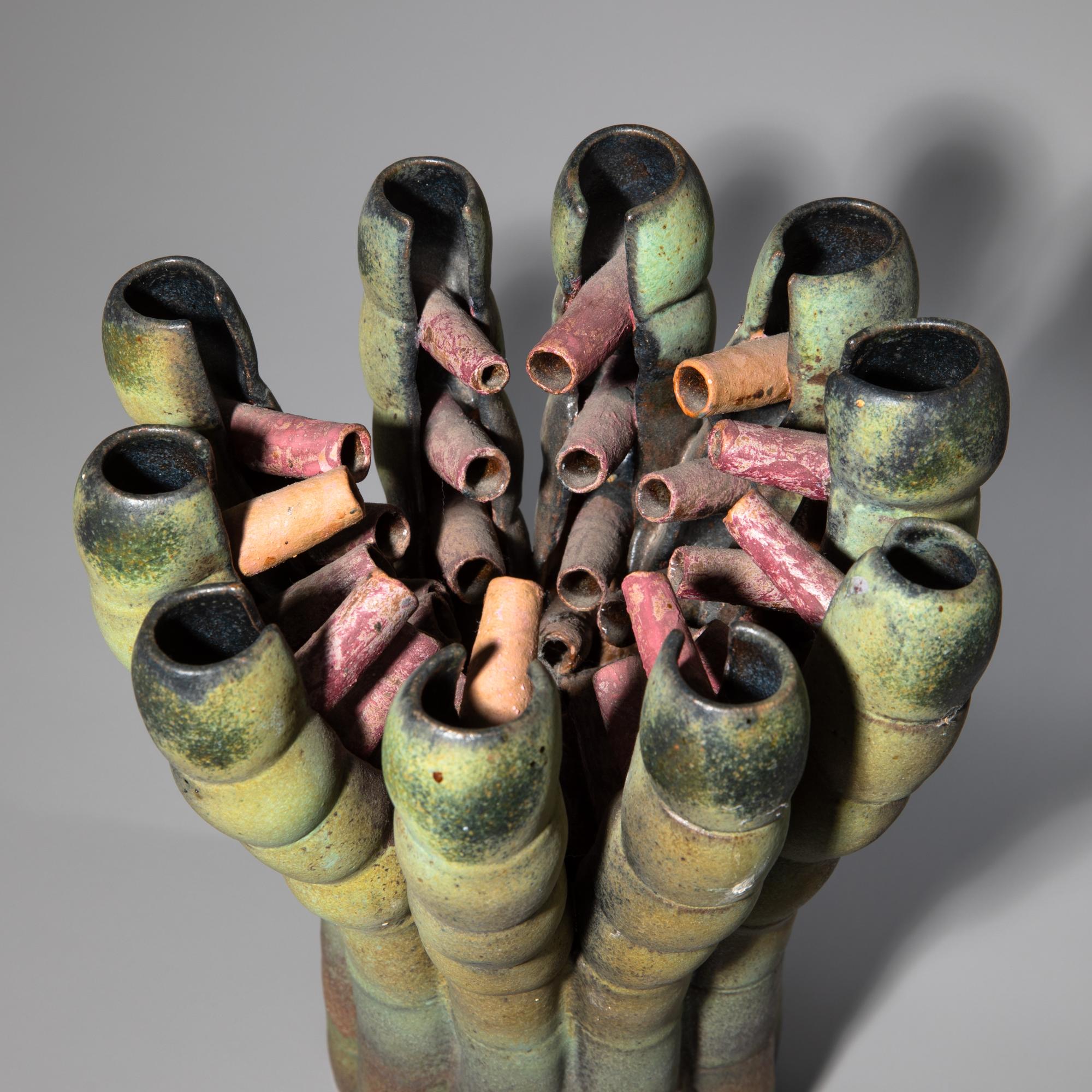 Keramik, mehrtonig in Rot und Grün glasiert. Aus Hohlkörpern und Röhren montiert. 30,5 x 24 x 23,5 cm.