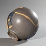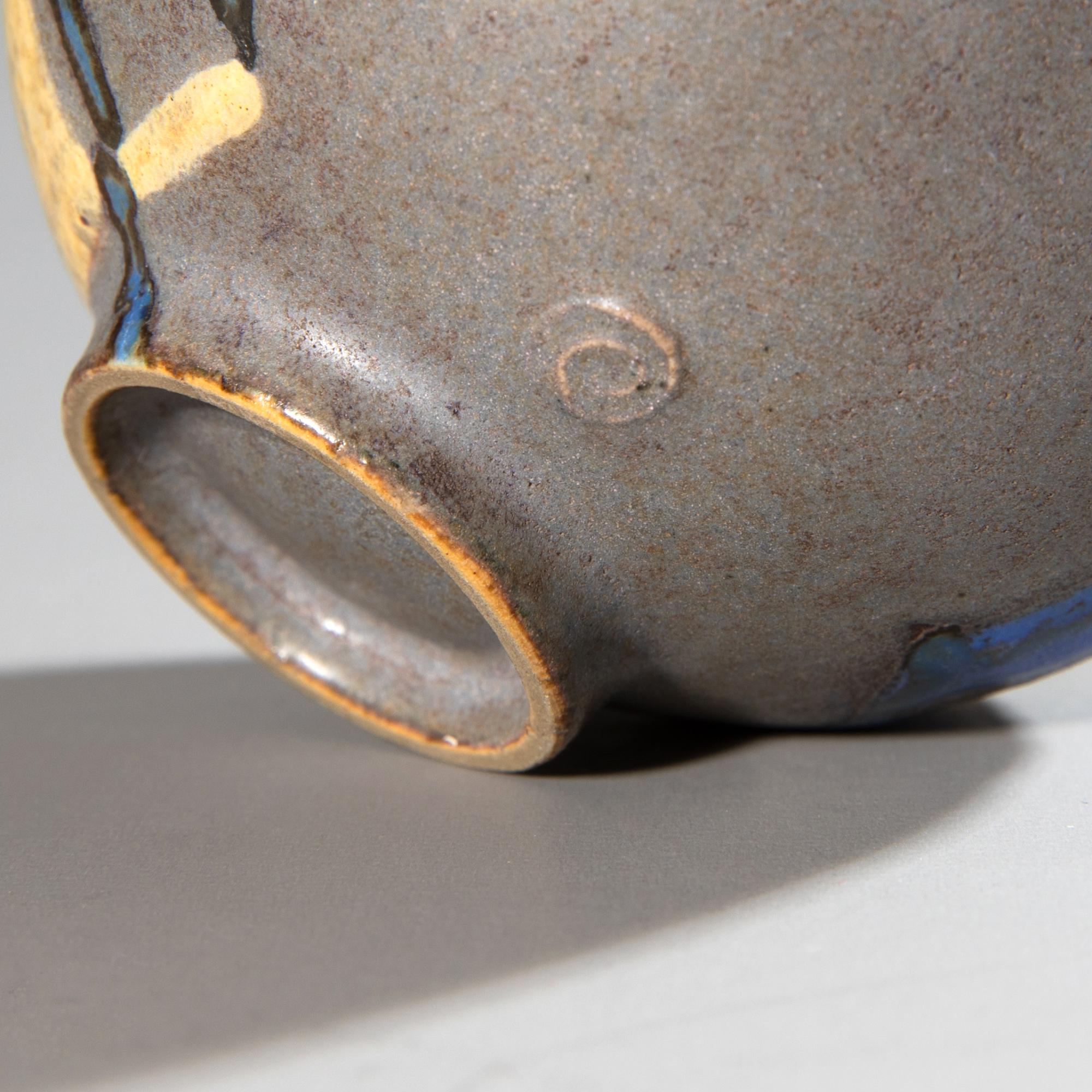 Keramik. Kleines Kännchen auf rundem Stand, in Blau-, Gelb- und Grautönen glasiert und partiell schwarz konturiert. H. 7,5 cm. Bezeichnet mit Werkstattmarke.
