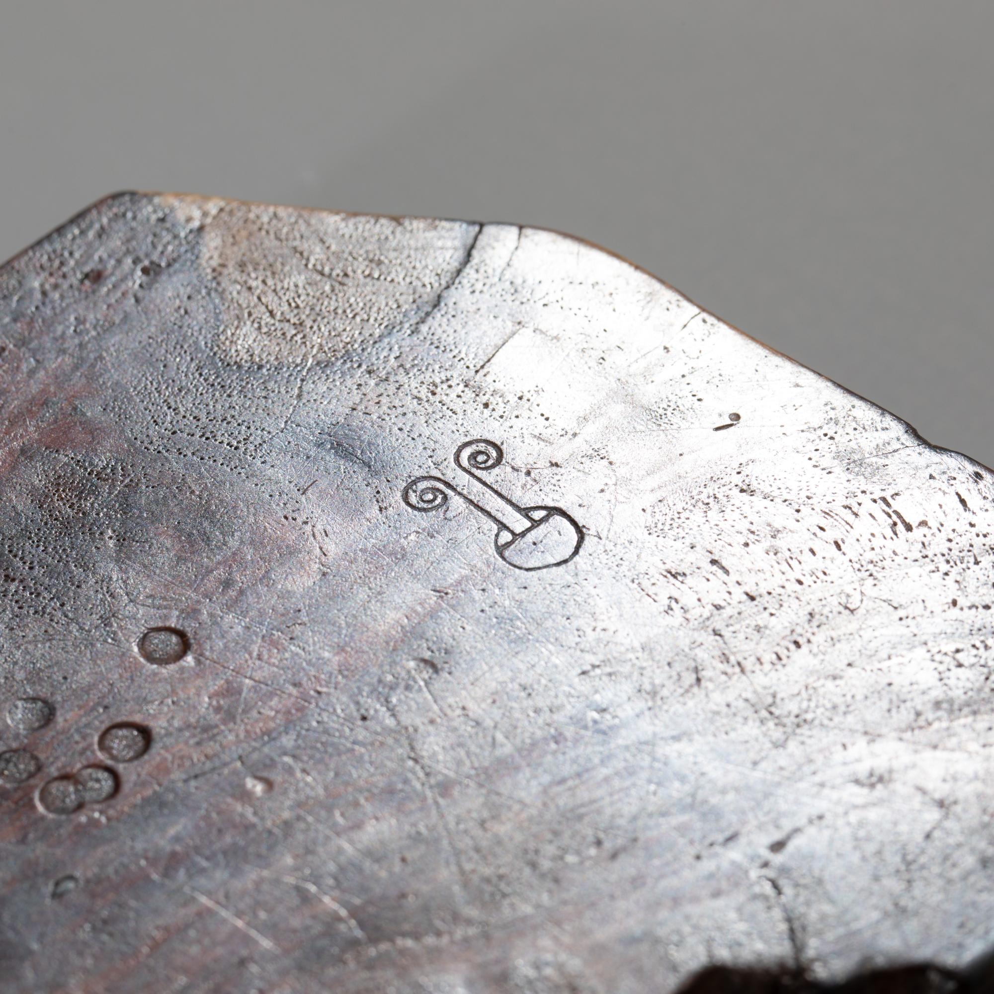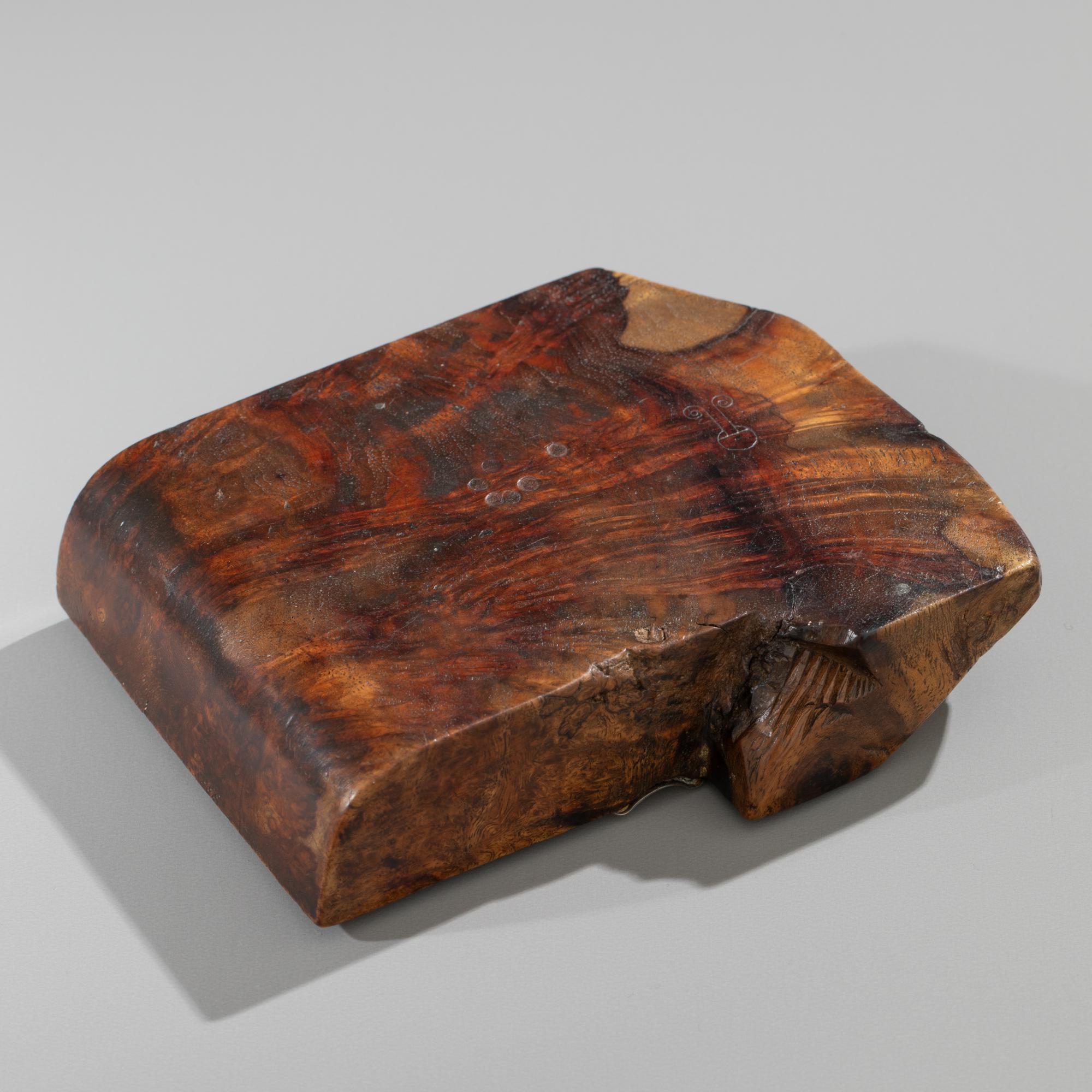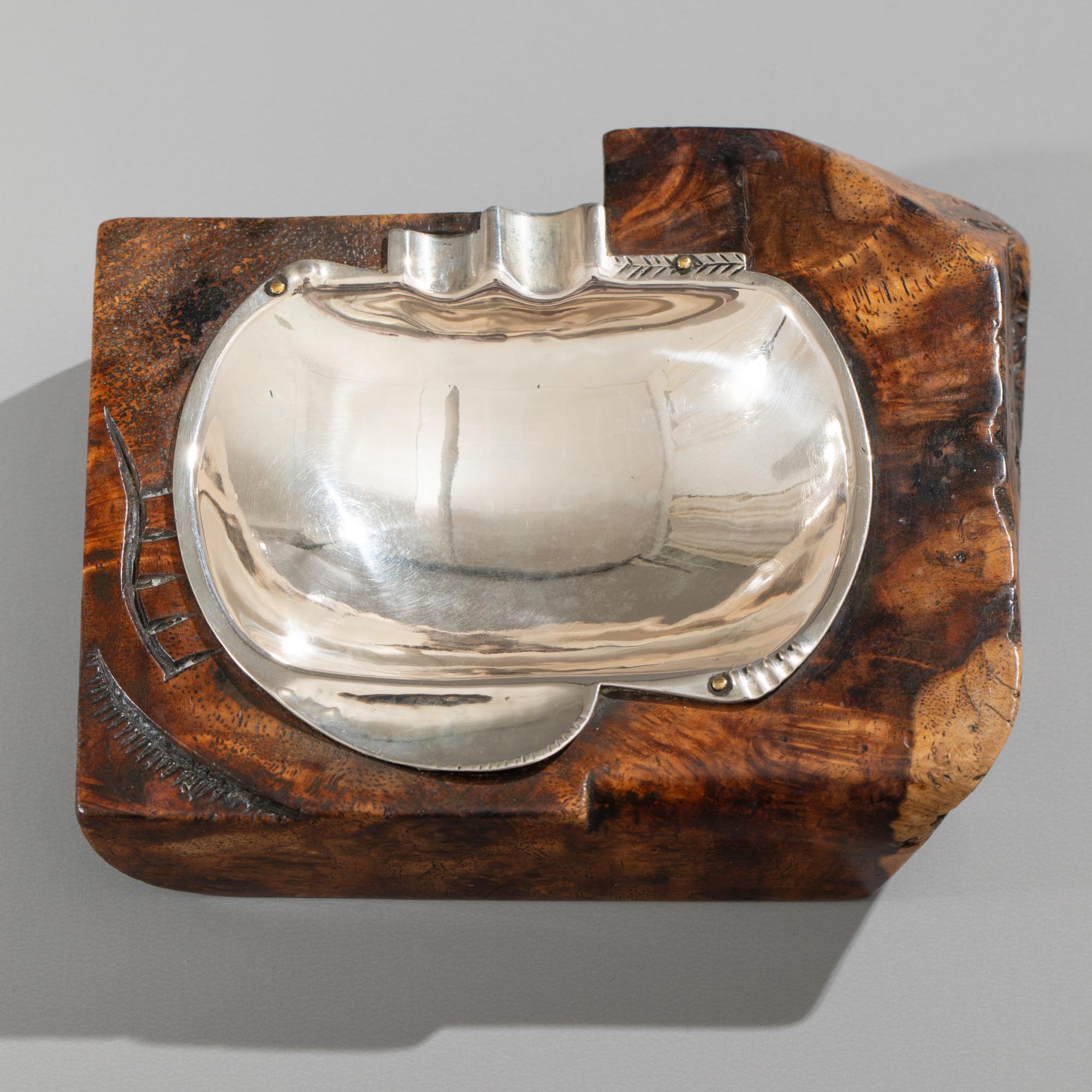 Entwurf Bernhard Hoetger. Um 1928 als Einzelstück ausgeführt in den Werkstätten 'Zu den 7 Faulen' im Paula-Modersohn-Haus in der Böttcherstraße in Bremen. Die Silberarbeit wurde vom Silberschmied Franz Bolze ausgeführt. Der Aschenbecher zeichnet sich durch die außergewöhnliche Kombination aus Silber und Wurzelholz aus. Die glänzende, geschwungene Silberschale mit seitlichen Ausbuchtungen ist in einen teils gekanteten, teils organisch geformten Wurzelholzblock eingelassen. 3,5 x 13,5 x 11,2 cm. Unterseitig ist das Objekt mit dem Signet der Werkstätten 'Zu den sieben Faulen' bezeichnet.