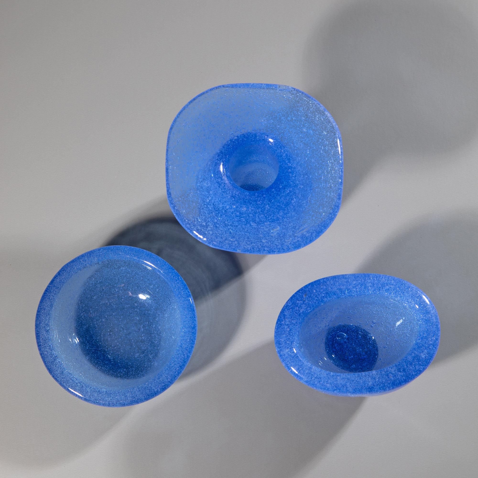 Entwurf um 1925. Ausführung Venini, Murano. Überfangglas, farblos und hellblau mit Blaseneinschlüssen. H. 3 - 8,6 cm. Jeweils am Boden bezeichnet: venini murano (Ätzstempel).