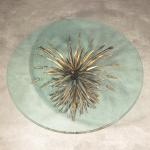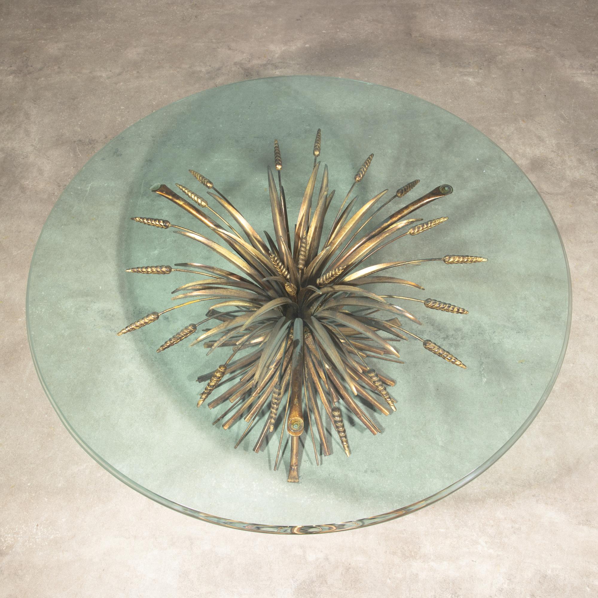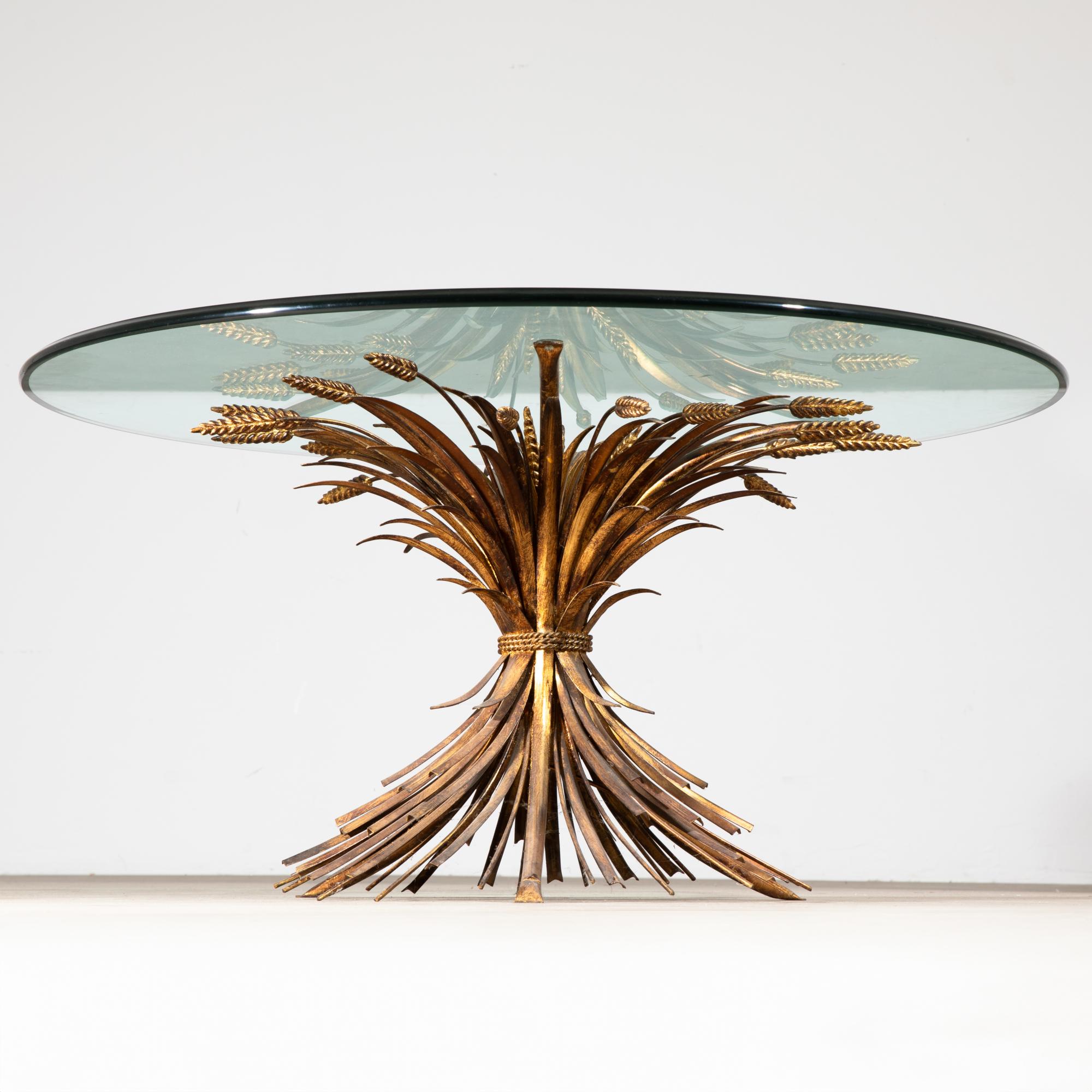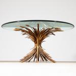 Untergestell in Form einer mit einer Kordel zusammengebundenen Weizengarbe. Glas, Metall, goldfarben gefasst und patiniert. H. 45 cm, D. 95 cm. Ein Tisch in dieser Art ist auf einer Fotografie aus den 1950er Jahren im Apartment von Coco Chanel in der Rue Cambon zu sehen.
