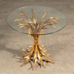 Untergestell in Form einer mit einer Kordel zusammengebundenen Weizengarbe. Glas, Metall, goldfarben gefasst und patiniert. H. 53 cm, D. 60 cm. Ein Tisch in dieser Art ist auf einer Fotografie aus den 1950er Jahren im Apartment von Coco Chanel in der Rue Cambon zu sehen.