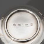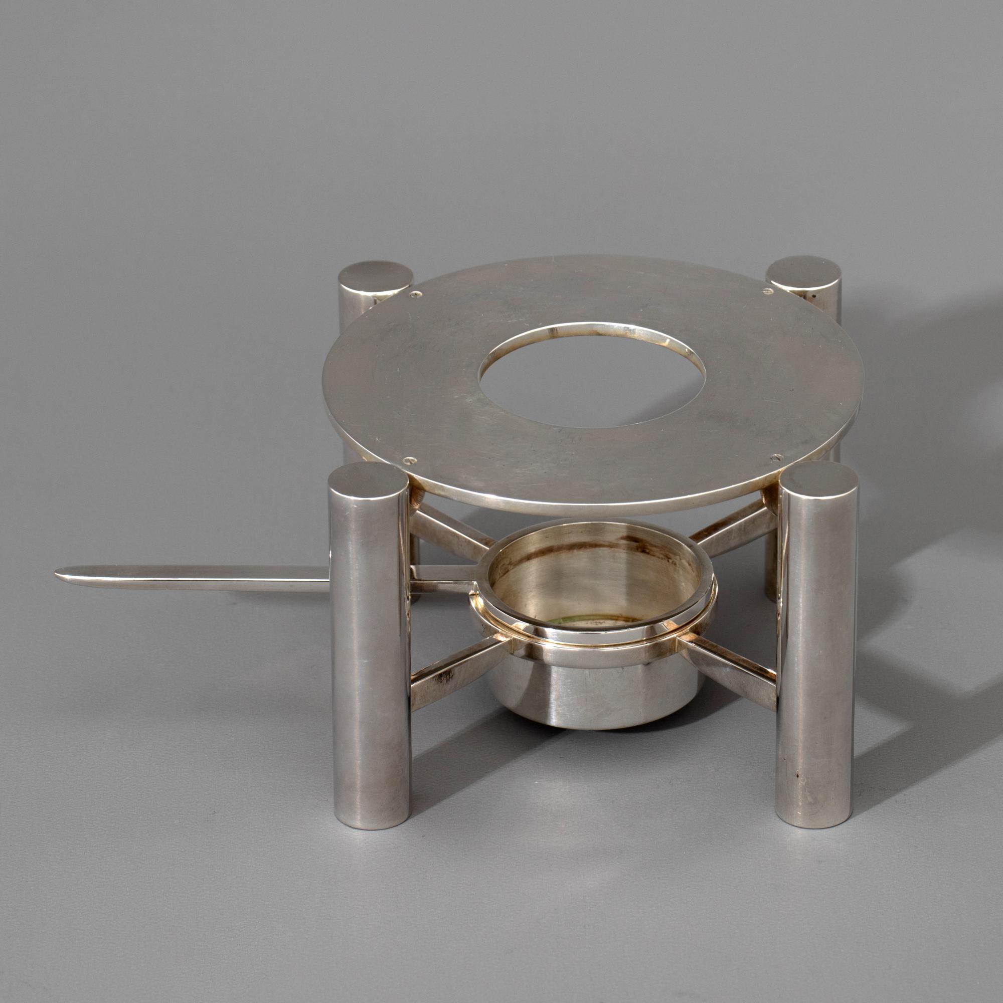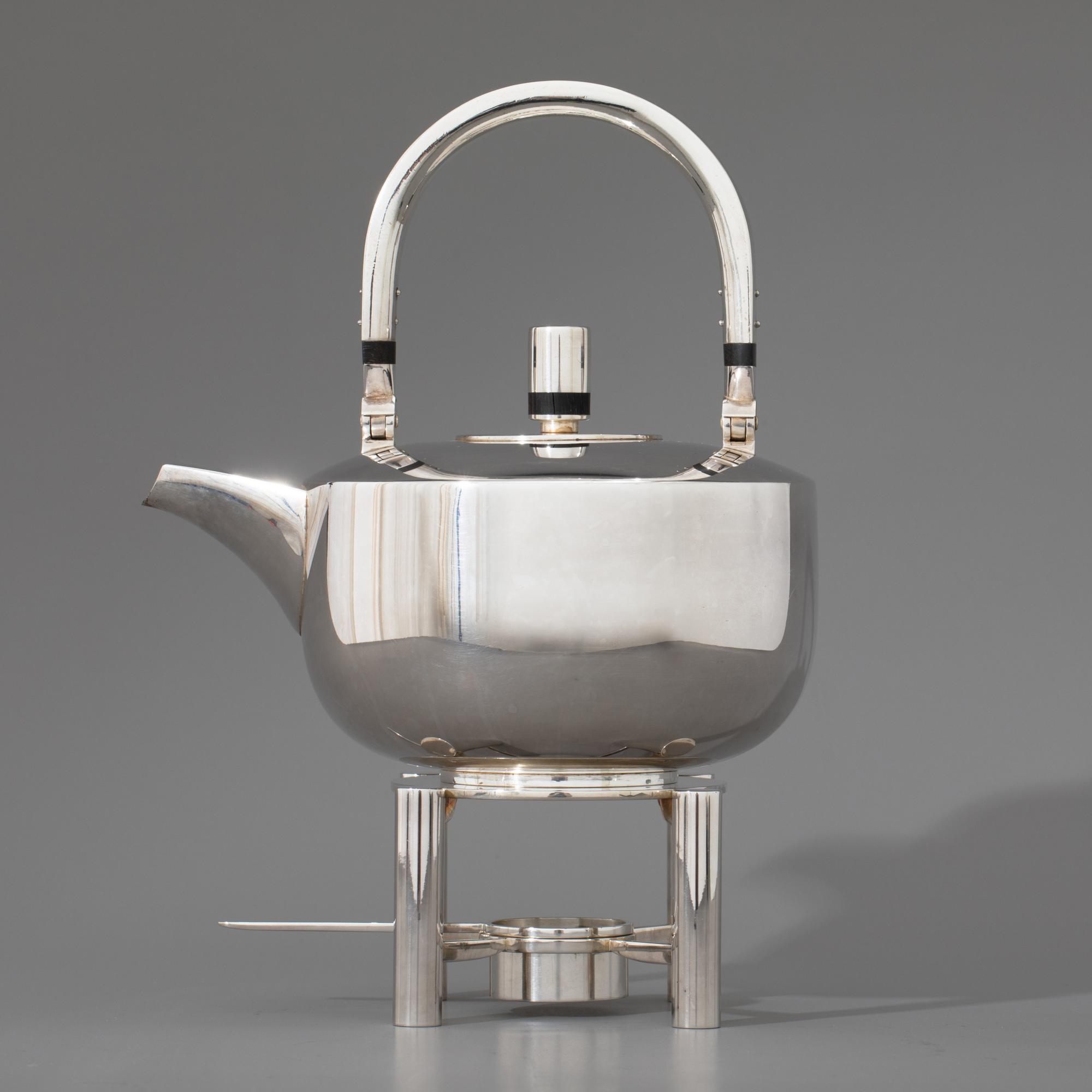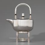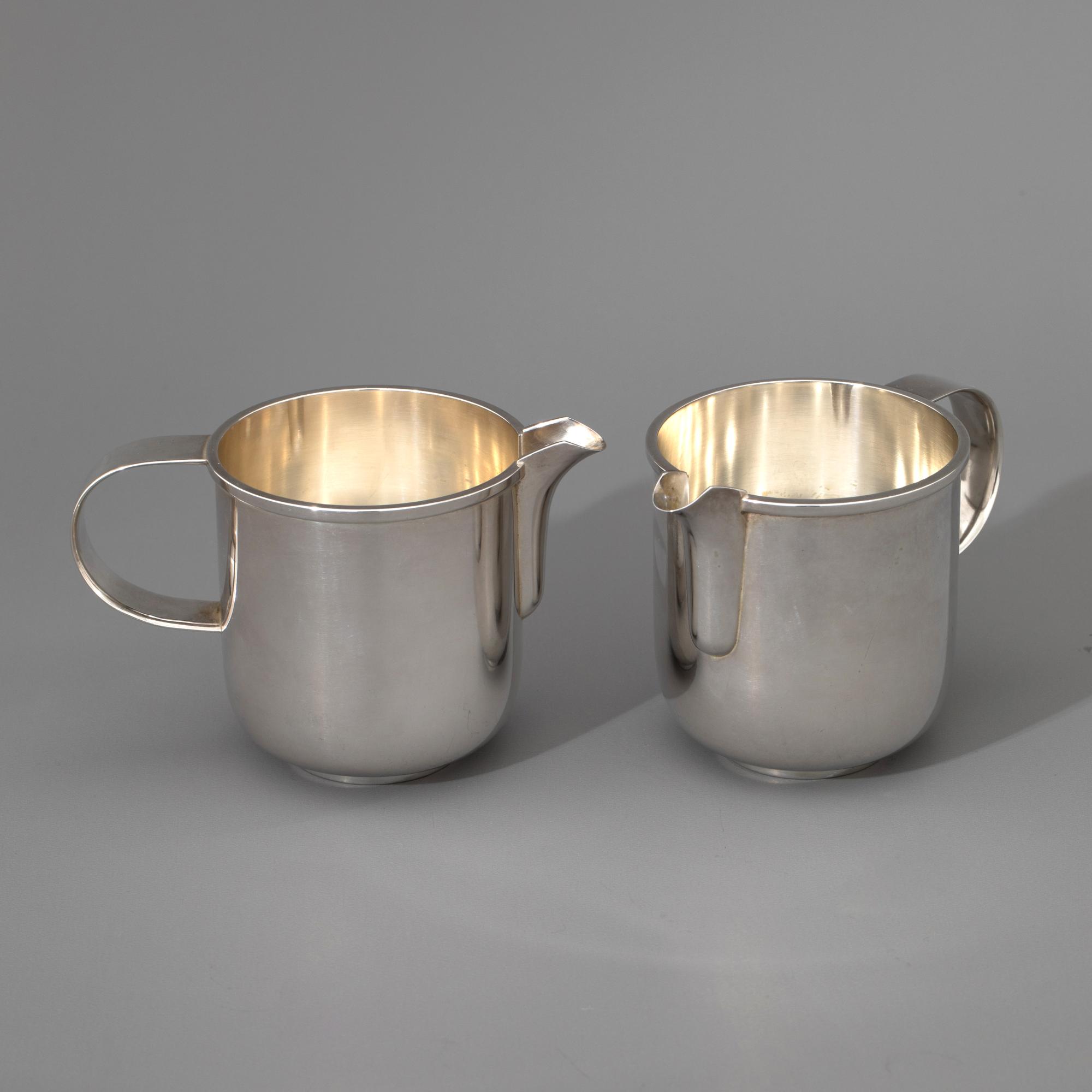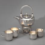 Sieben Teile. Teekanne auf Stövchen mit Brennpfanne, 2 Milchkännchen, 2 Zuckerschalen. Sterlingsilber. Insgesamt 1608 Gramm. Stövchen aus Metall (364 g). H. 20,5 cm + 6,8 cm, L. 12 cm / H. 7,8 cm / H. 6,3 cm; Gestempelt: Mond Krone 925, unterschiedliche Werkstattmarken.