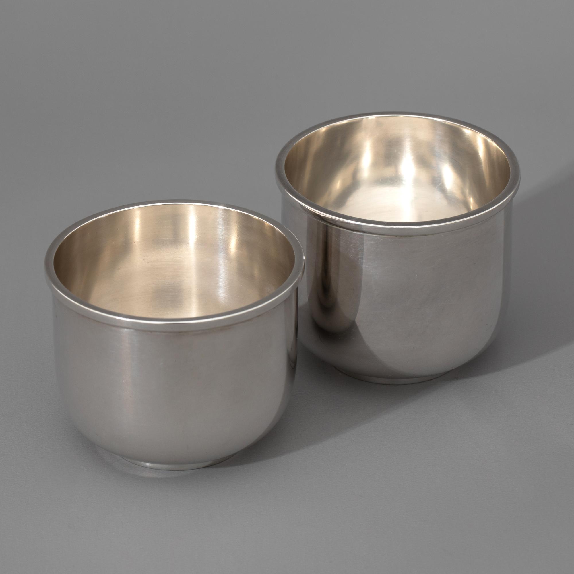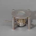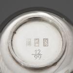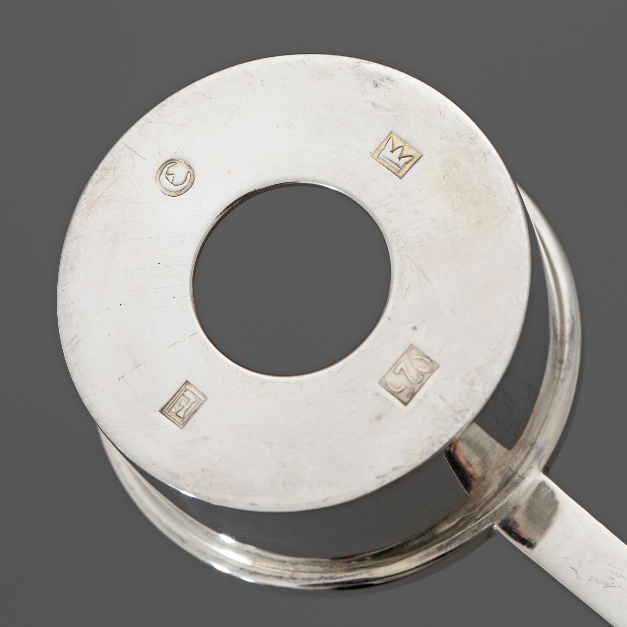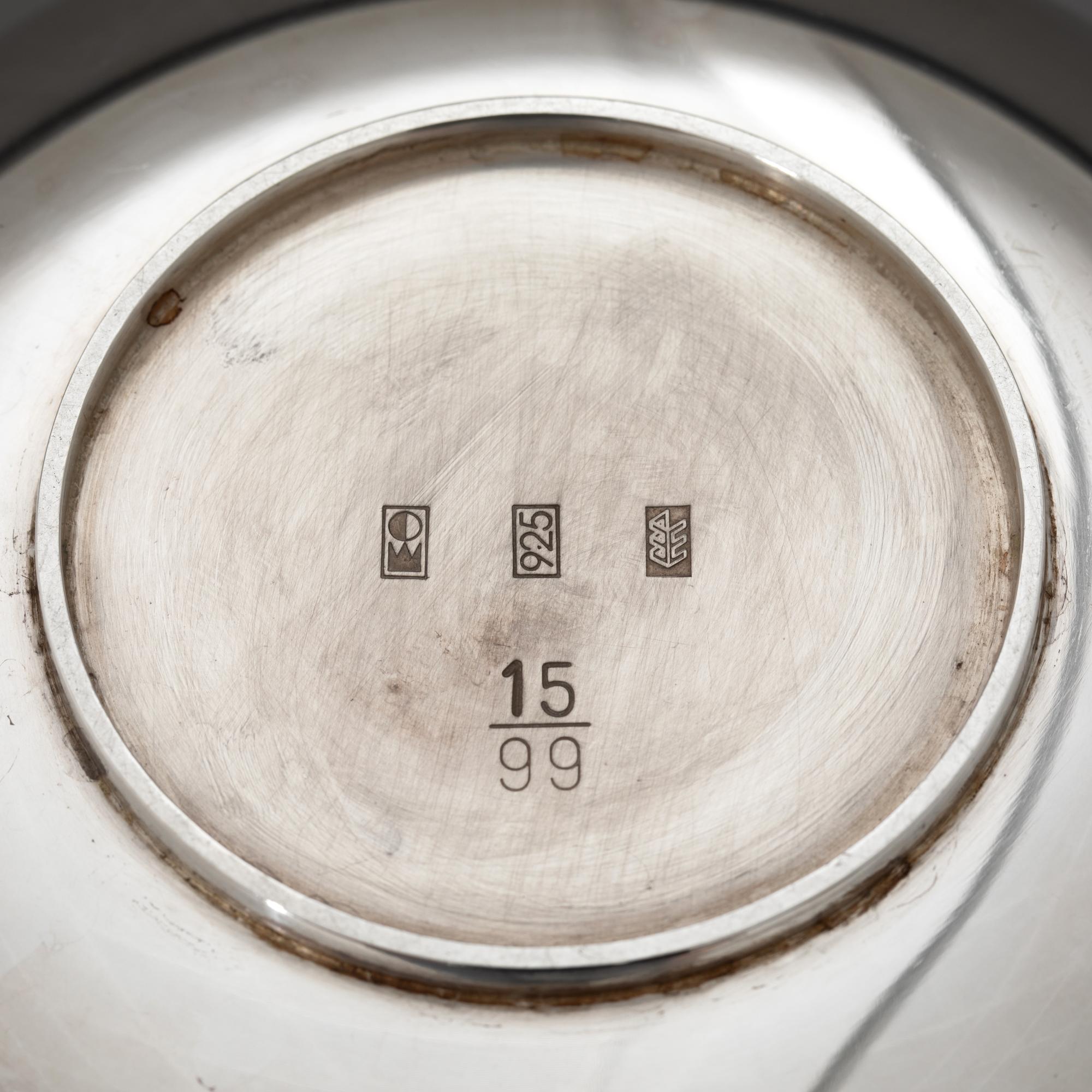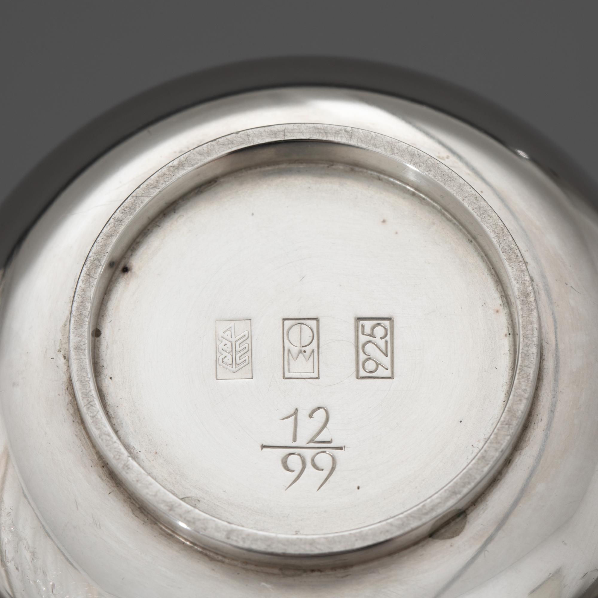 Sieben Teile. Teekanne auf Stövchen mit Brennpfanne, 2 Milchkännchen, 2 Zuckerschalen. Sterlingsilber. Insgesamt 1608 Gramm. Stövchen aus Metall (364 g). H. 20,5 cm + 6,8 cm, L. 12 cm / H. 7,8 cm / H. 6,3 cm; Gestempelt: Mond Krone 925, unterschiedliche Werkstattmarken.