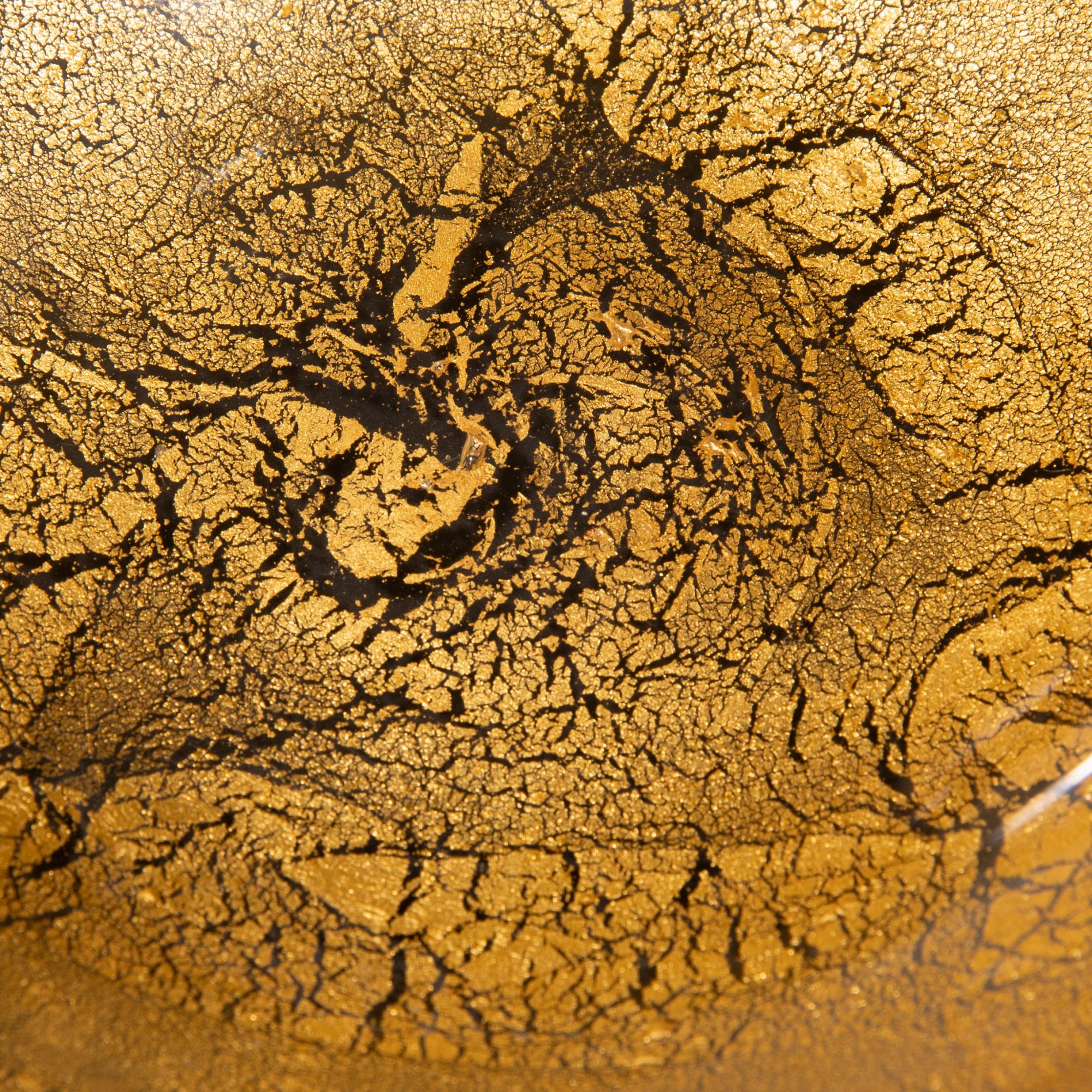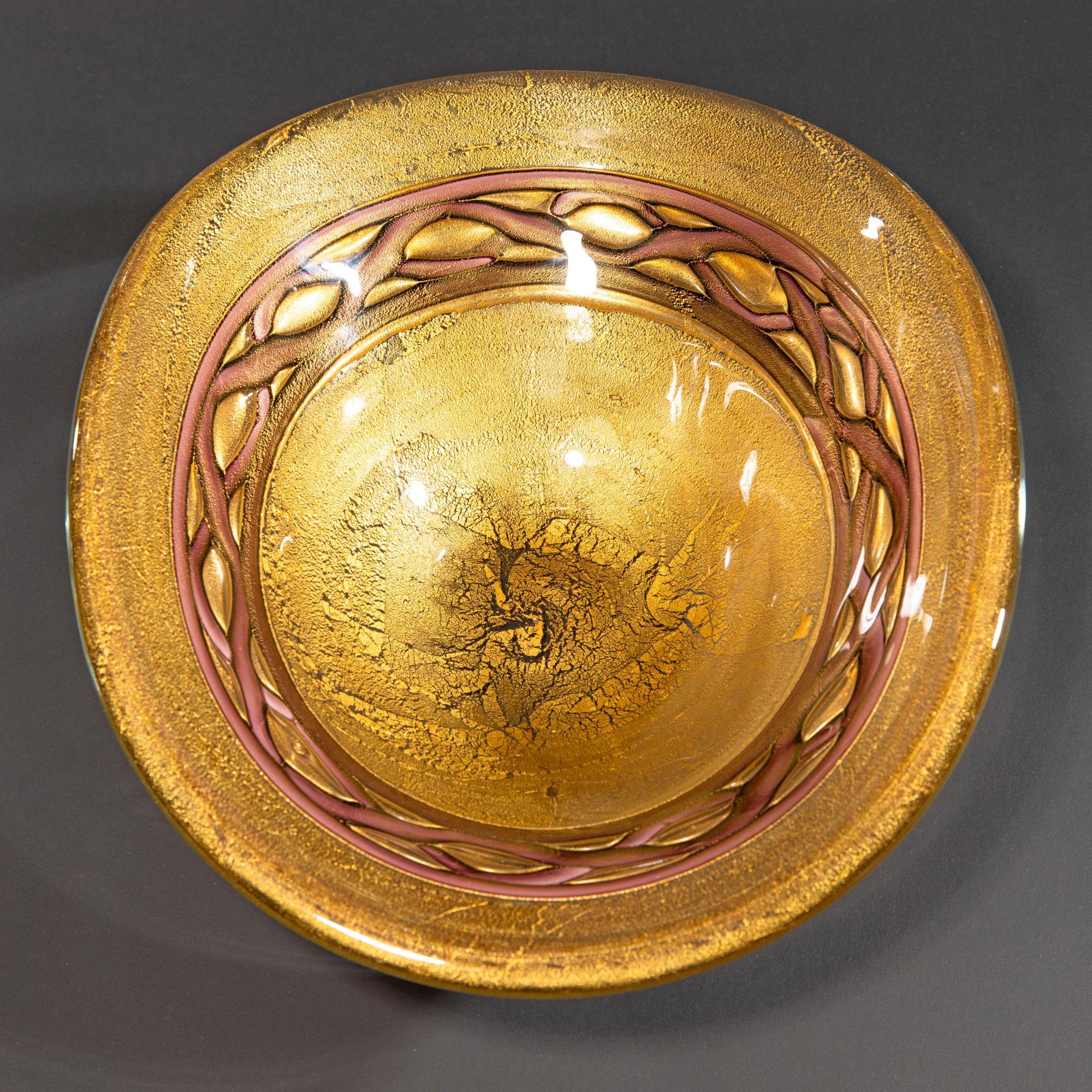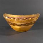 Entwurf 1955-60. Ausführung Barovier & Toso, Murano. Überfangglas, farblos mit zersprengter Goldfolie und violetten Bändern. 13 cm; 32,5 x 27,5 cm.