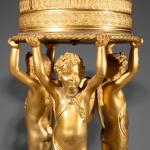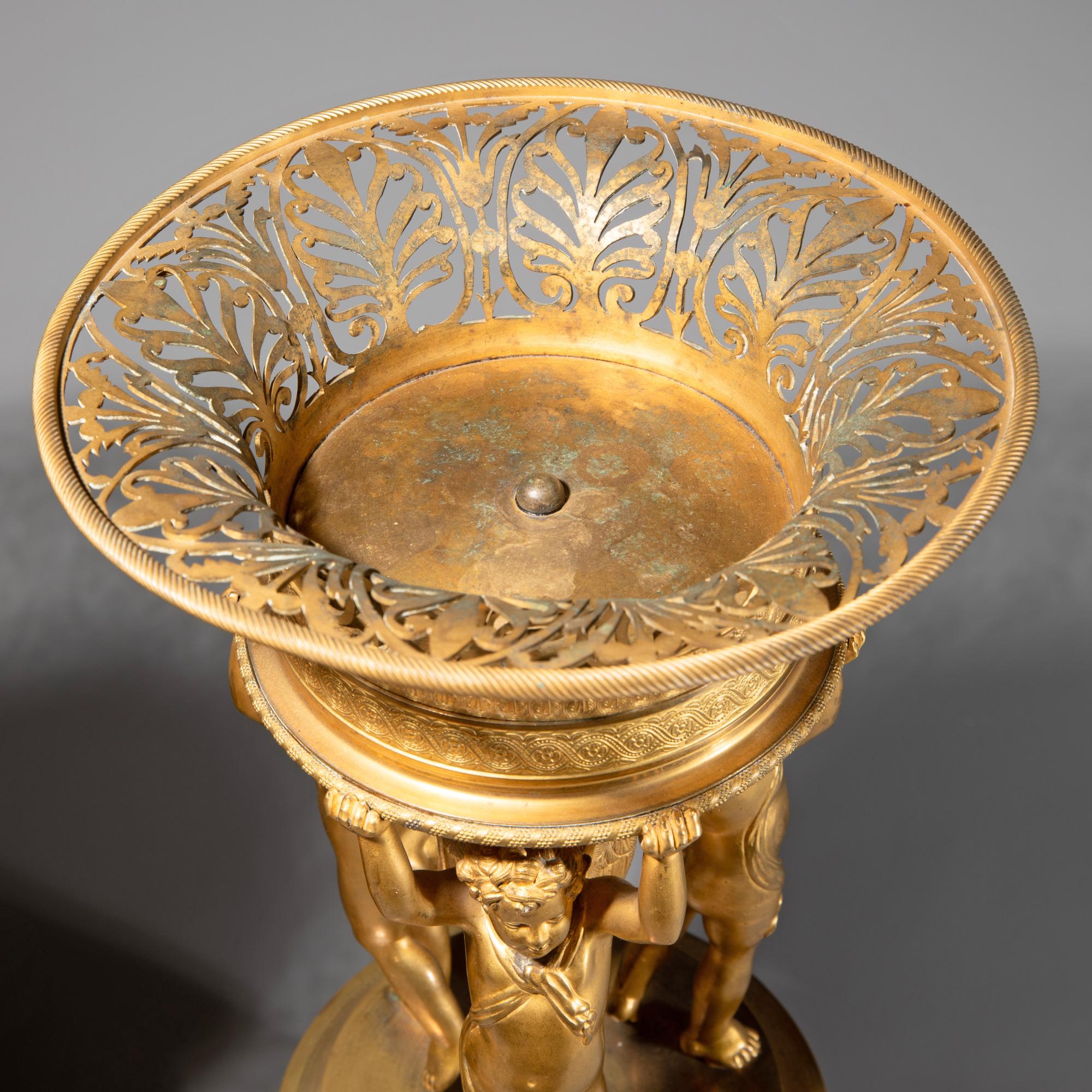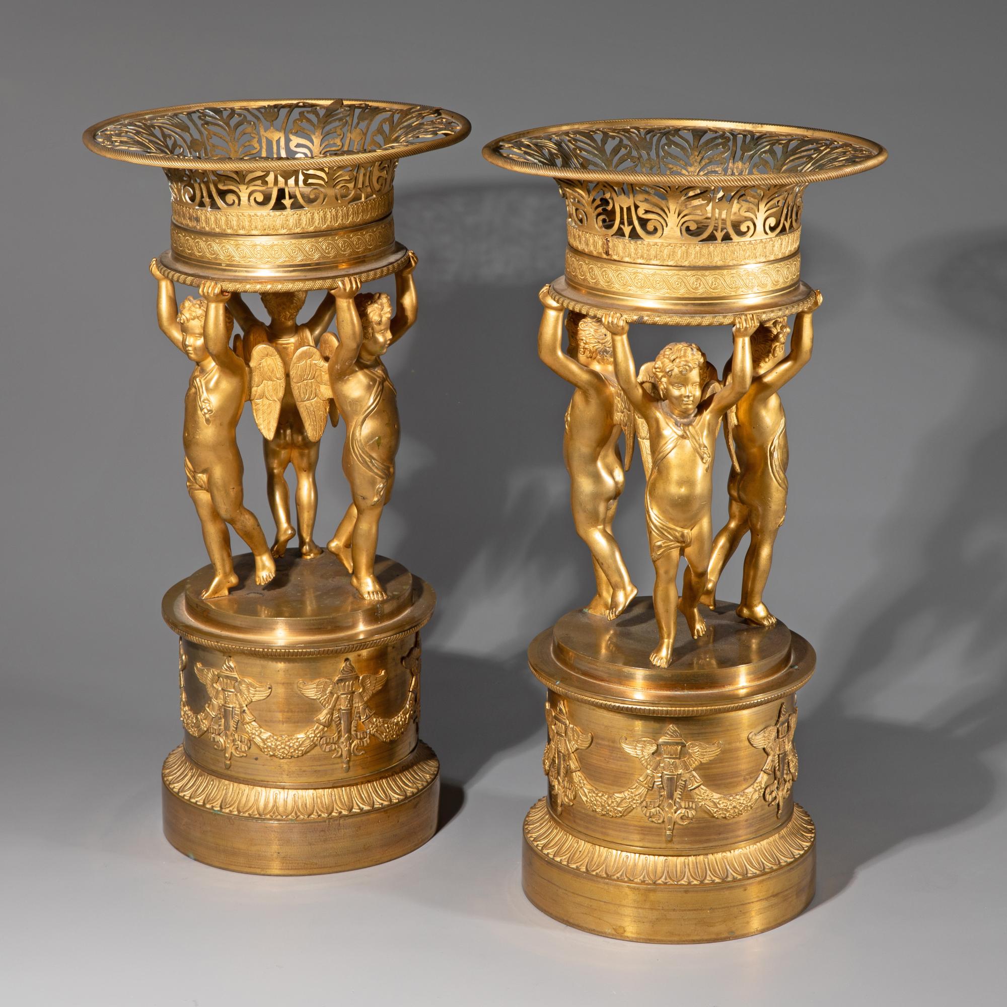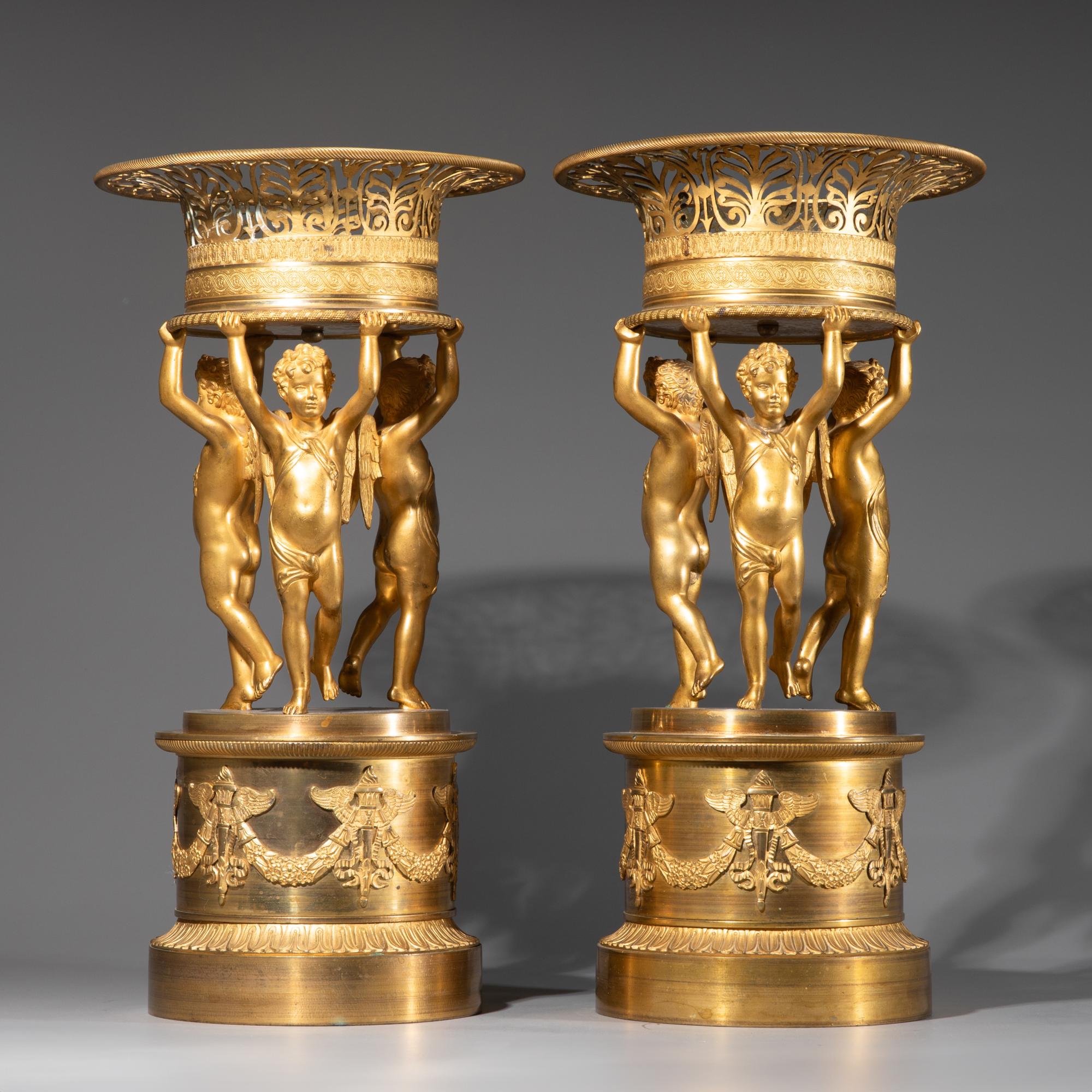 Bronze, matt- und glanzvergoldet. Weite, fein durchbrochene, von drei geflügelten Genien getragene, aus Anthemnien gebildete Korbschale auf hohem Rundschaft mit feinen Applikationen in Form von Blütengirlanden. Nicht bezeichnet. H 42 cm; D 22 cm.