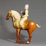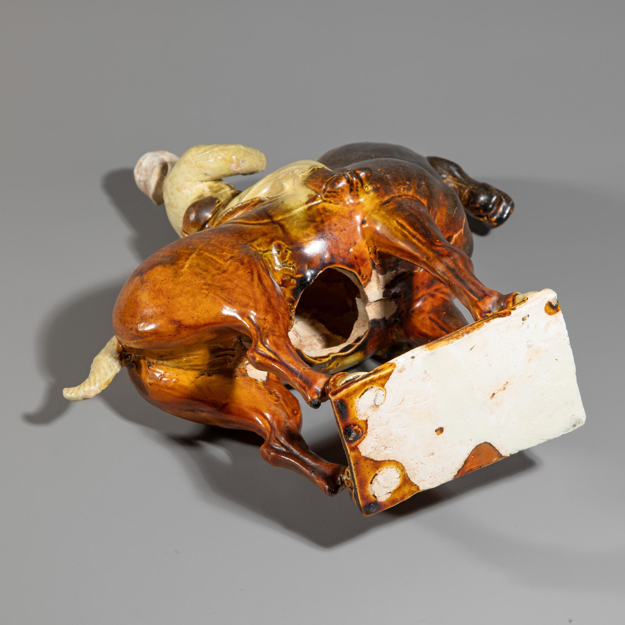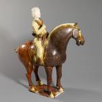 Der Reiter trägt eine lange Robe und Stiefel, das unglasierte Gesicht sowie der Hut mit den Resten einer Kaltbemalung. Die Hände erhoben als halte er Zügel. Das Pferd steht auf einem unglasierten rechteckigen Sockel und hält den Kopf leicht nach links geneigt. Heller Irdenwarenscherben mit brauner und strohfarbener Glasur.