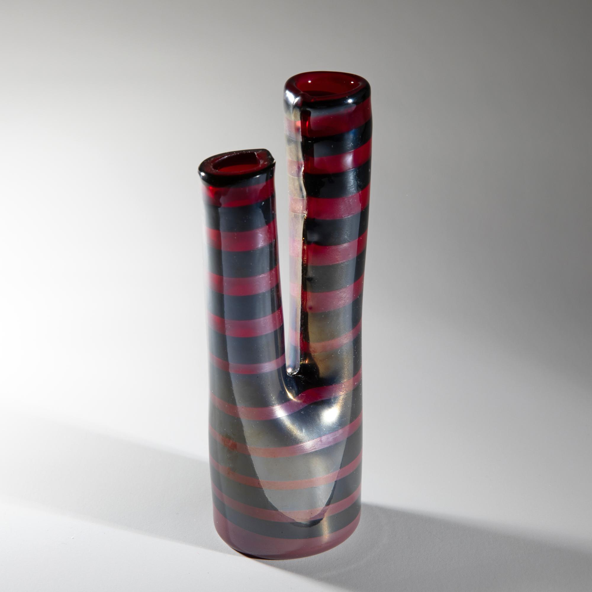 Entwurf 1951. Modell-Nr. 4515. Ausführung: Venini. Überfangglas, farblos und rot mit aufgeschmolzenen Bändern in Grau, irisiert. H. 18,5 cm. Am Boden bez.: venini murano ITALIA (Ätzstempel).
