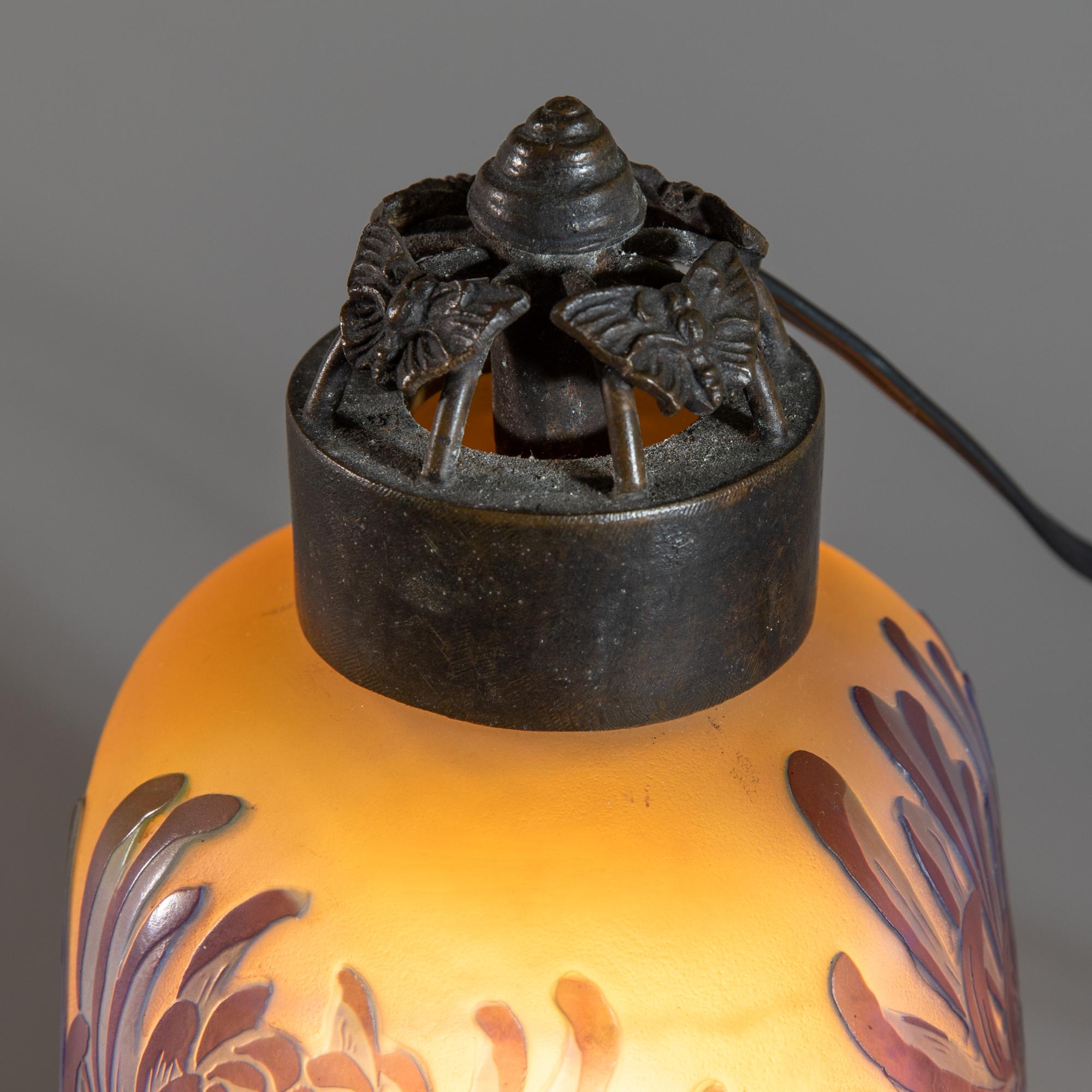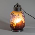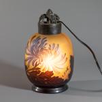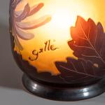 Überfangglas, bernsteinfarben, farblos und blau. geätzter Dekor, Motiv mit blühenden Chrysanthemen. H. 19 cm. Sign.: Gallé (hochgeätzter Schriftzug). Bronzemontierung mit Schmetterlingsmotiv.