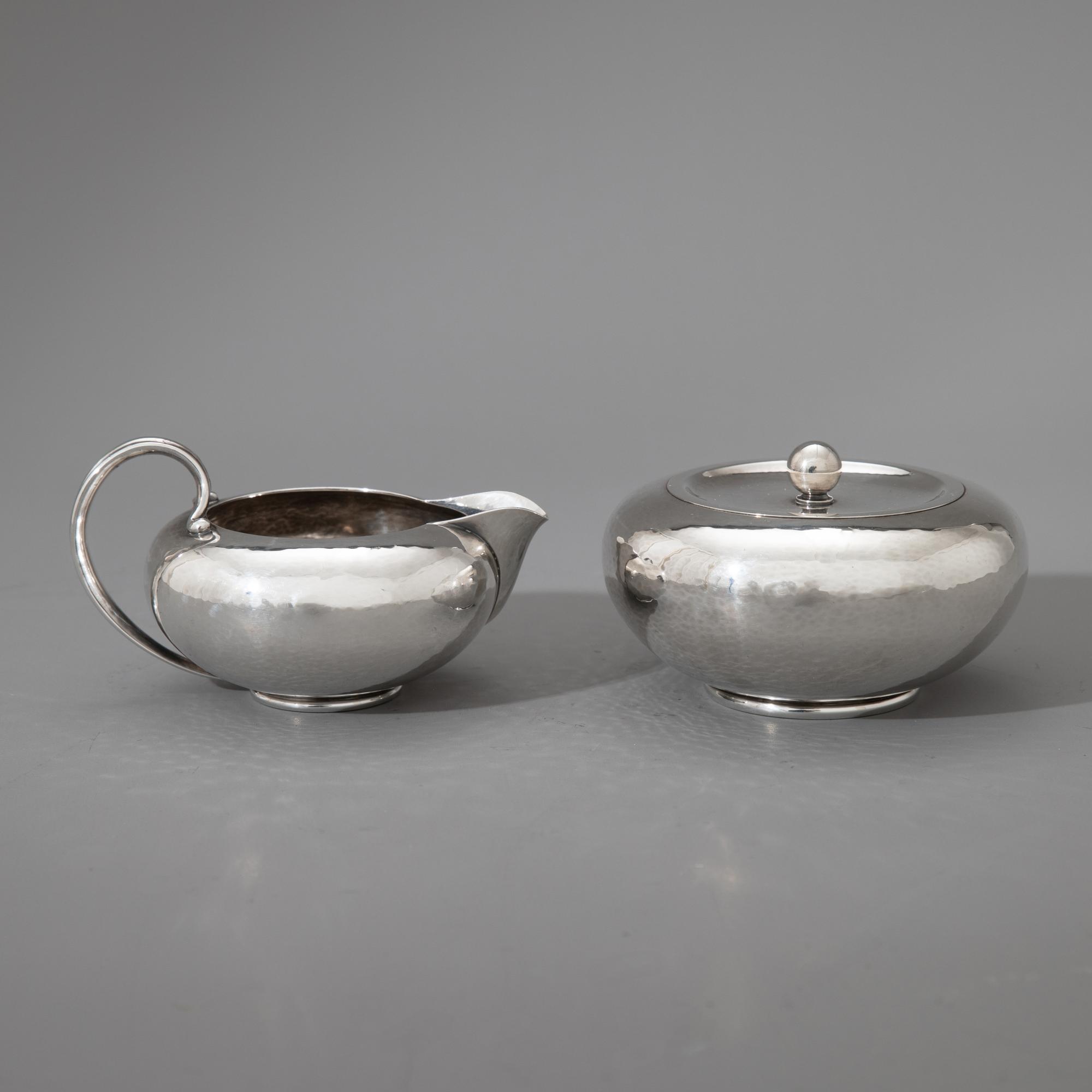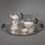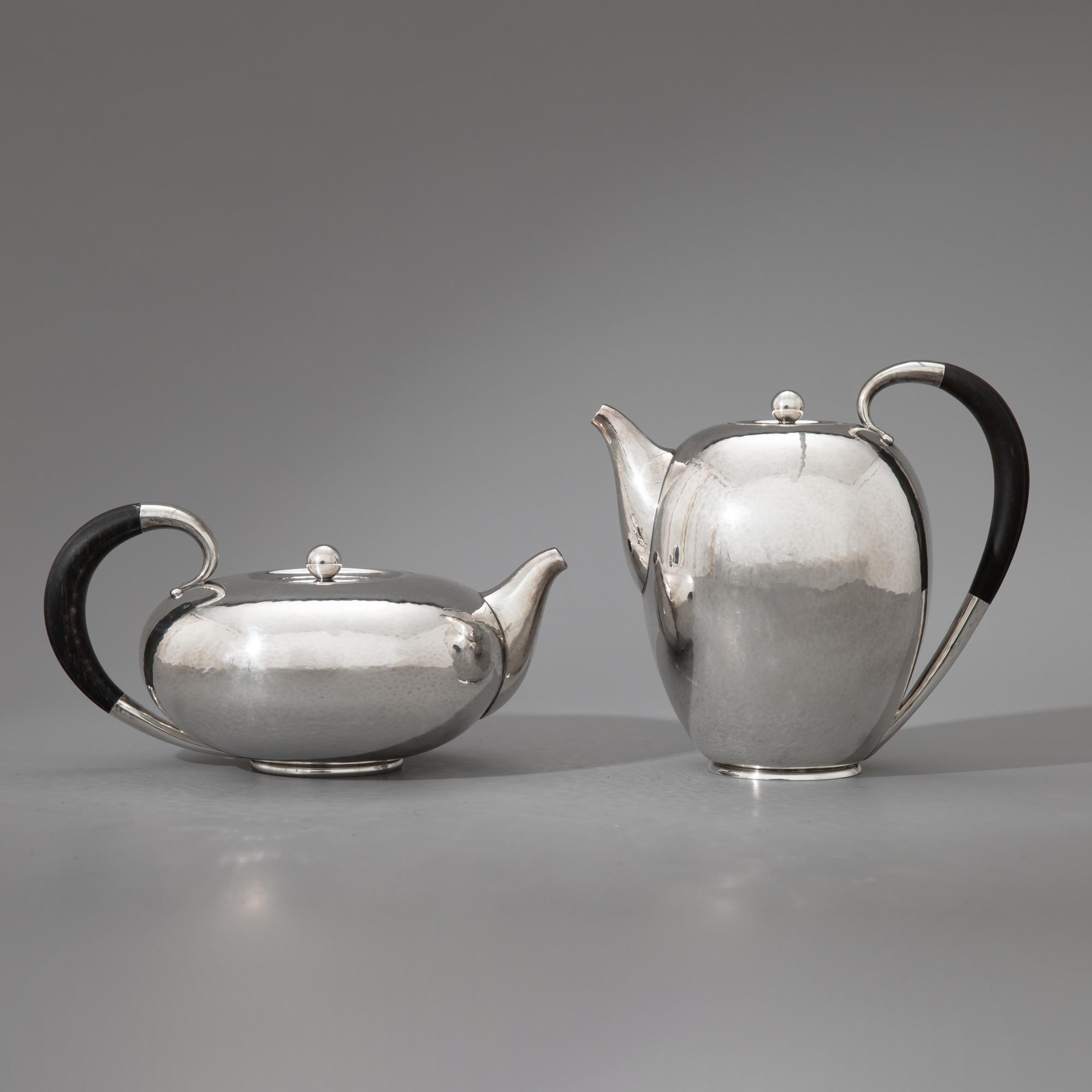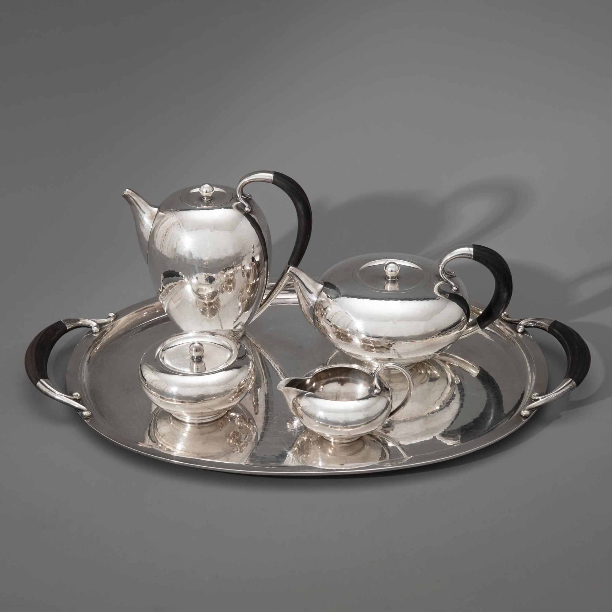 Entwurf Johan Rohde, um 1933. Ausführung nach 1945. Sterlingsilber mit Hammerschlagdekor und Griffen aus Ebenholz. Kaffeekanne, Teekanne, Zuckerdose, Milchkännchen und Tablett. 17 x 17,5 x 11 cm / 11 x 21,5 x 15 cm / H, 6,5 cm, D. 10,5 cm / 6,5 x 12 x 9 cm / 4 x 52,5 x 35,5 cm. Gewicht 3.444 g. Jeweils unterseitig bezeichnet mit Marke des Entwerfers, Herstellermarke, Feingehalt und Modellnummer: Dessin JR, Georg Jensen, Denmark Sterling, 787.