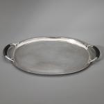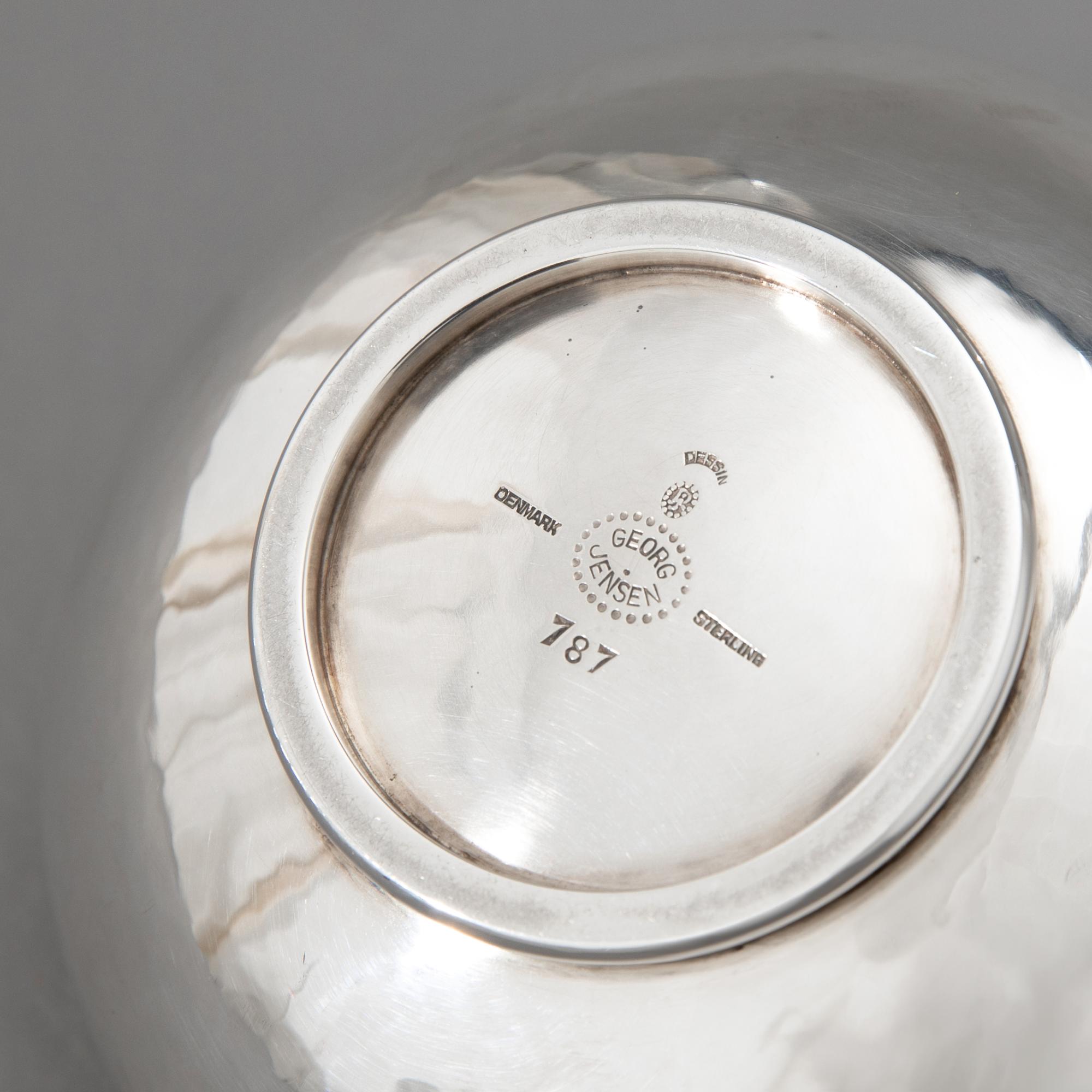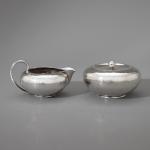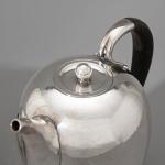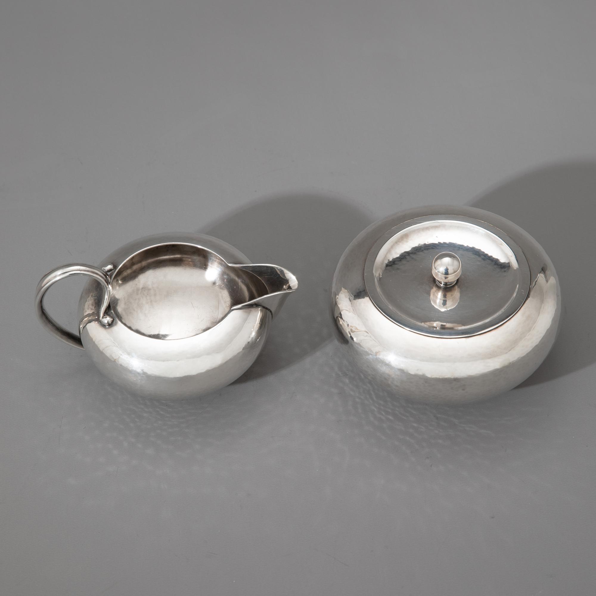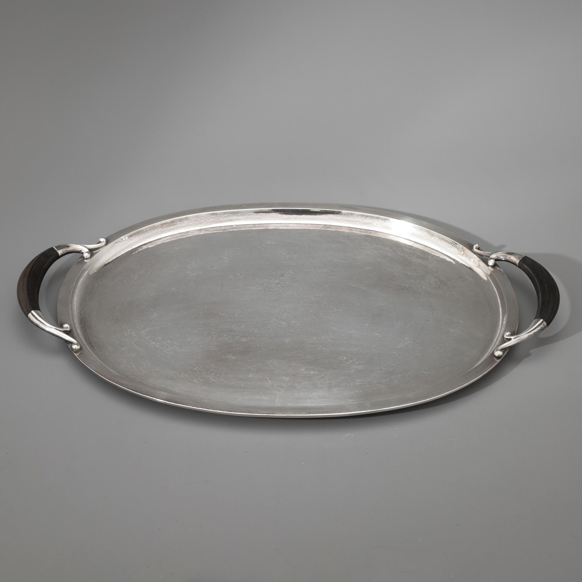 Entwurf Johan Rohde, um 1933. Ausführung nach 1945. Sterlingsilber mit Hammerschlagdekor und Griffen aus Ebenholz. Kaffeekanne, Teekanne, Zuckerdose, Milchkännchen und Tablett. 17 x 17,5 x 11 cm / 11 x 21,5 x 15 cm / H, 6,5 cm, D. 10,5 cm / 6,5 x 12 x 9 cm / 4 x 52,5 x 35,5 cm. Gewicht 3.444 g. Jeweils unterseitig bezeichnet mit Marke des Entwerfers, Herstellermarke, Feingehalt und Modellnummer: Dessin JR, Georg Jensen, Denmark Sterling, 787.
