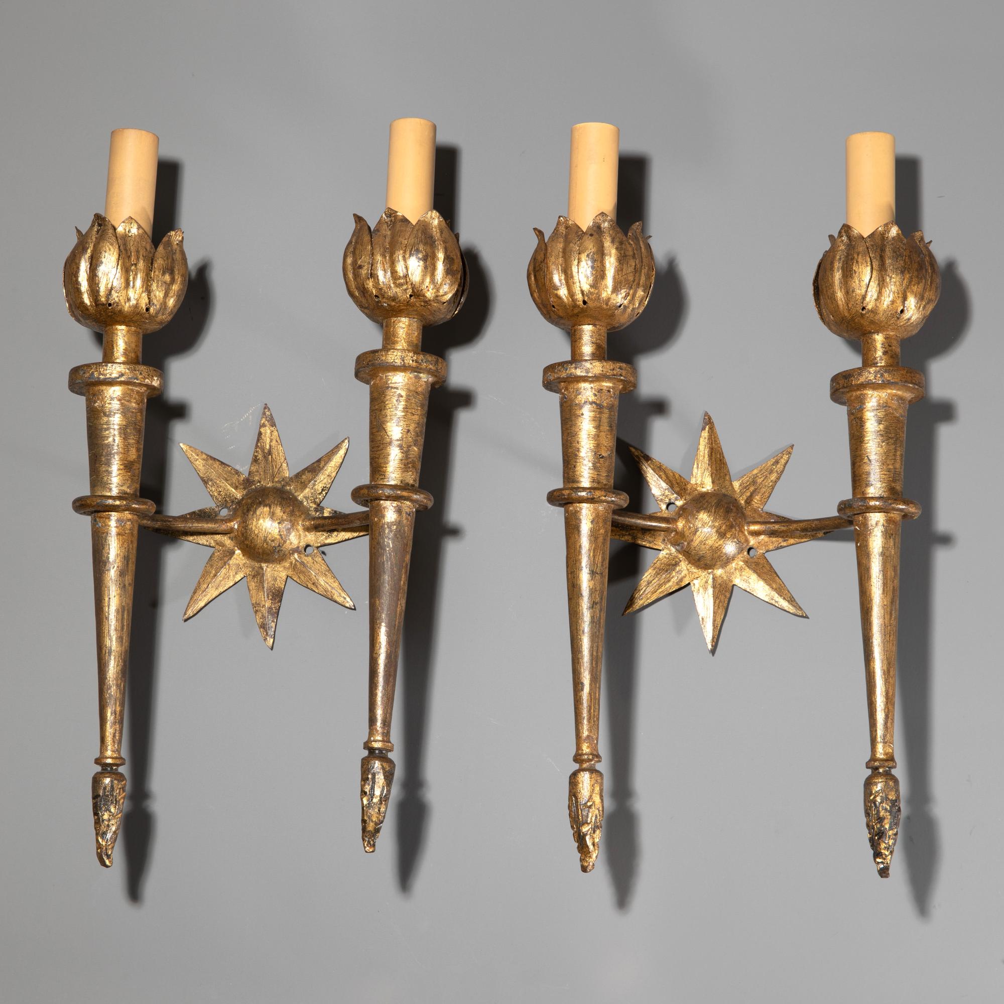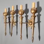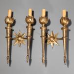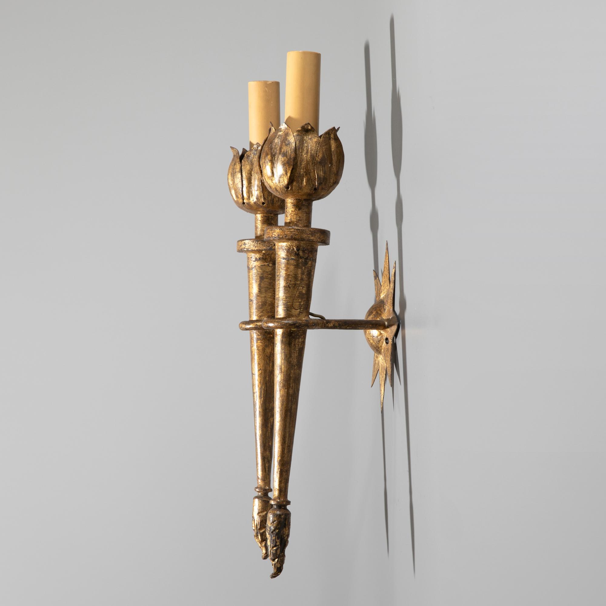 Je zweiflammig. Schmiedeeisen, goldbemalt. H. 40 x 21 x 12 cm. Nicht bezeichnet.