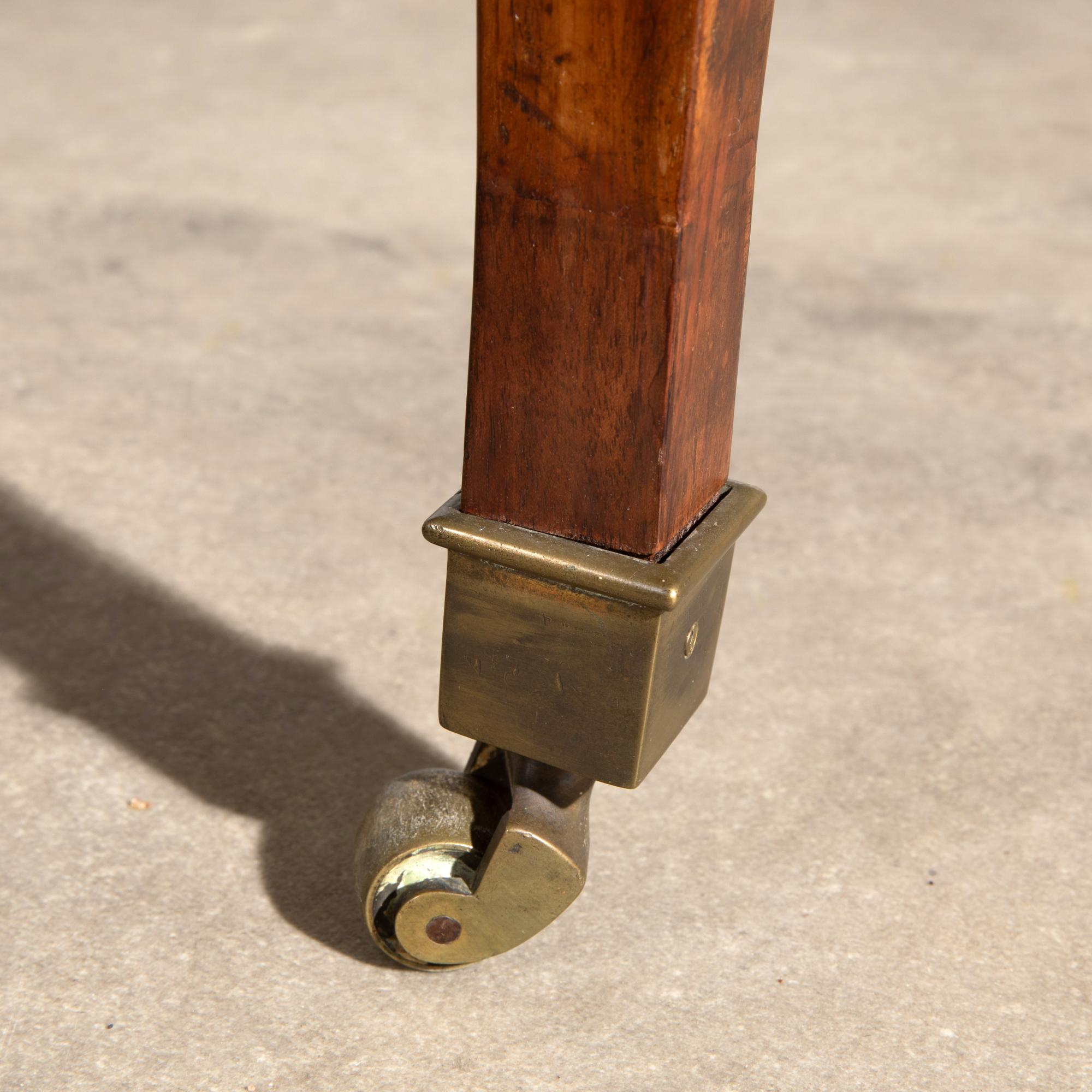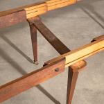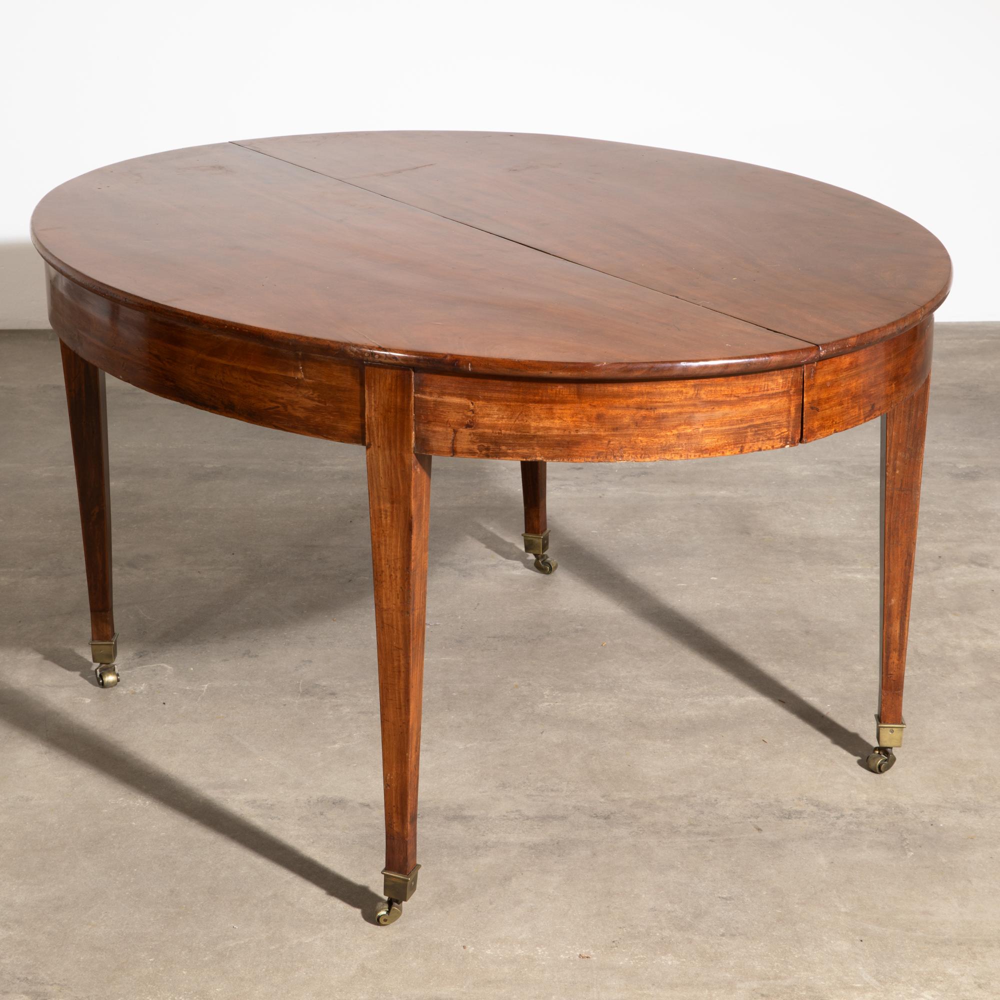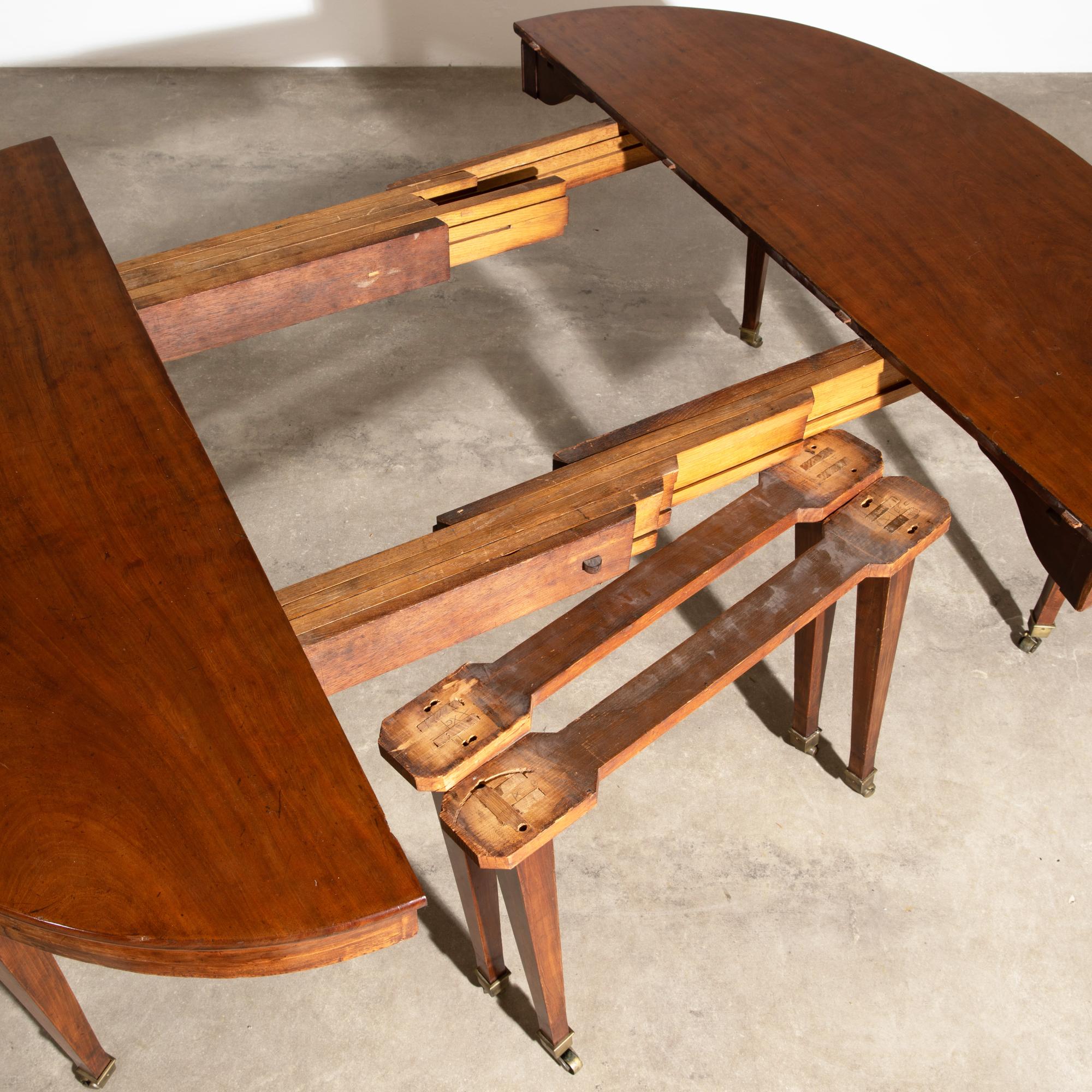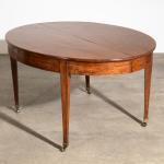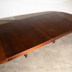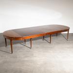 Mahagoni, massiv und furniert. Der ausziehbare Tisch mit zusätzlichen Einlegeplatten. Auf acht konischen Vierkantbeinen, gerade, teilweise bombierte Zarge sowie geringfügig überstehende Deckplatte. 78 x 118 / 228 / 368 x 150 cm.