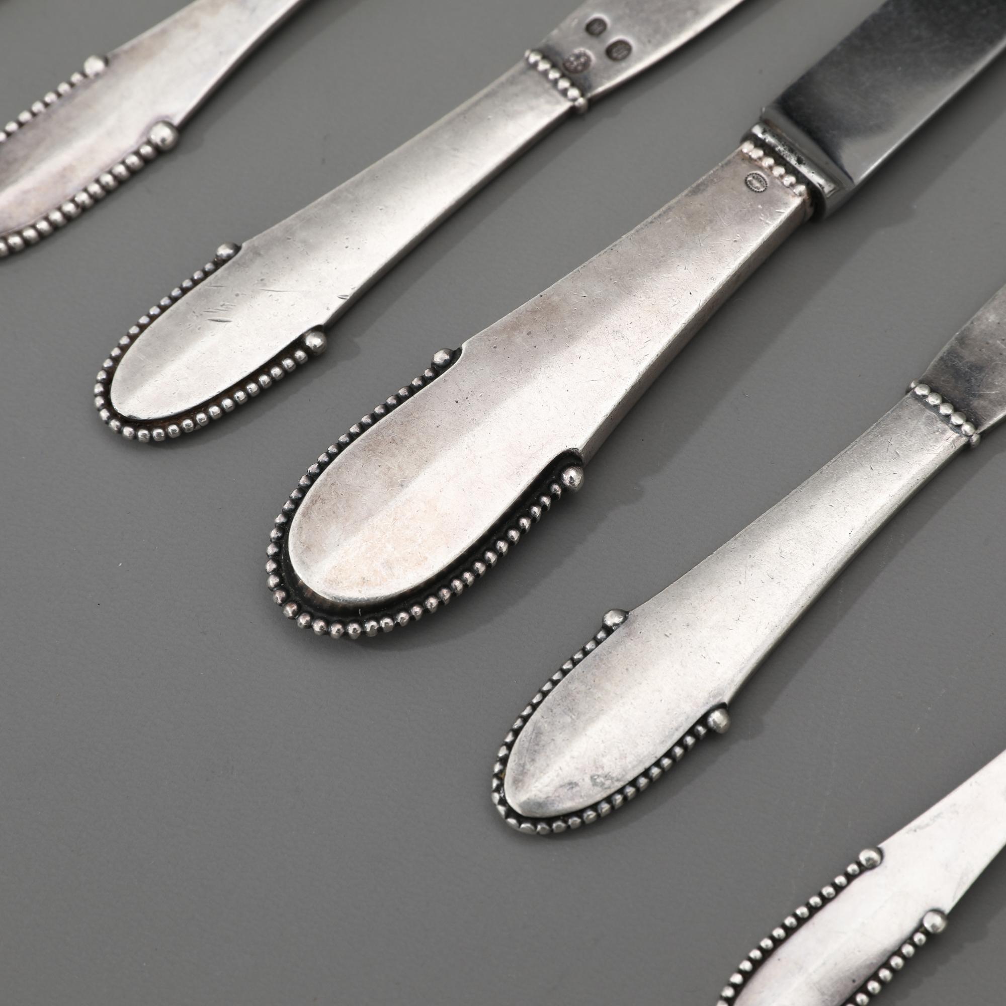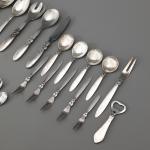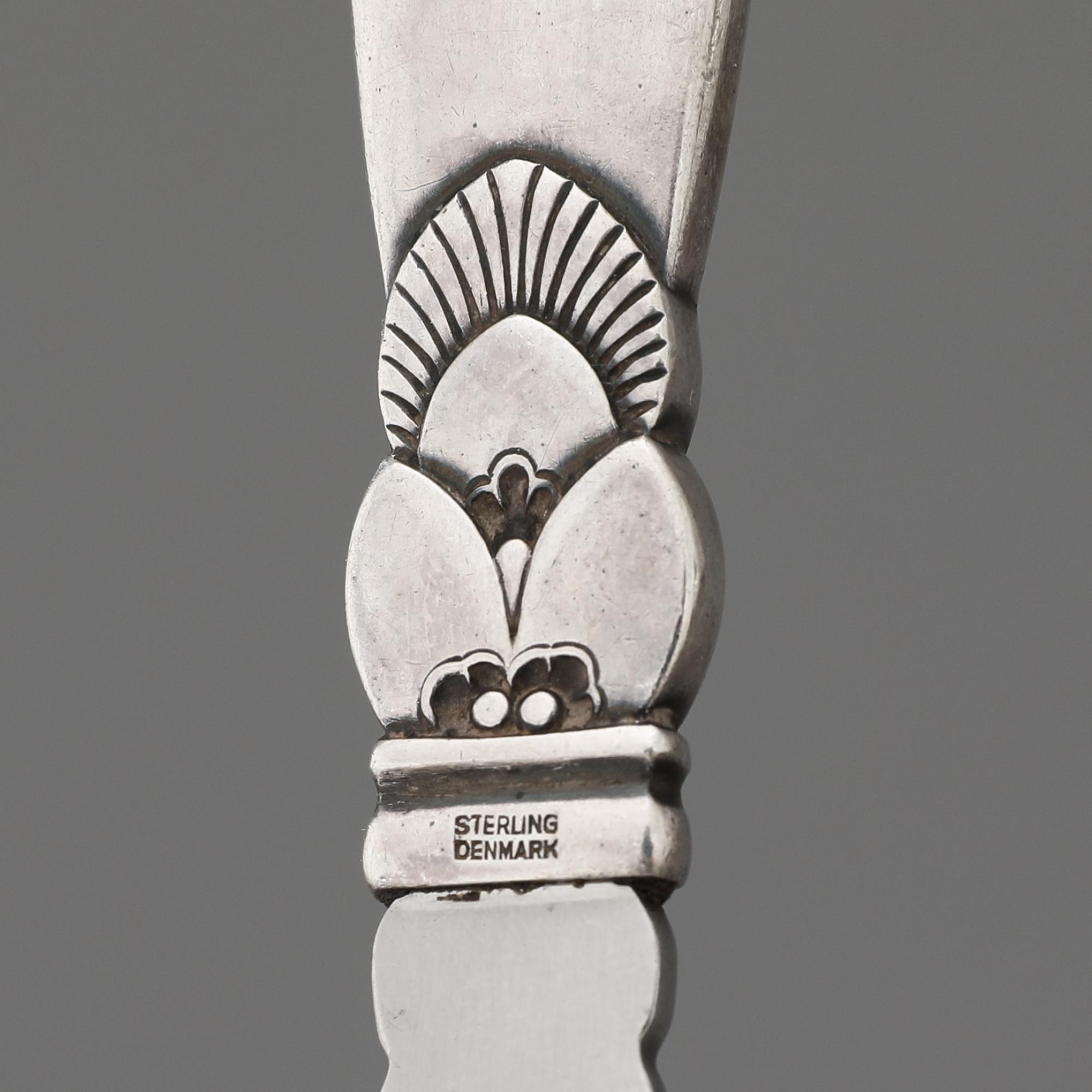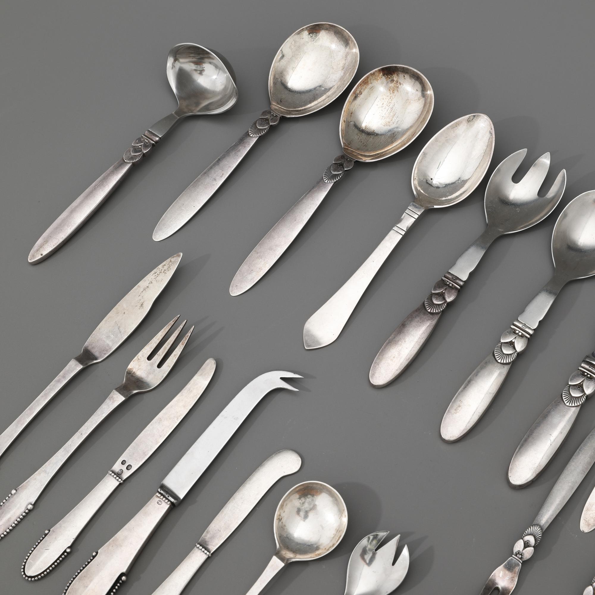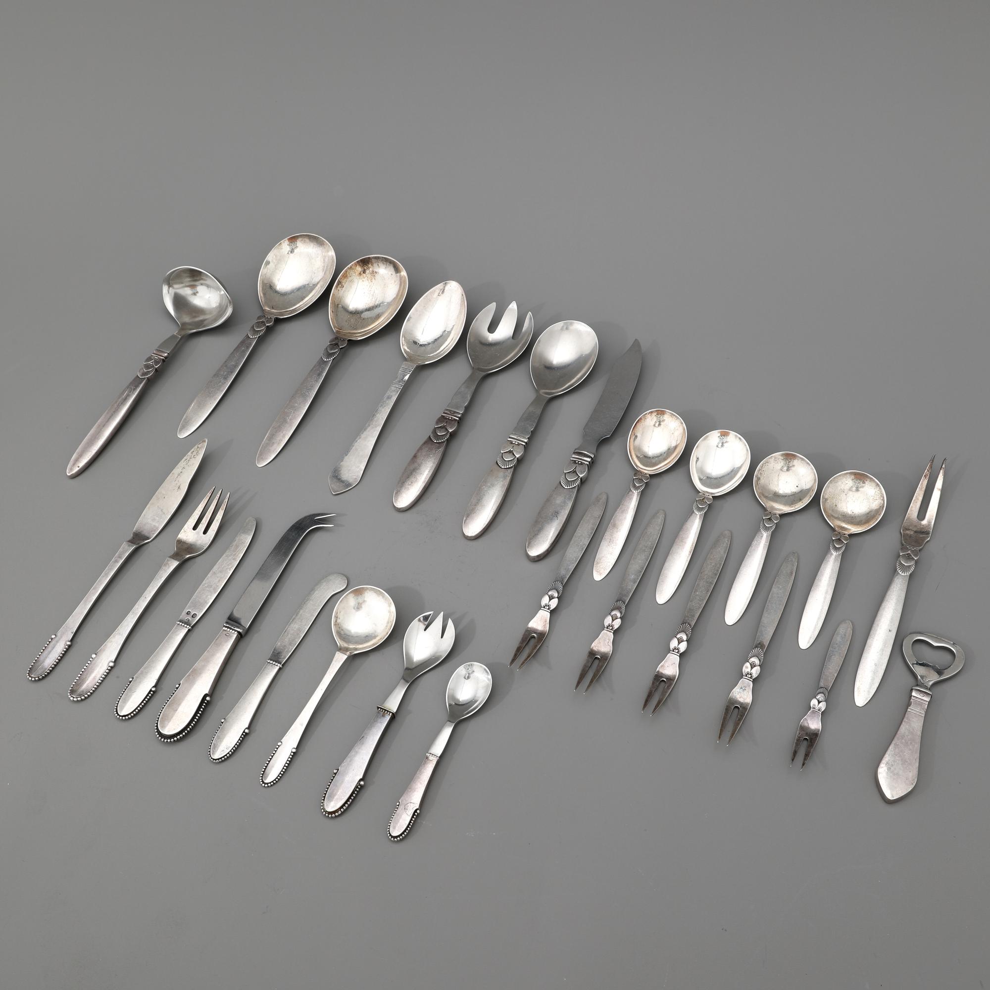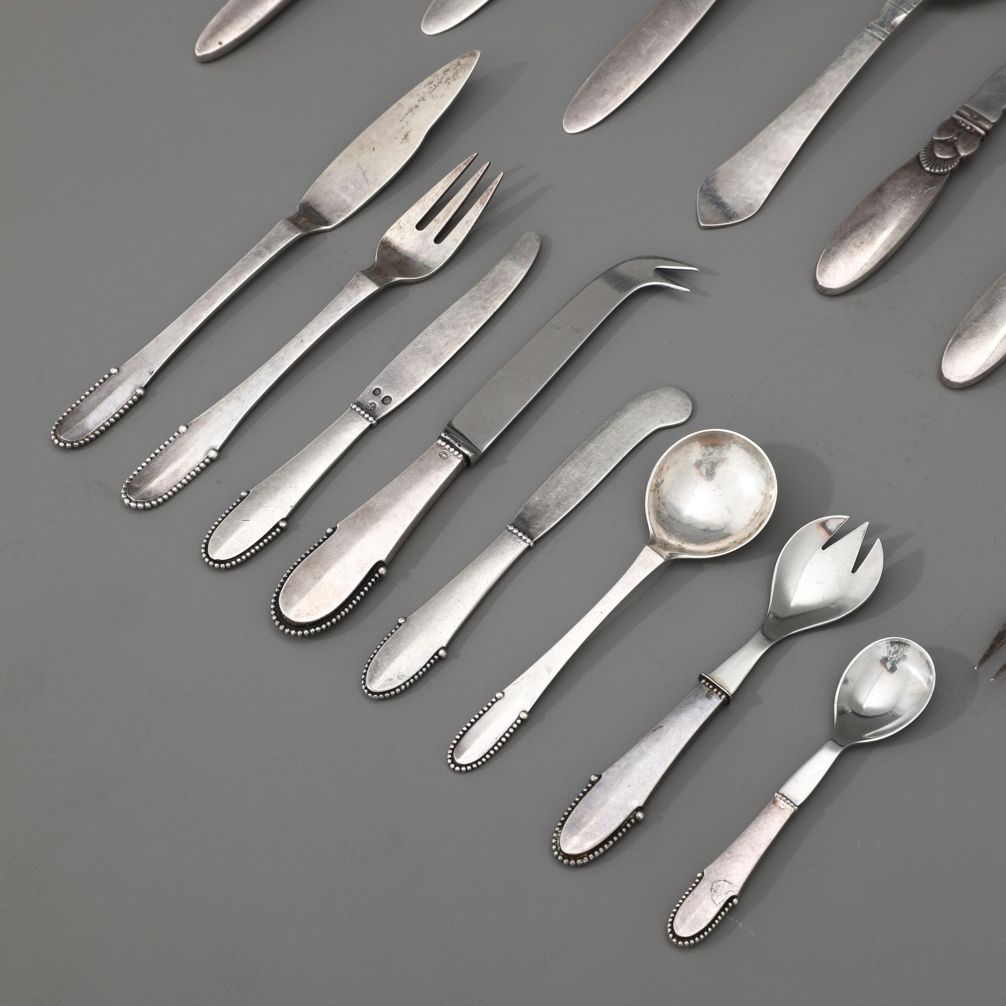 26-teiliges Besteck-Konvolut. Silber 830er / 925er. verschiedene Dekore: Cactus (Entwurf Gundorph Albertus für Georg Jensen, 1930), Continental (Entwurf Georg Jensen, 1906) und Beaded (Entwurf Georg Jensen, 1916). Unterschiedliche Ausführungen. L. 11,5-20,5 cm. Gewicht: 750 g (außer Besteckteile aus Edelstahl und mit gefüllten Griffen). Jeweils bezeichnet mit Herstellermarke Georg Jensen, teilweise mit Feingehalt, Stadtmarke und Zusatz Sterling Denmark.