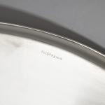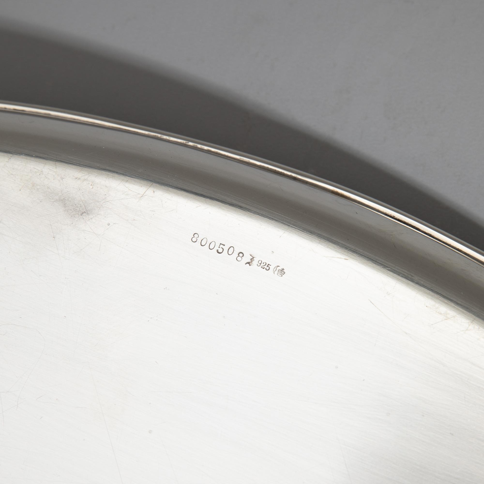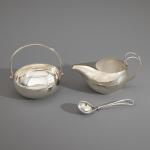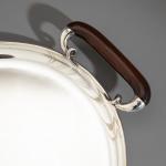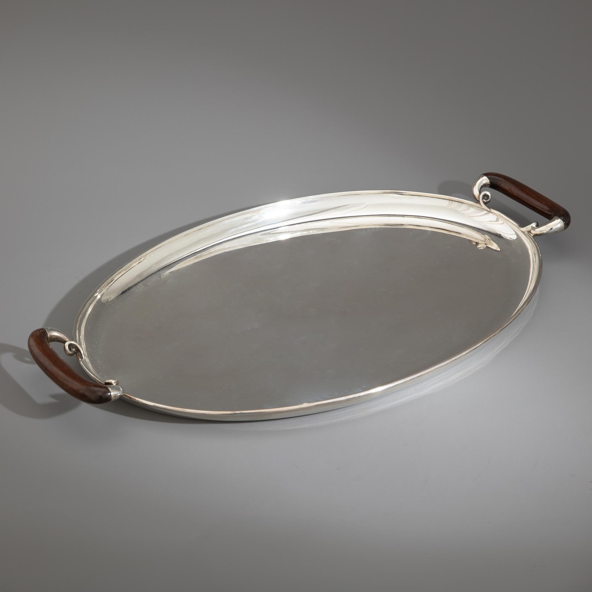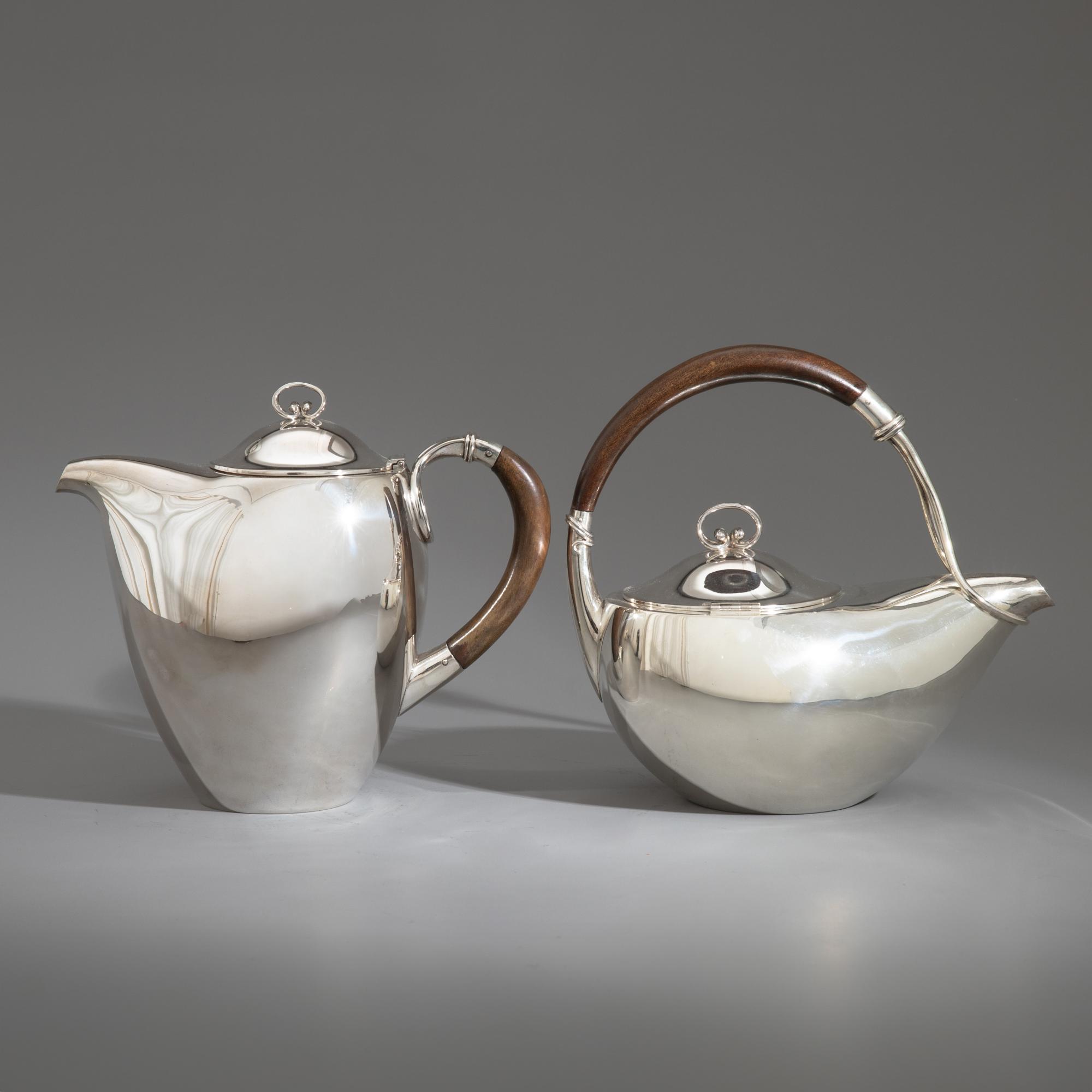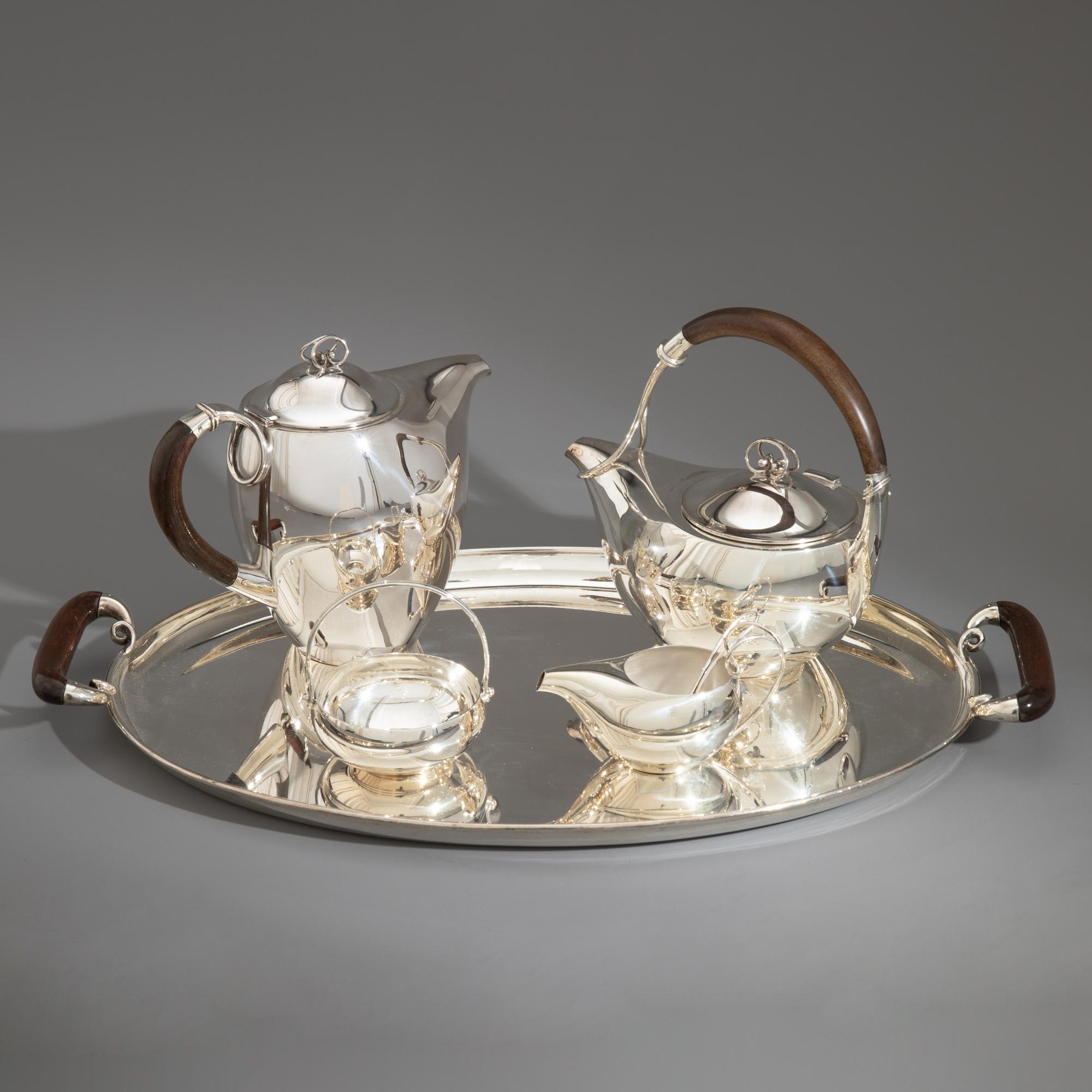 Entwurf Gustav Elsaß, Ausführung Koch & Bergfeld, 1938-1940. Das Silberservice aus 925er Silber besteht aus einer Kaffeekanne (H. 19 cm), einer Teekanne (H. 20 cm), einem Sahnegießer (H. 7 cm), einer Zuckerschale (H. 10 cm) mit Zuckerlöffel (L. 10,5 cm) und einem Tablett (4 x 53,5 x 33 cm). Dieser außergewöhnliche Entwurf zeichnet sich durch die klare, organisch-tropfenartige und elegante Form in Kombination mit kleinen, verspielten Details aus Silberdraht und schlaufenähnlichen Elementen aus. Die Henkel der Kannen und des Tabletts sind aus Holz gefertigt. Gewicht 2.769 g. Die Objekte sind jeweils unterseitig bezeichnet mit Herstellermarke, Feingehaltsstempel '925', Halbmond und Krone sowie jeweiliger Modellnummer.