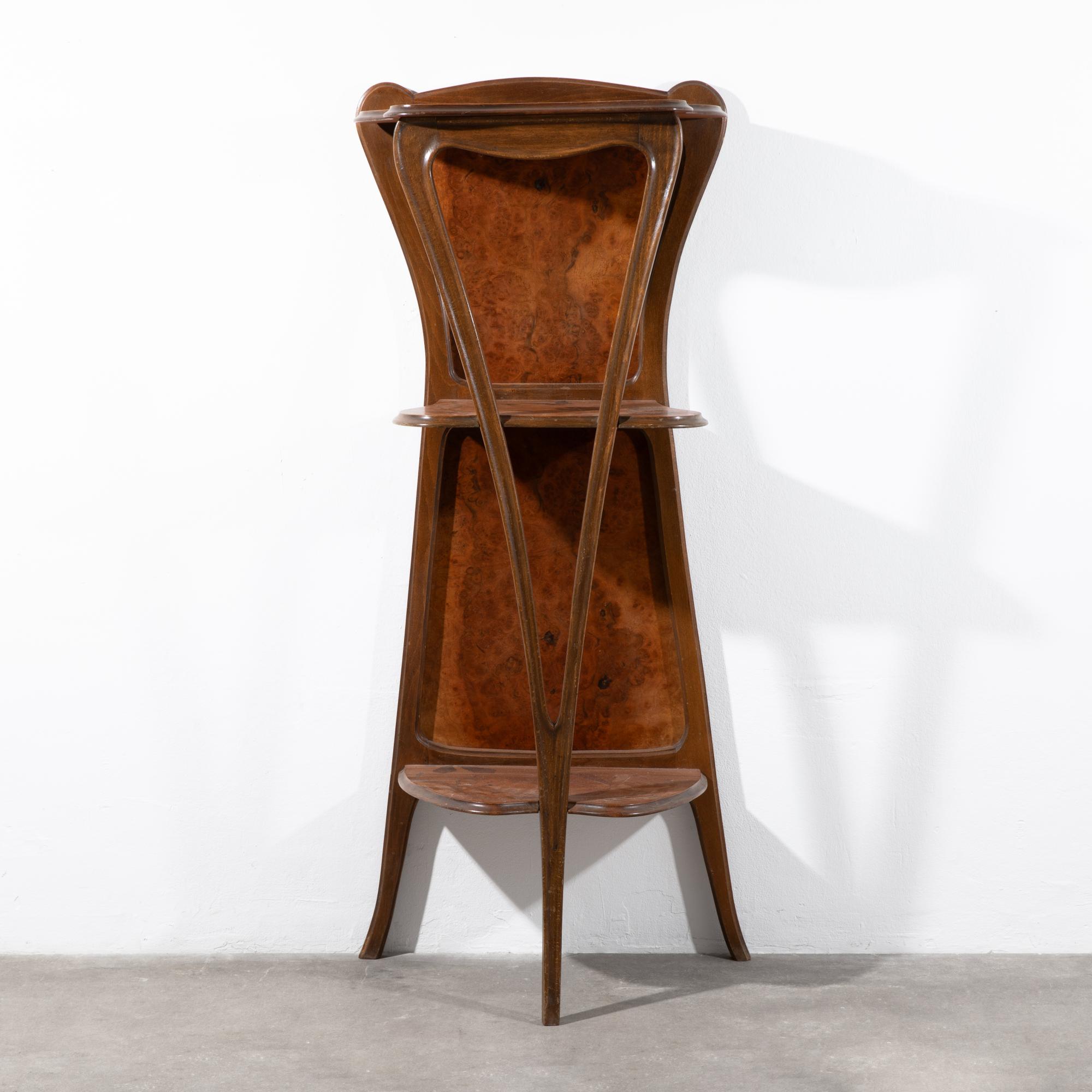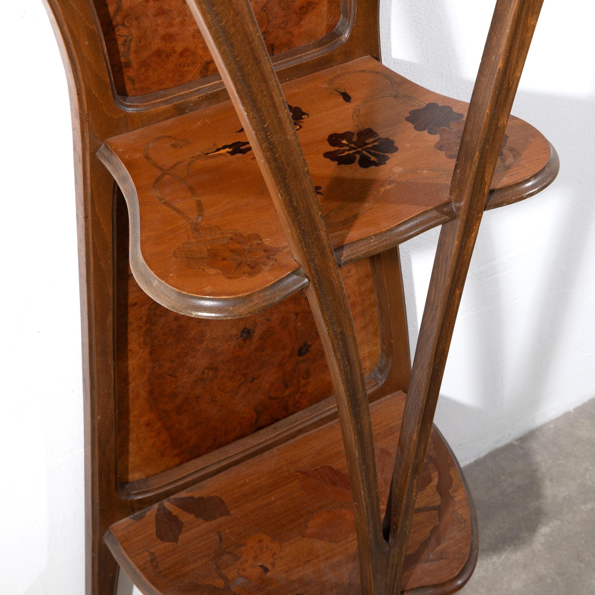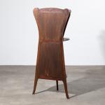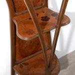 Mahagoni, Marqueterie aus unterschiedlichen Obsthölzern. Motive mit Obstzweigen, Trichterwinden und Schmetterling sowie Kastanienzweigen. H. 133,5 x 53 x 34,5 cm. Oberste Platte sign.: Guth (intarsiert).