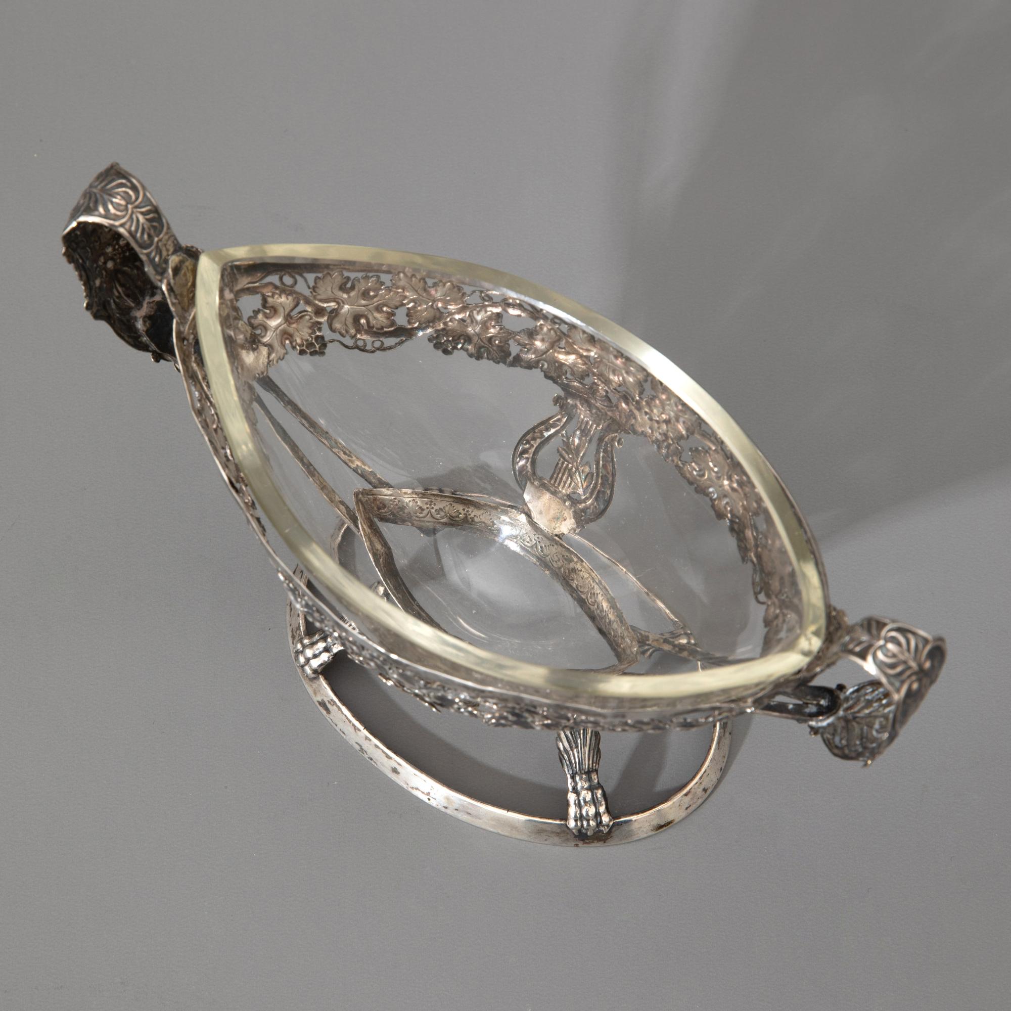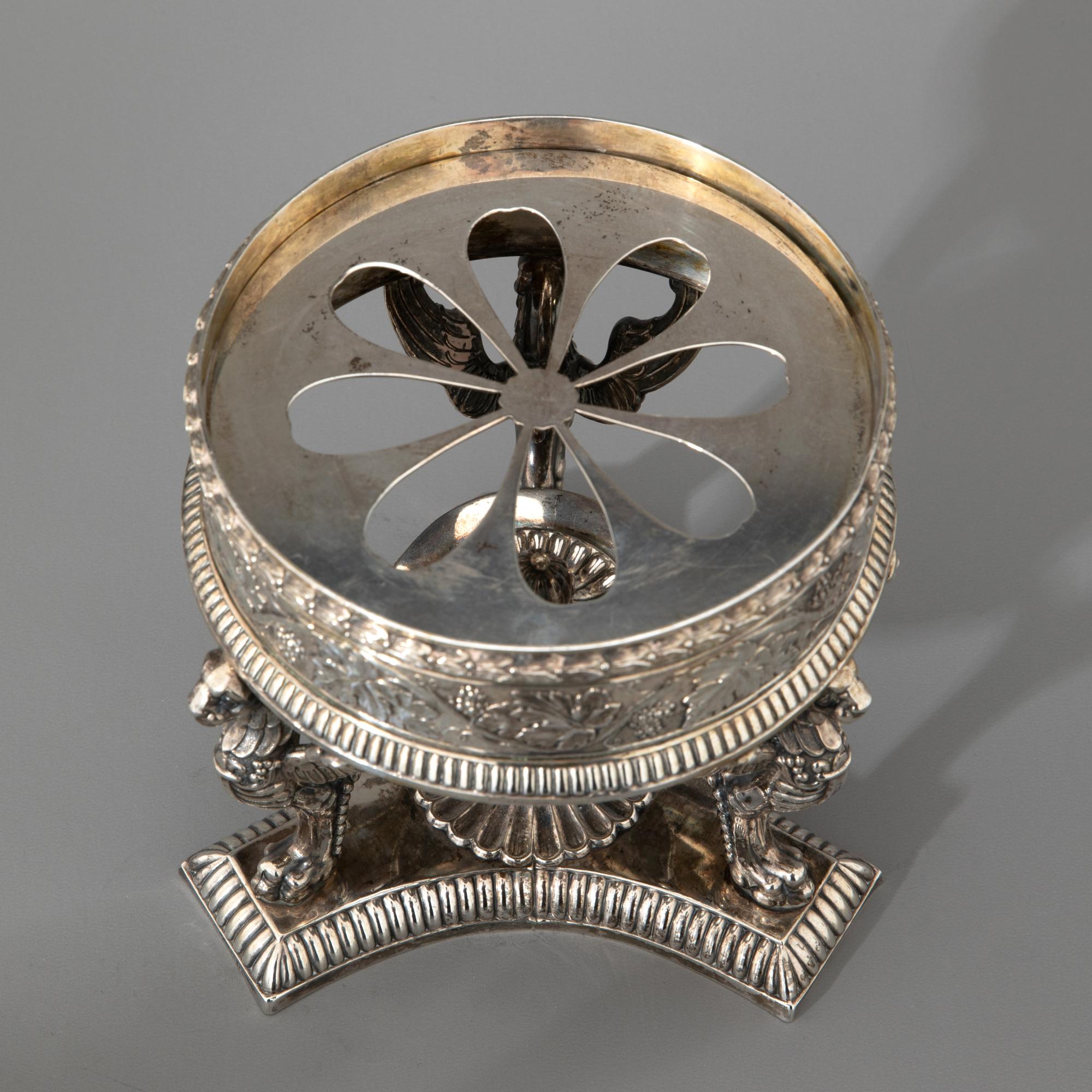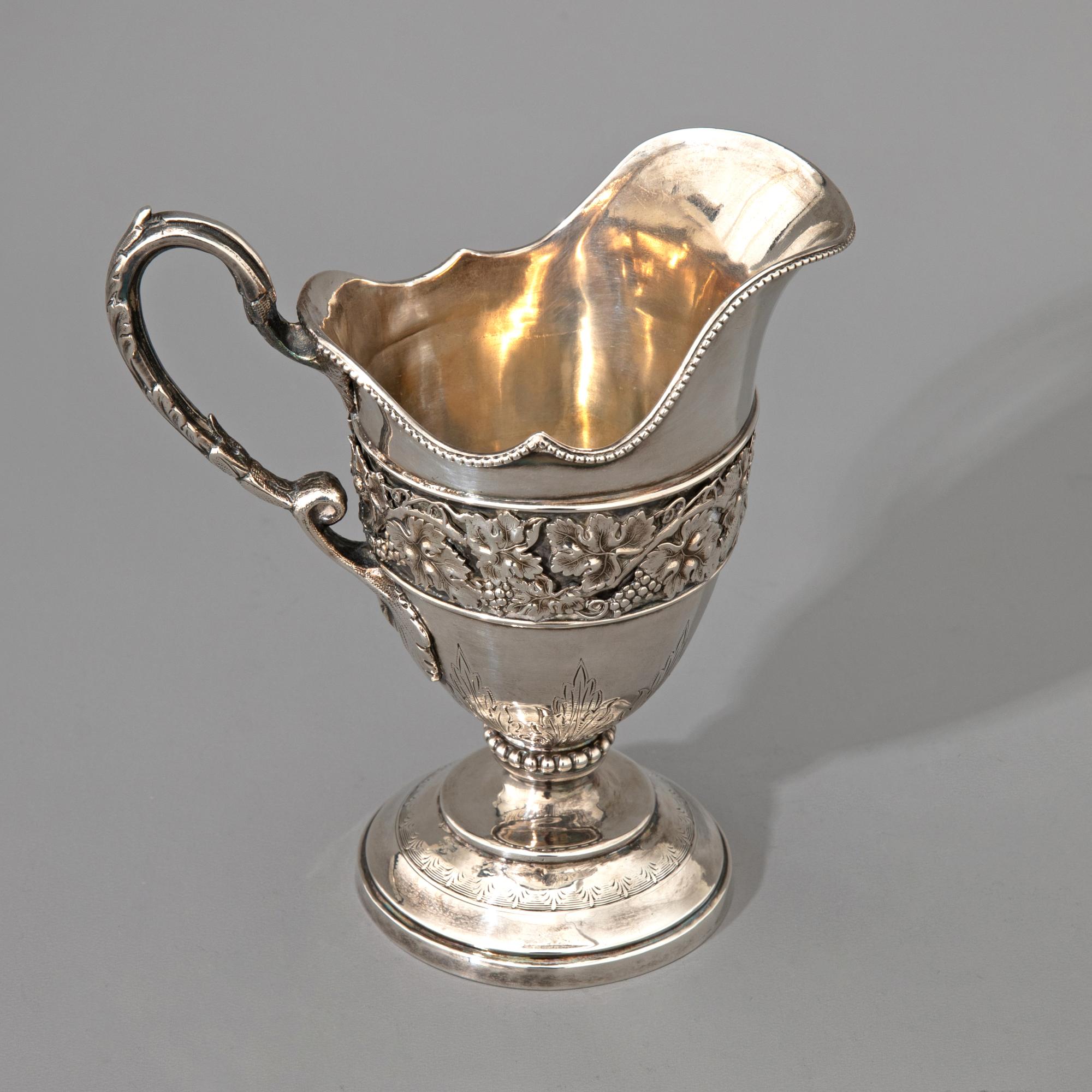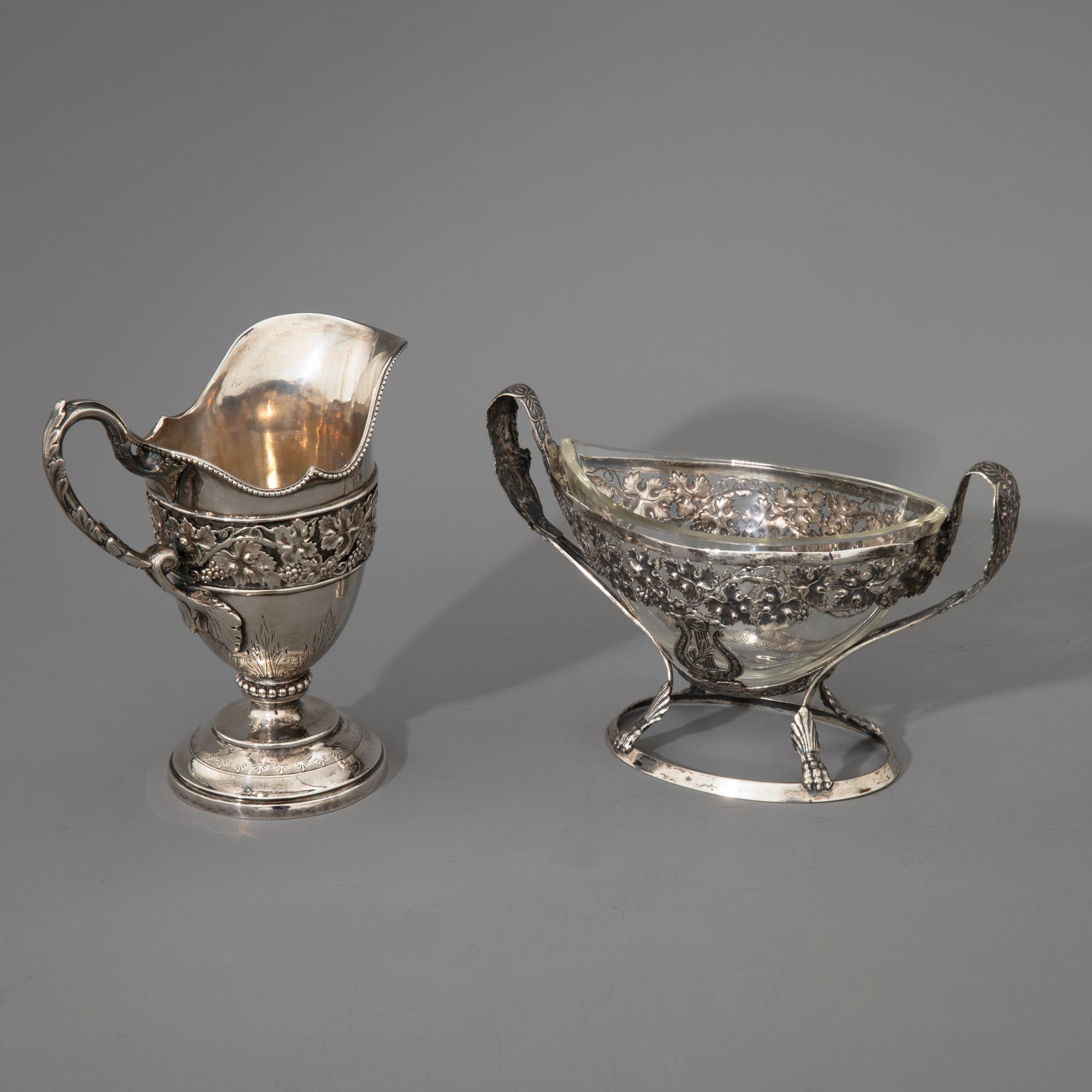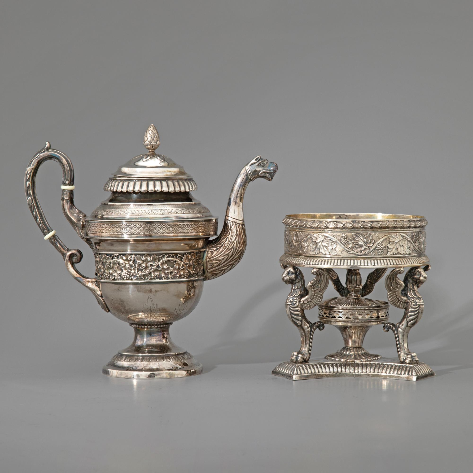 - Jahrhundert, Deutschland. Silber. Rechaud, Kanne, Sahnegießer und kleine Schale mit Glaseinsatz. Jeweils mit Weinlaub-Dekor. H. 21 cm / H. 14,4 cm / H. 14 cm / H. 11 cm. Gewicht 1.542 g (ohne Glaseinsatz) Größtenteils bezeichnet mit 12 bzw. 13 Lot und verschiedenen, unleserlichen Stadtmarken und Meistermarken. Kanne vermutlich aus Berlin. Sahnegießer ohne Punzierung.