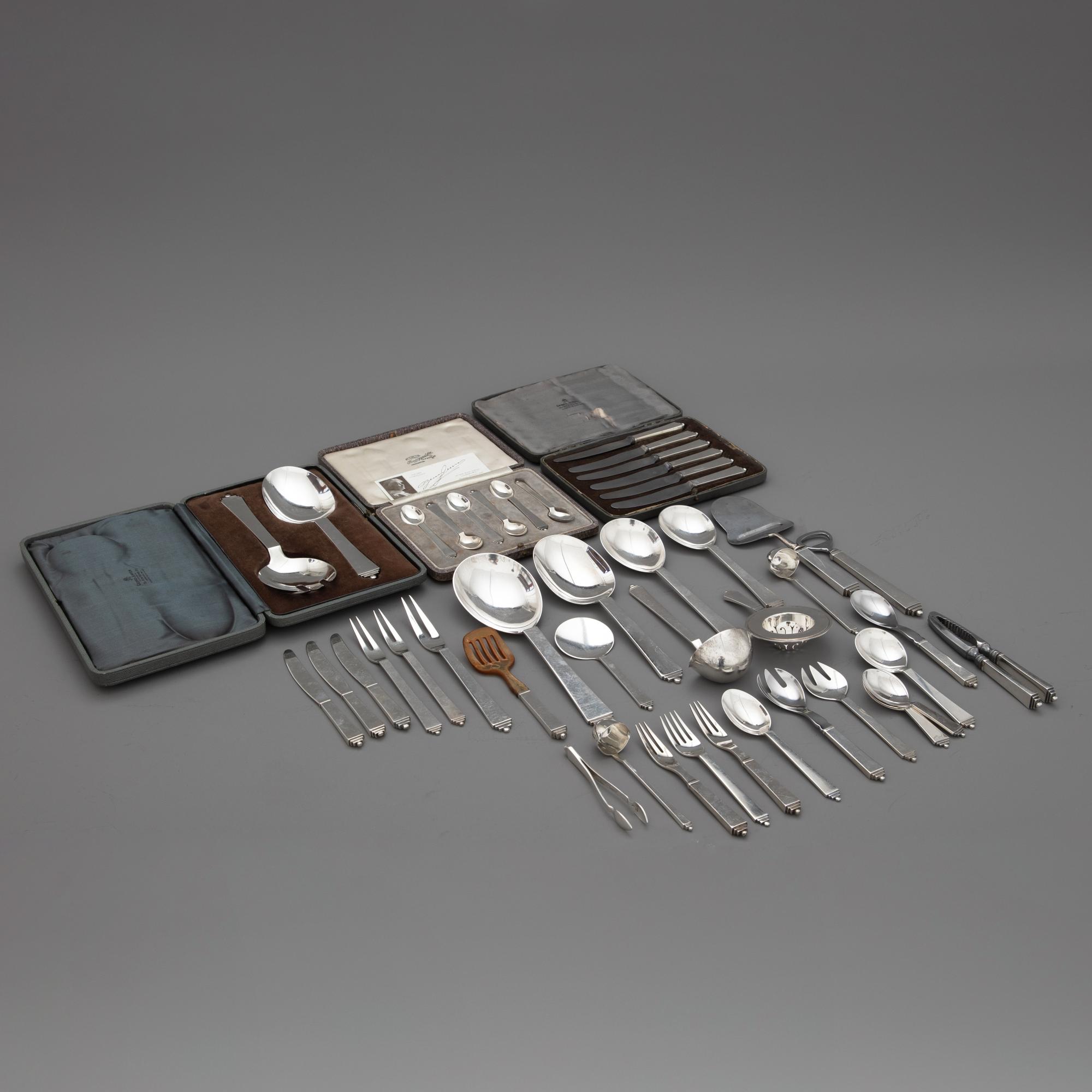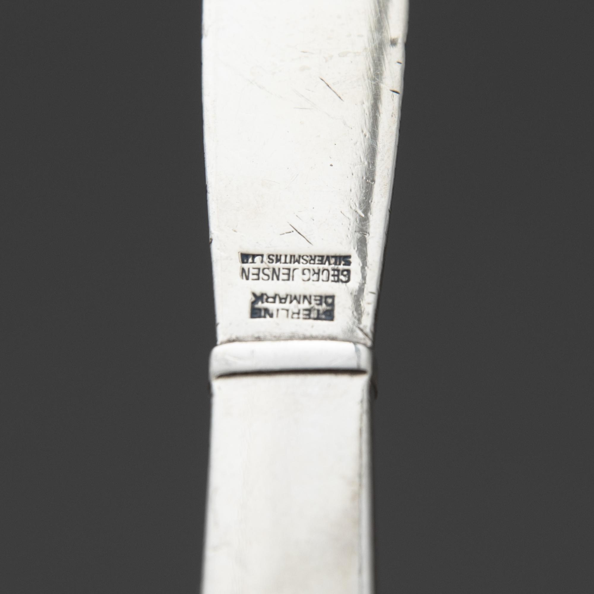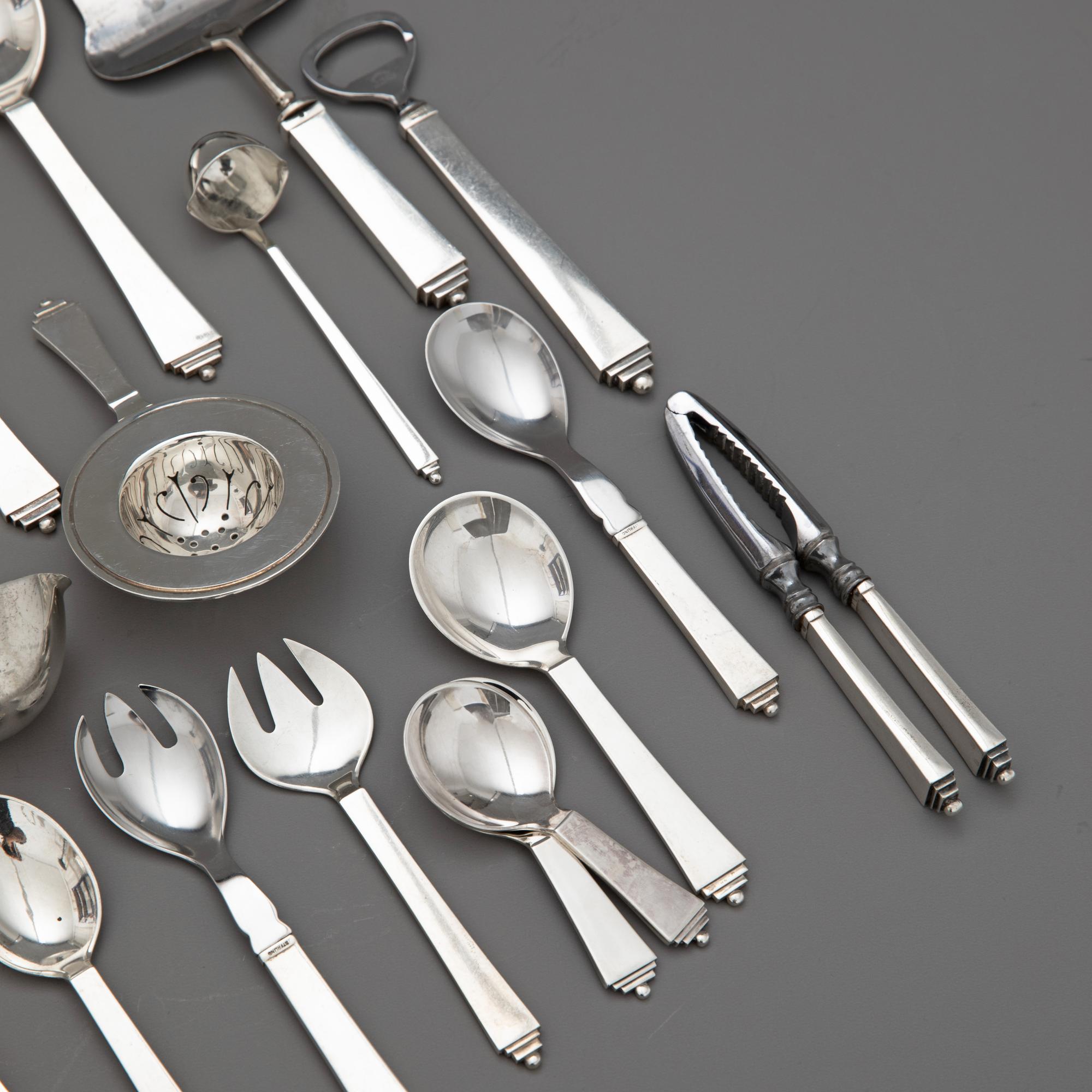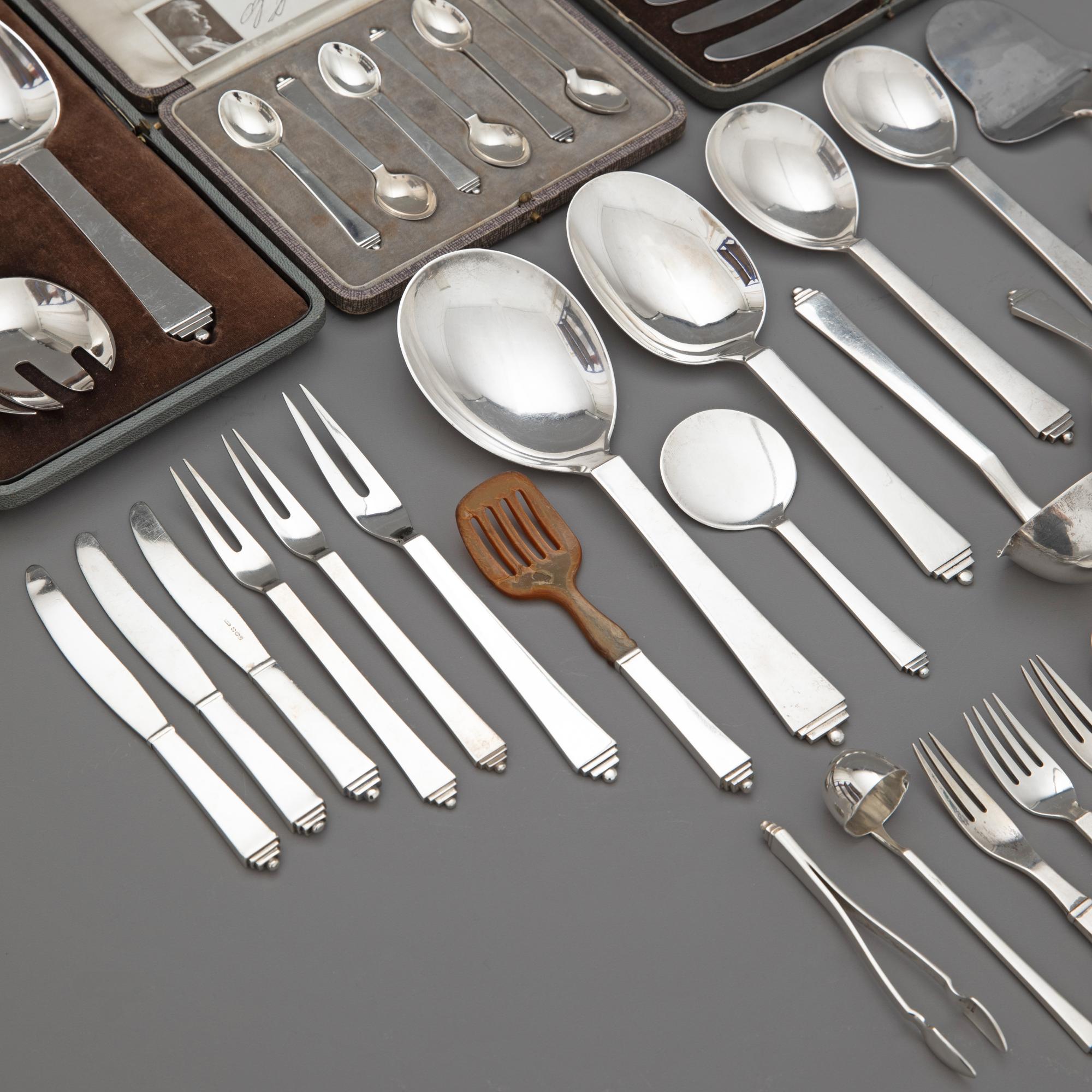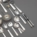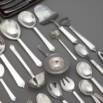Entwurf Harald Nielsen, 1926. Ausführung Georg Jensen. Unterschiedliche Fertigungszeiträume, 1926-1930, 1933-1944, 1945-1951, nach 1945. Sterlingsilber. Verschiedene Besteck- und Vorlegeteile, unter anderem 2-teiliges Servier-Set in Originalschatulle, Käsehobel, Nussknacker, Teesieb, Flaschenöffner und Zuckerzange. Ergänzend 6 Obstmesser in Originalschatulle und 6 kleine Löffelchen in Originalschatulle. 10-24,5 cm. Gewicht 1.644 g (ohne Besteckteile mit Edelstahlelementen). Jeweils bezeichnet mit Herstellermarke, STERLING, DENMARK. Teilweise mit Londoner Importpunze und britischer Punzenreihe.