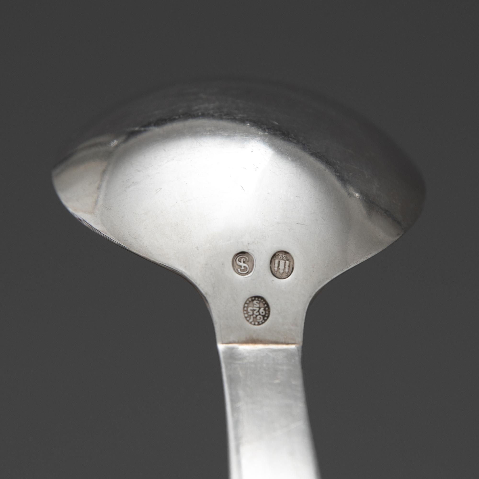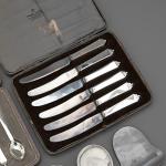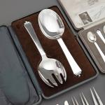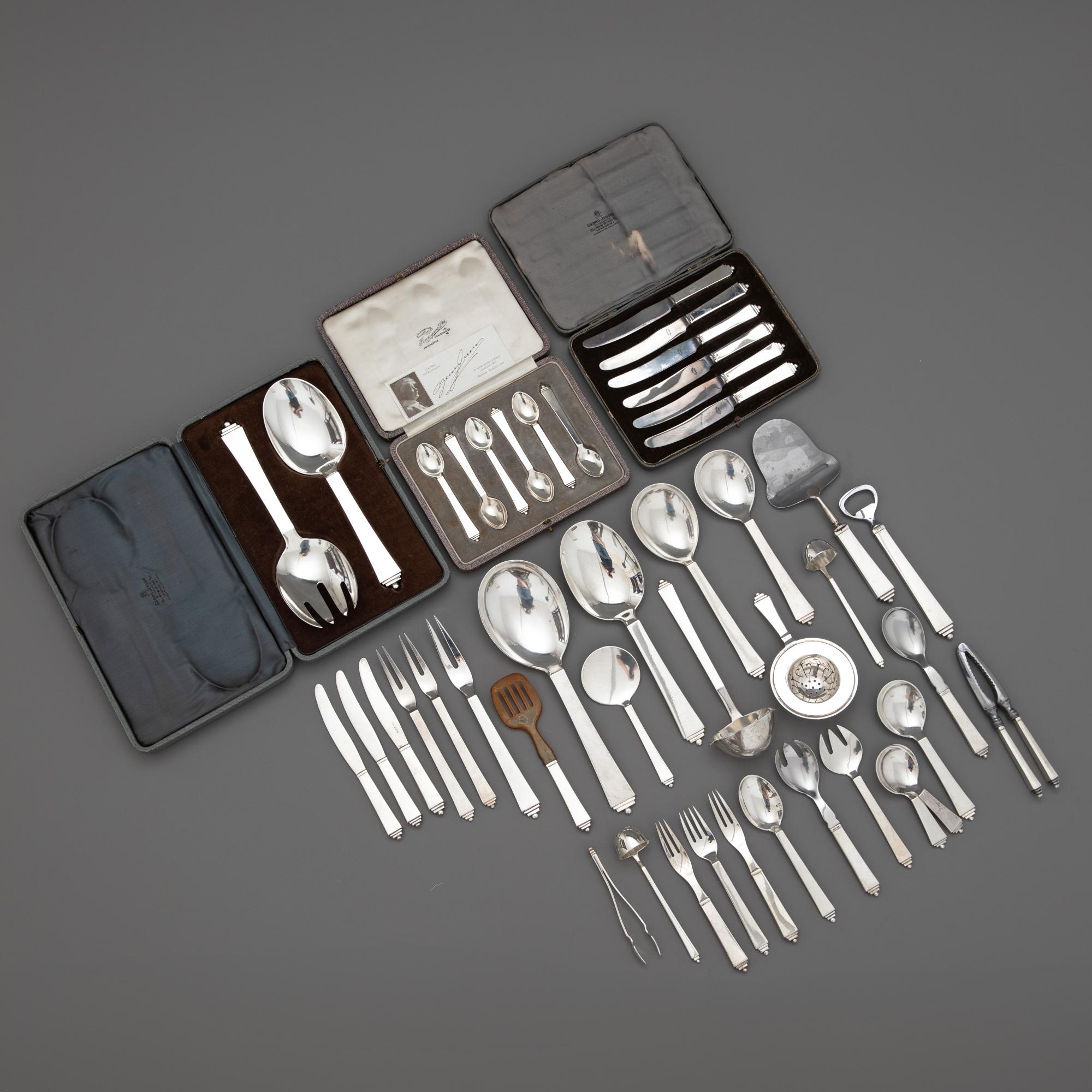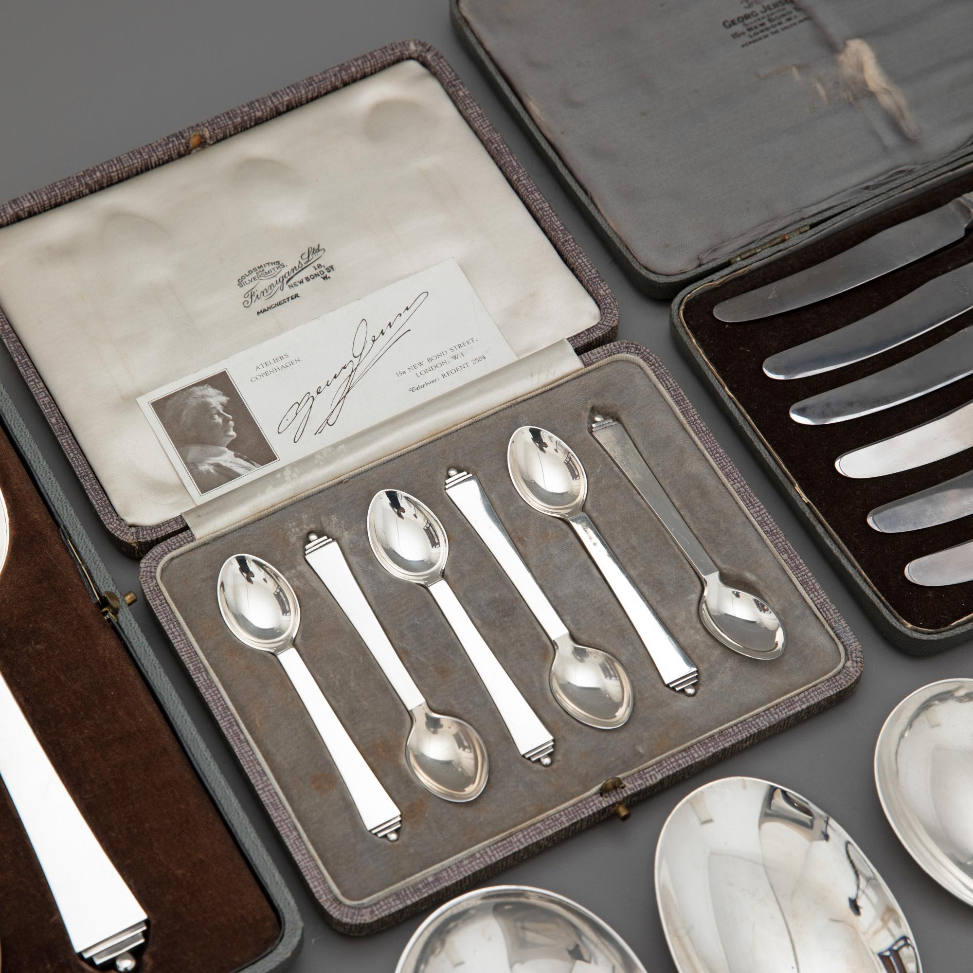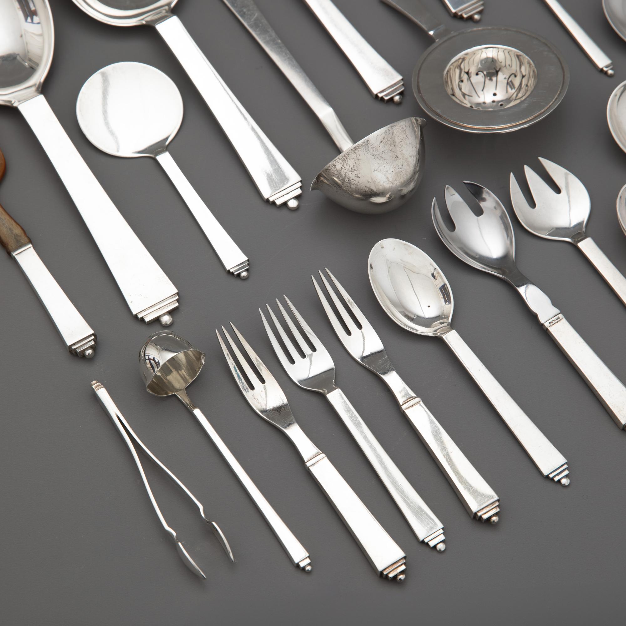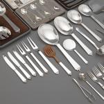 Entwurf Harald Nielsen, 1926. Ausführung Georg Jensen. Unterschiedliche Fertigungszeiträume, 1926-1930, 1933-1944, 1945-1951, nach 1945. Sterlingsilber. Verschiedene Besteck- und Vorlegeteile, unter anderem 2-teiliges Servier-Set in Originalschatulle, Käsehobel, Nussknacker, Teesieb, Flaschenöffner und Zuckerzange. Ergänzend 6 Obstmesser in Originalschatulle und 6 kleine Löffelchen in Originalschatulle. 10-24,5 cm. Gewicht 1.644 g (ohne Besteckteile mit Edelstahlelementen). Jeweils bezeichnet mit Herstellermarke, STERLING, DENMARK. Teilweise mit Londoner Importpunze und britischer Punzenreihe.