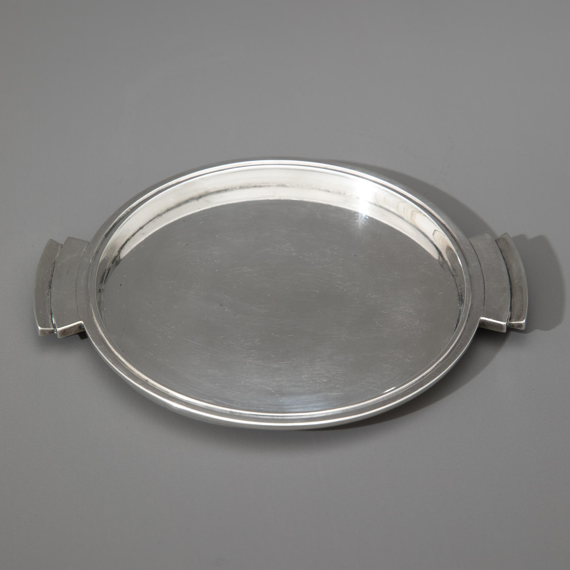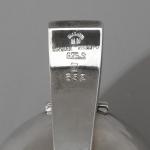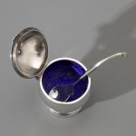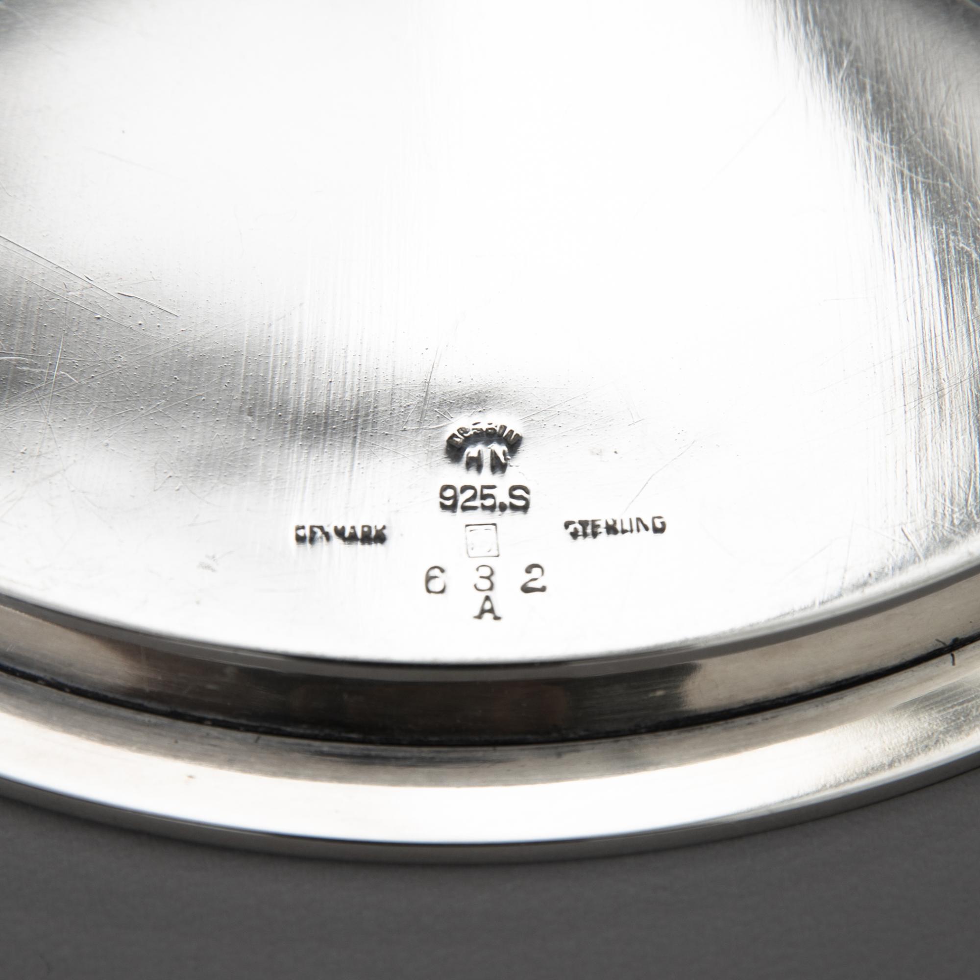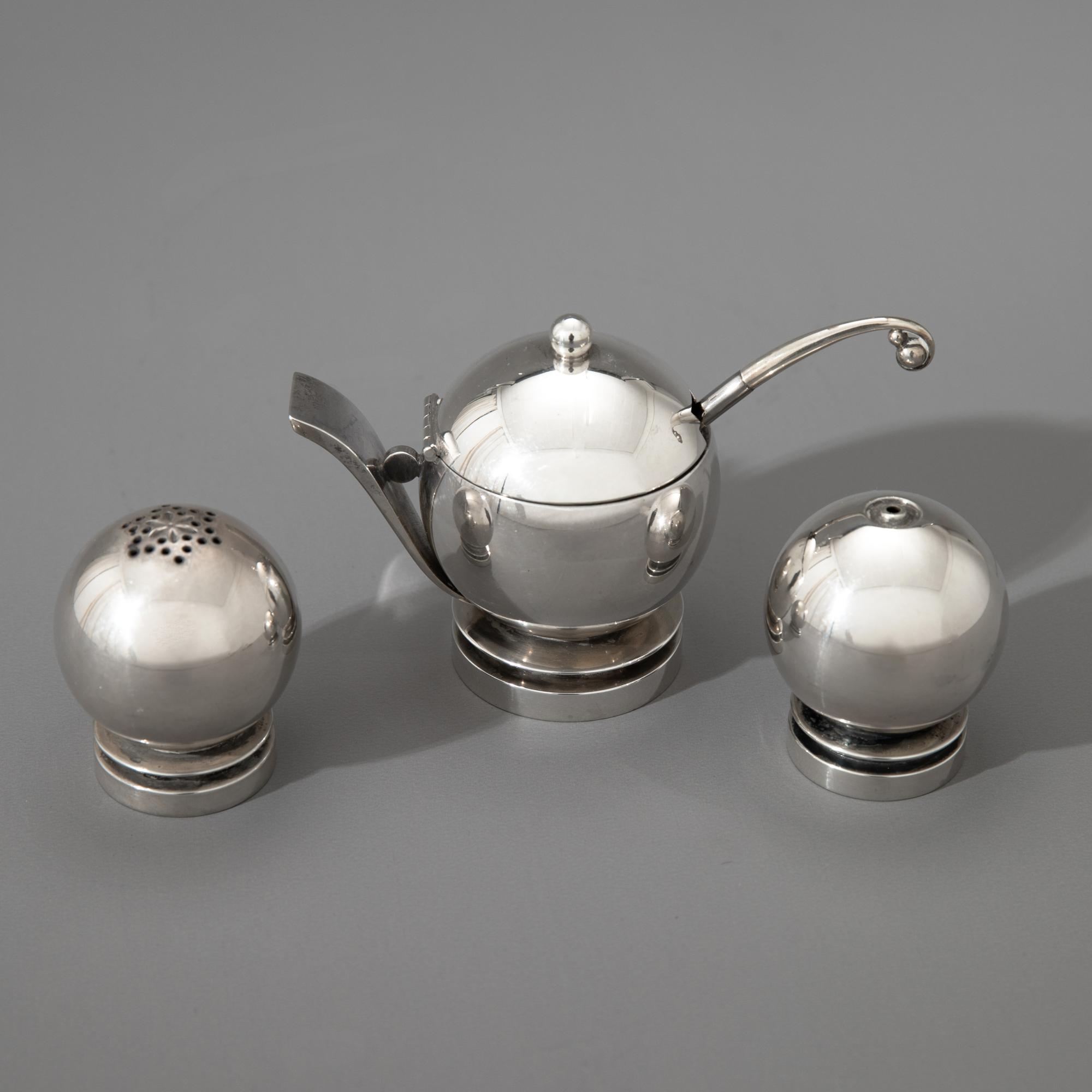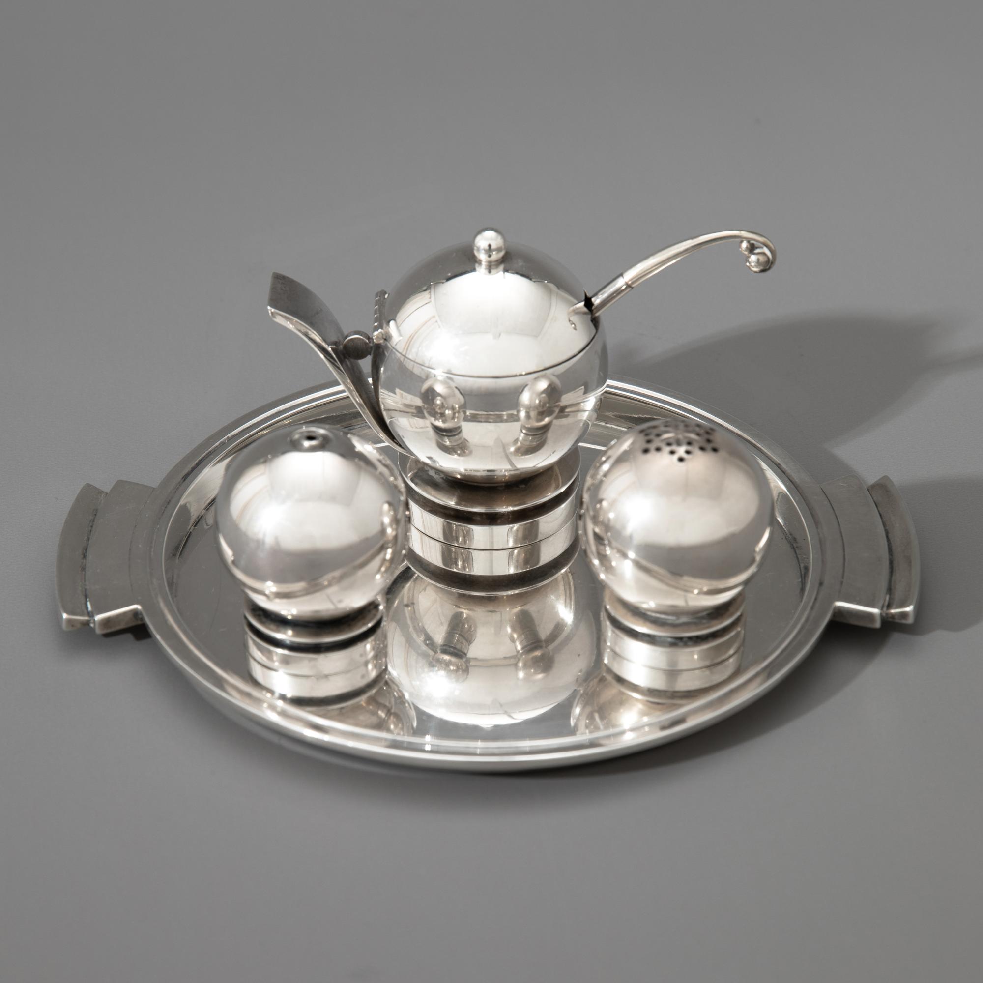 Senftopf mit Löffel, Pfeffer- und Salzstreuer auf Tablett. Entwurf: Harald Nielsen. Sterlingsilber, blaues Email. Insgesamt 392 Gramm. H. 4,5-6,5 cm, 17,2 x 14,2 cm; L. 8,3 cm. Ausführung: 1933-44. Gestempelt: Werkstattmarken, 925S, 632, DESSIN HN.