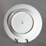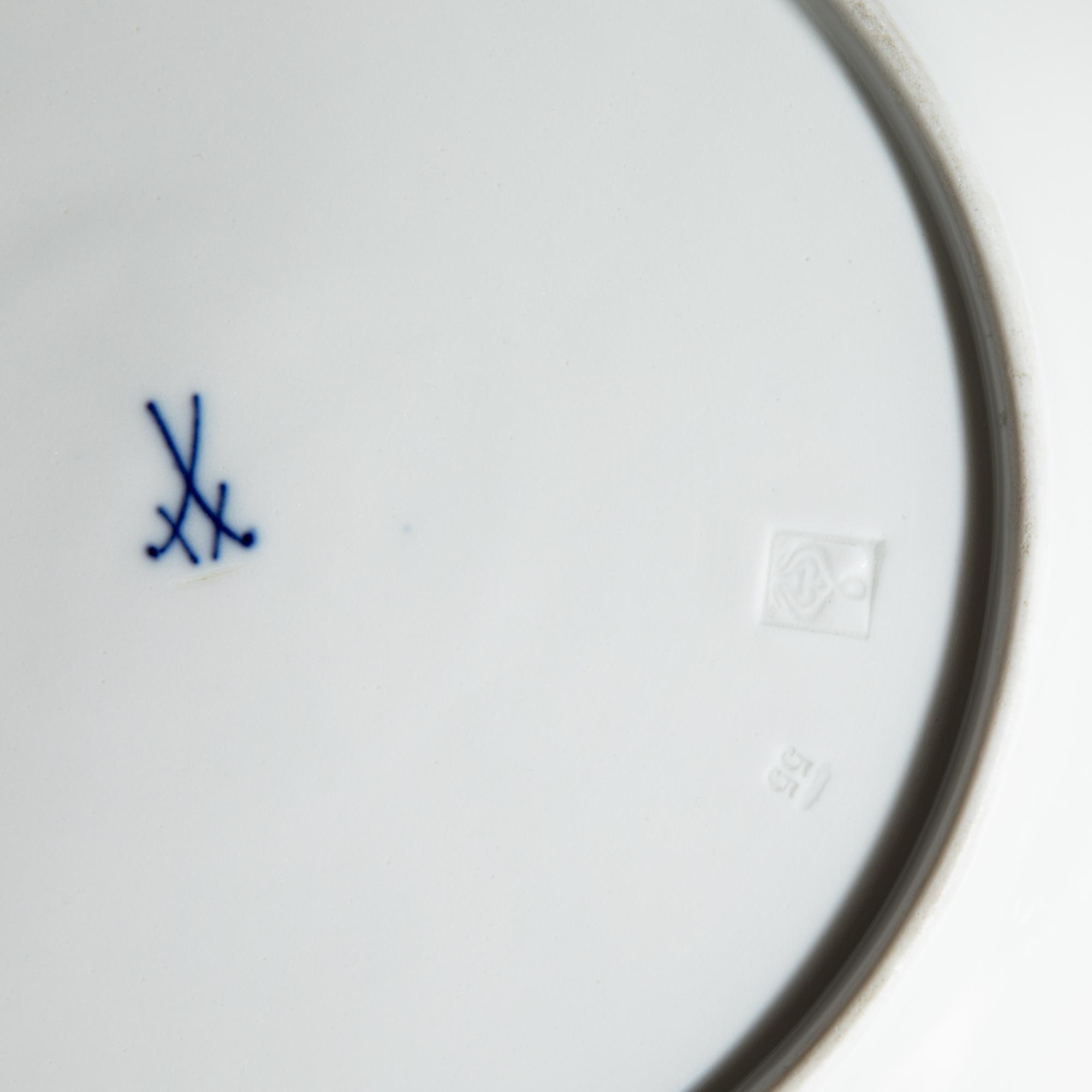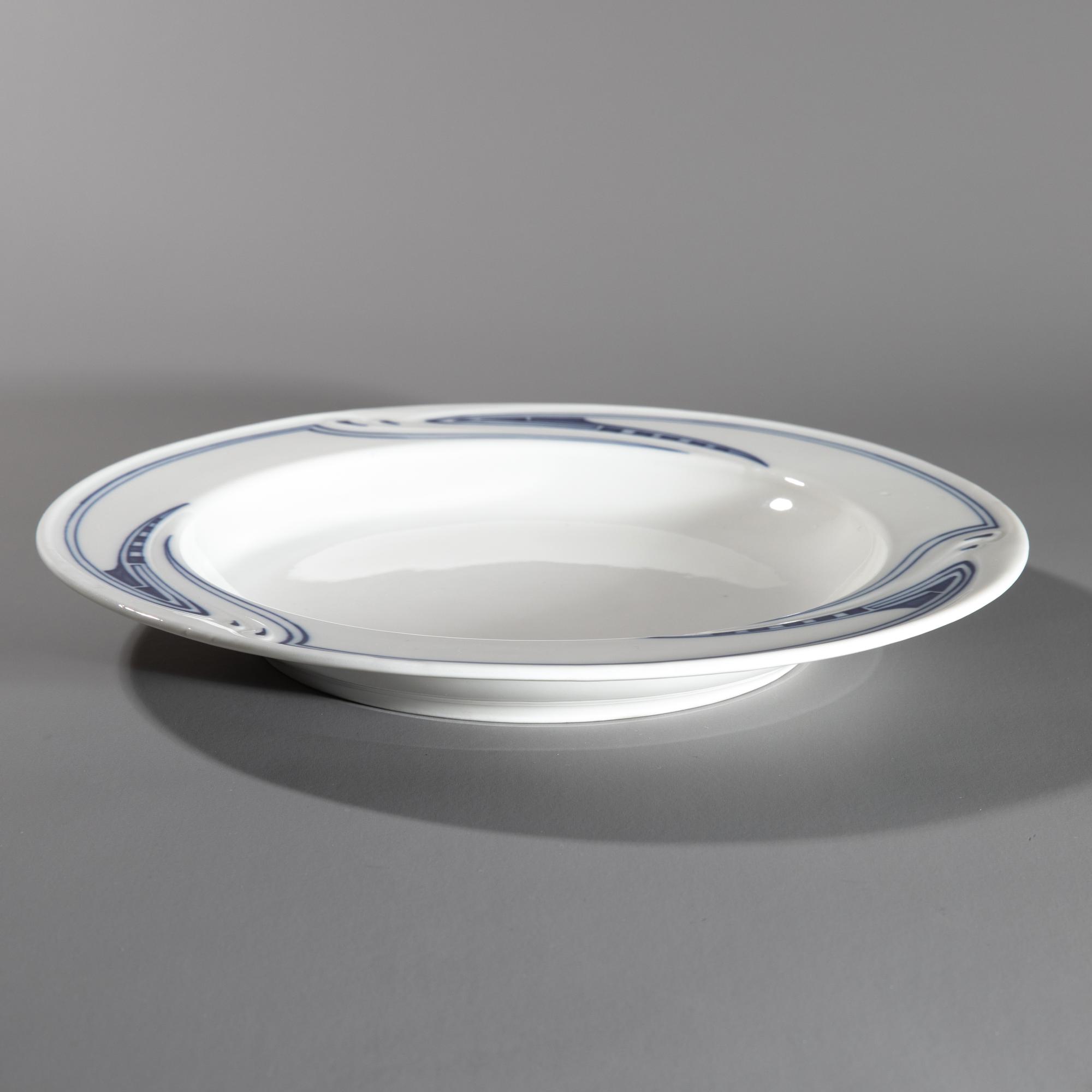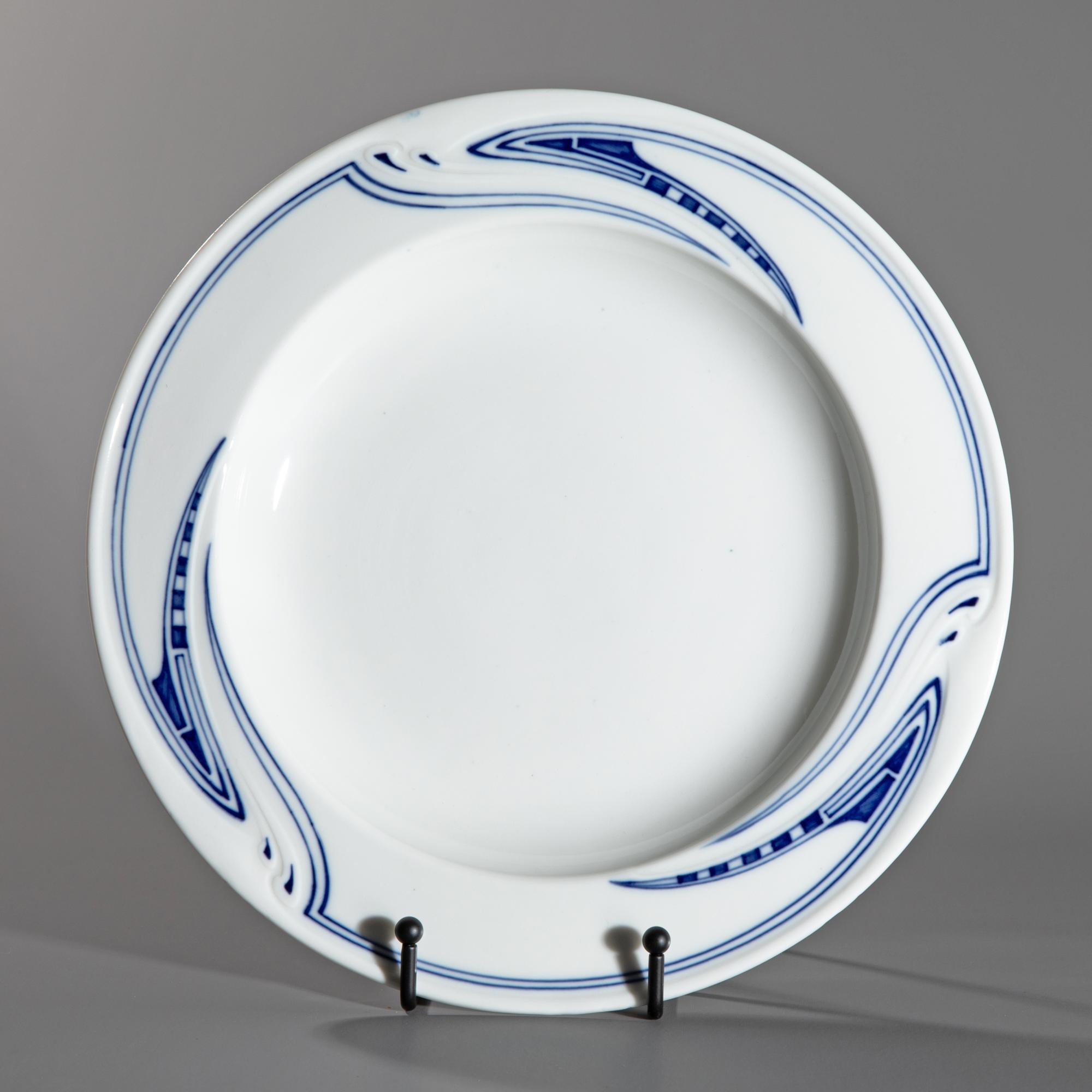 Entwurf Henry van de Velde, 1903, Ausführung Porzellanmanufaktur Meißen. D. 26 cm. Aus dem Tafelgedeck 'van de Velde'. Porzellan mit kobaltblauer Unterglasurmalerei. Peitschenhiebdekor. Unterseitig bezeichnet mit Schwertermarke und '52' (blau, Unterglasur), Künstlersignet und '55'.