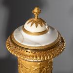Alabaster und vergoldete Bronze. Urne mit Glockendeckel und Fruchtknauf auf quadratischem, einfach abgestuften Sockel. Gefäß mit umlaufendem Reigen aus girlandentragenden Frauen und Putti. Sockel mit aufgelegten Hermesmasken. Ein Deckel gebrochen und alt. Restauriert. H. 47 cm.