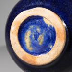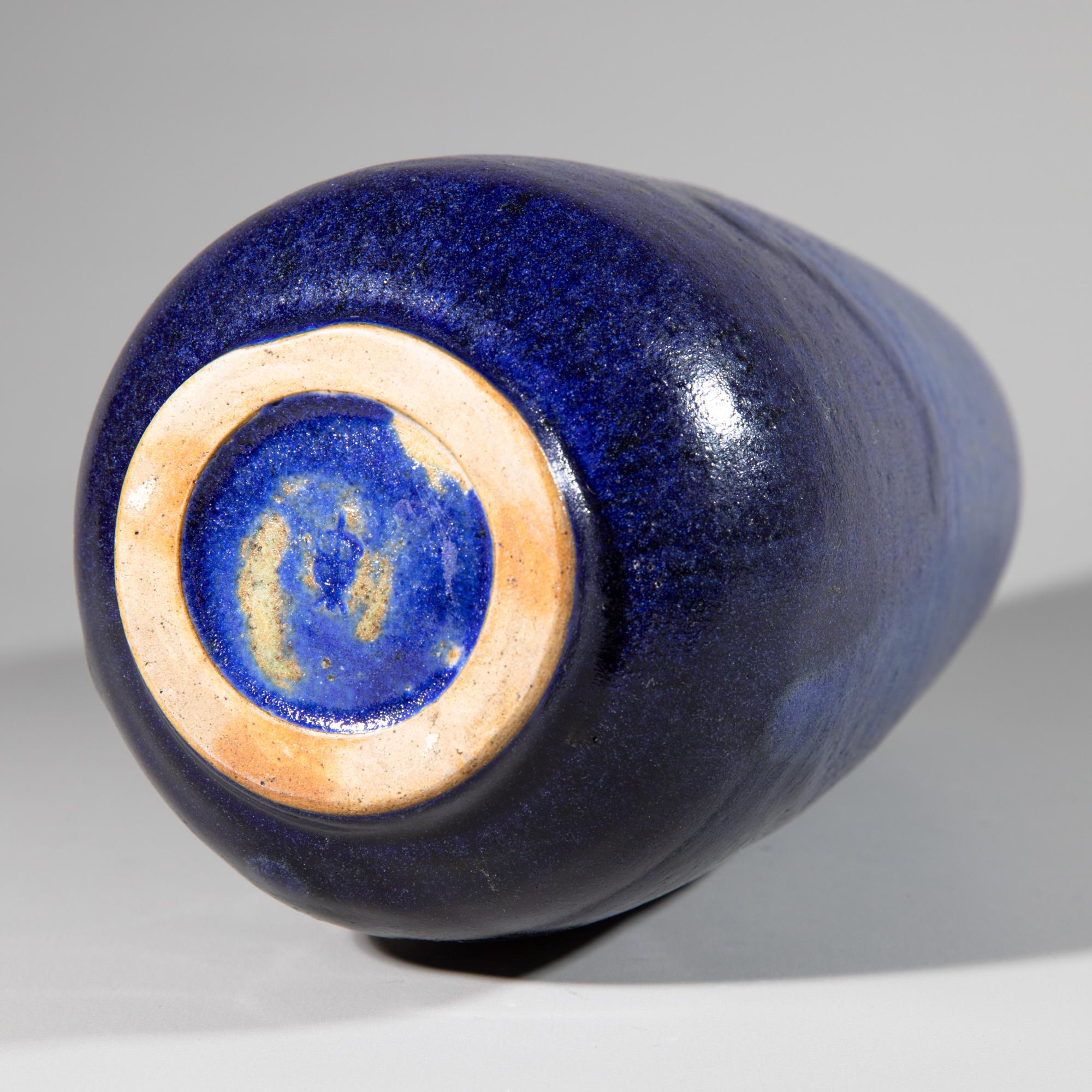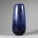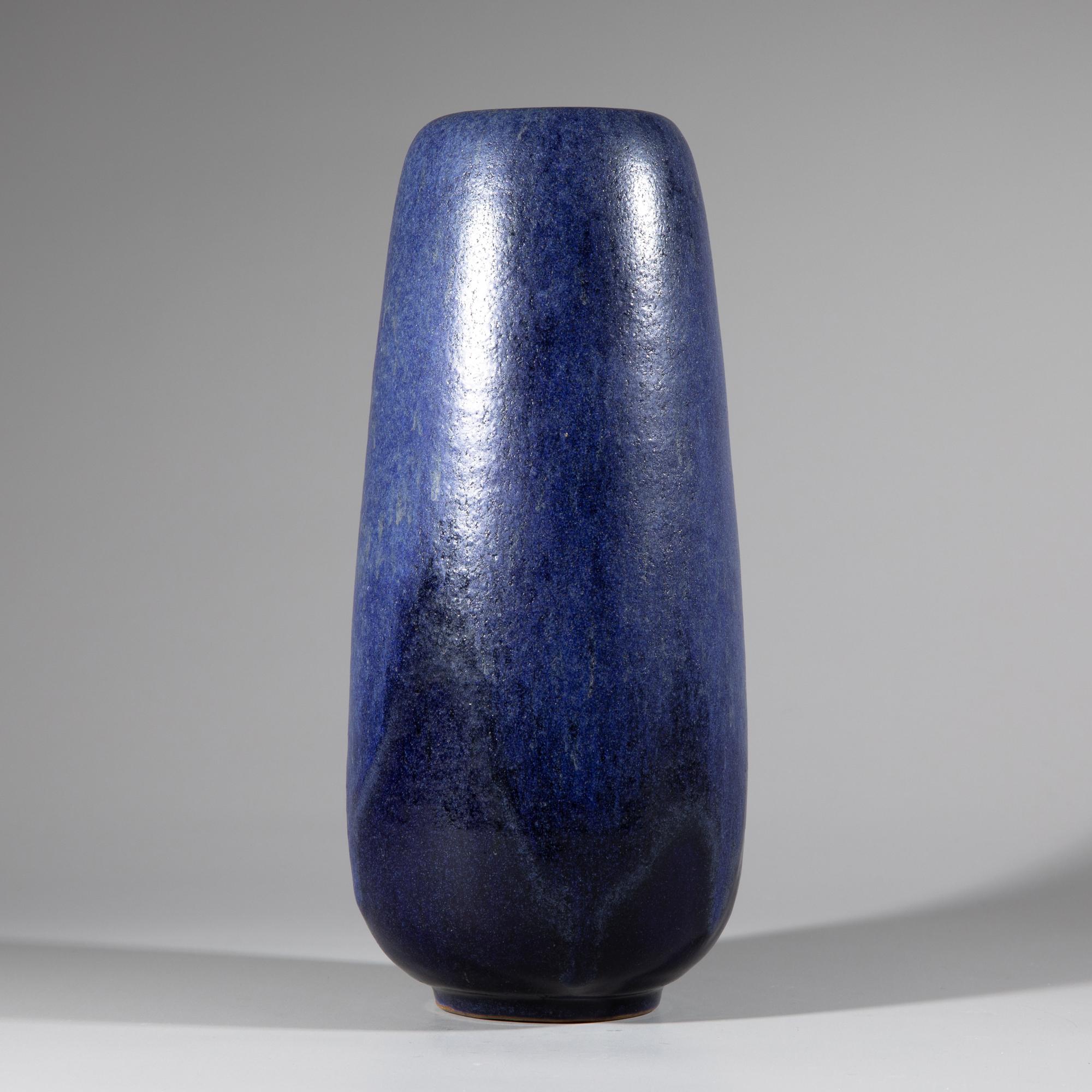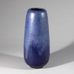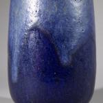 Keramik. Hohe Vase mit rundem Stand und blauer Überlaufglasur. H. 29 cm, D. 12 cm. Unterseitig bezeichnet mit Künstlermonogramm.