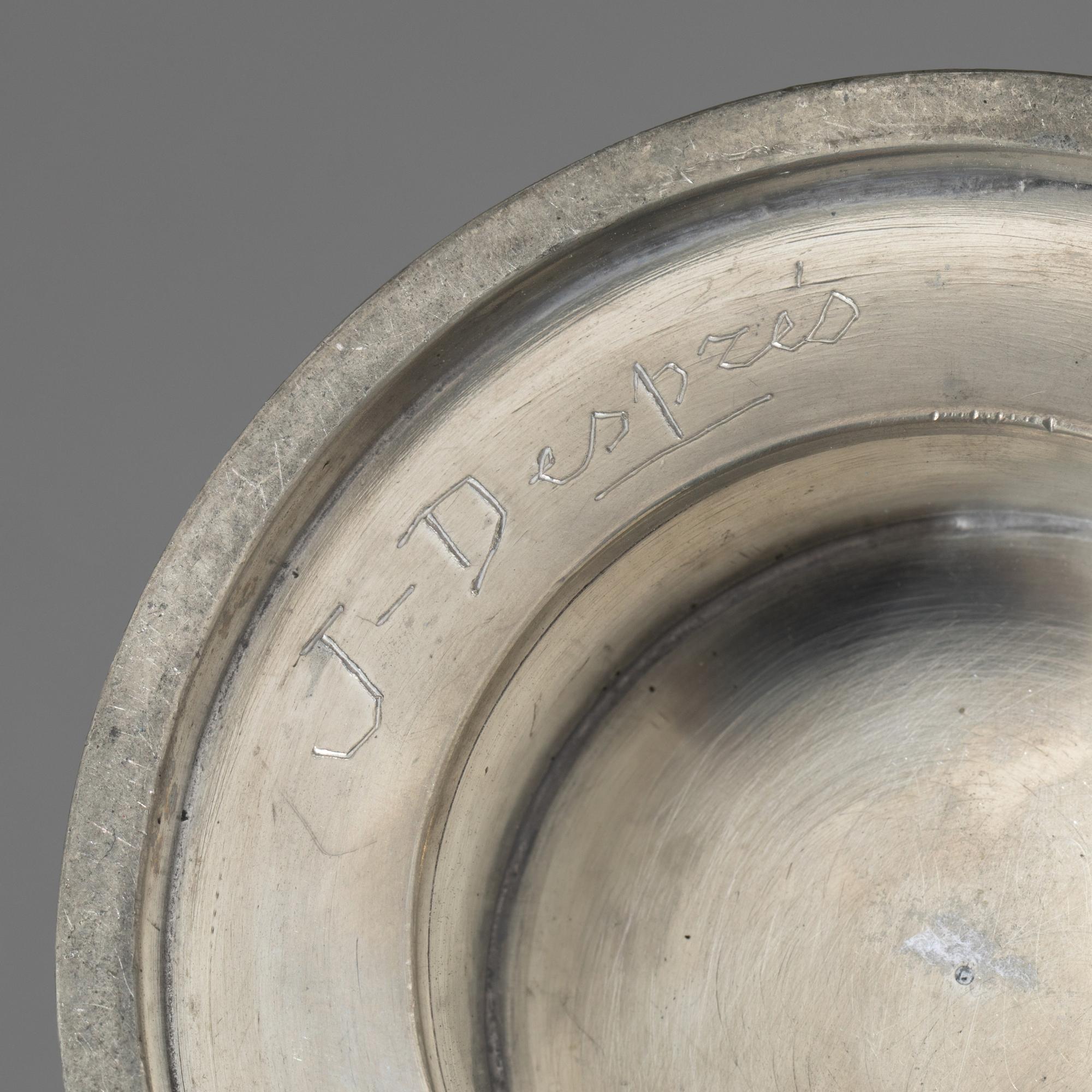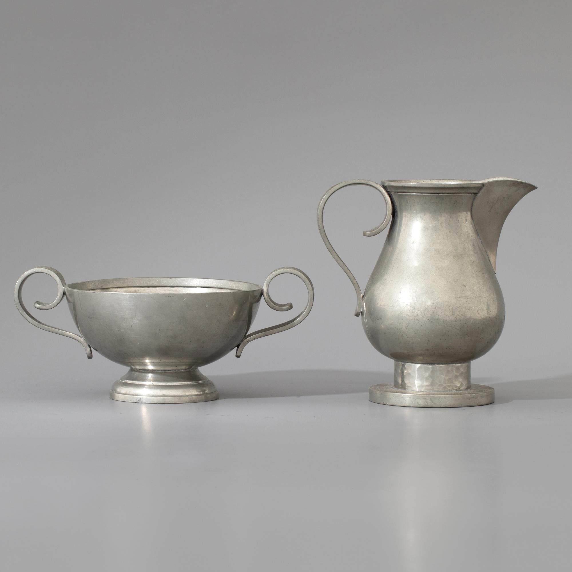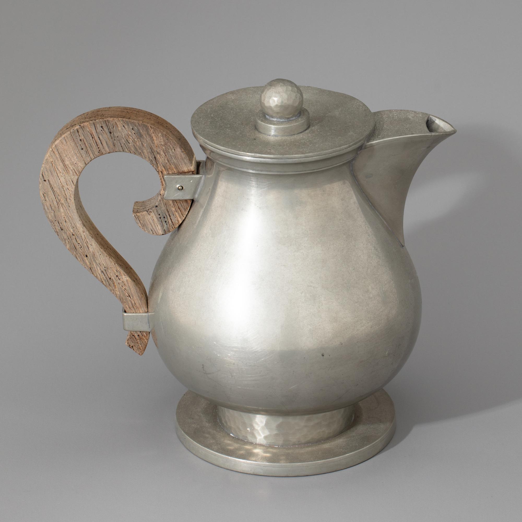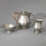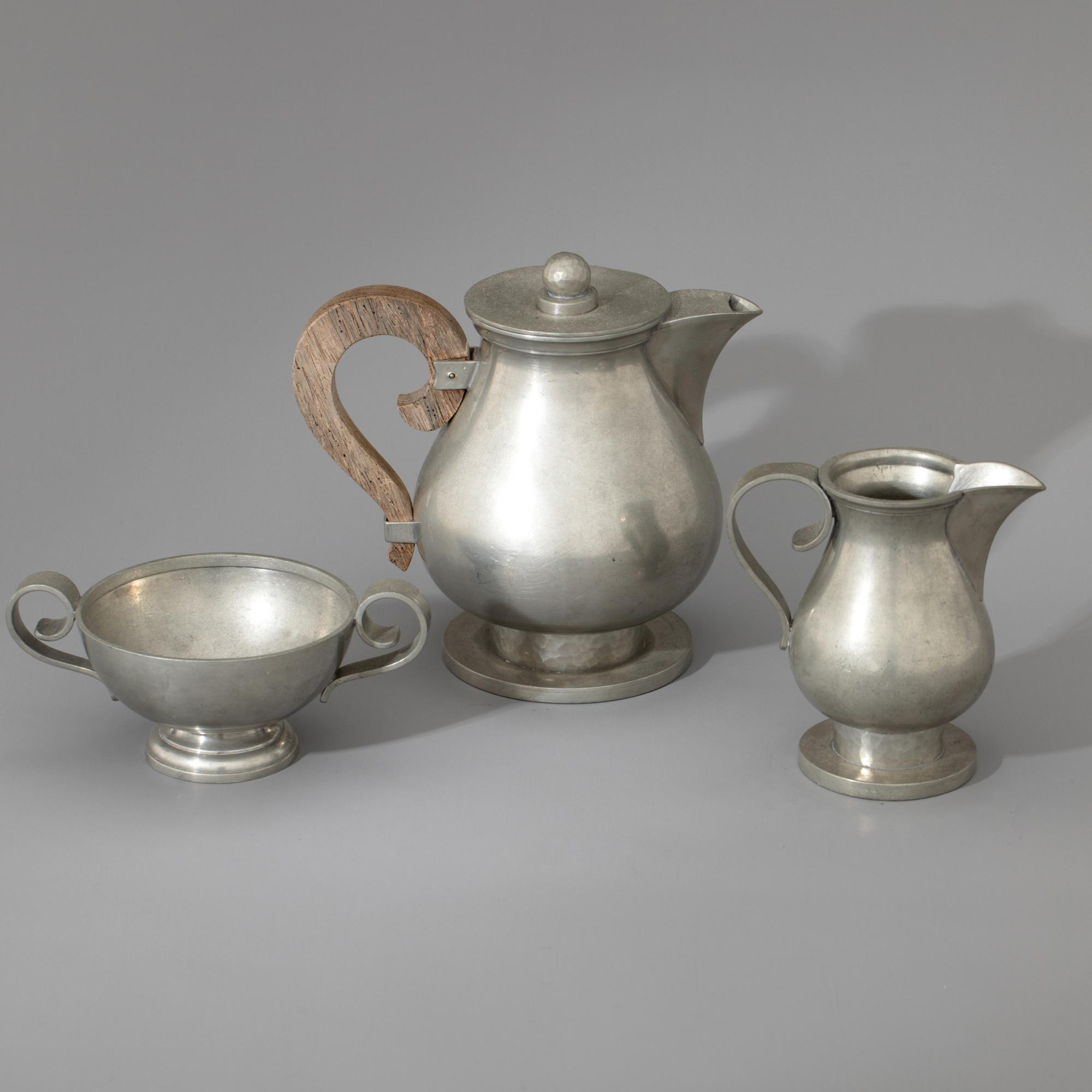 Kernstücke: Kaffeekanne, Milchkanne, Zuckerschale. H. 7,5-18 cm. Zinn. Holzgriff. Sign.: J. Després (geritzt).