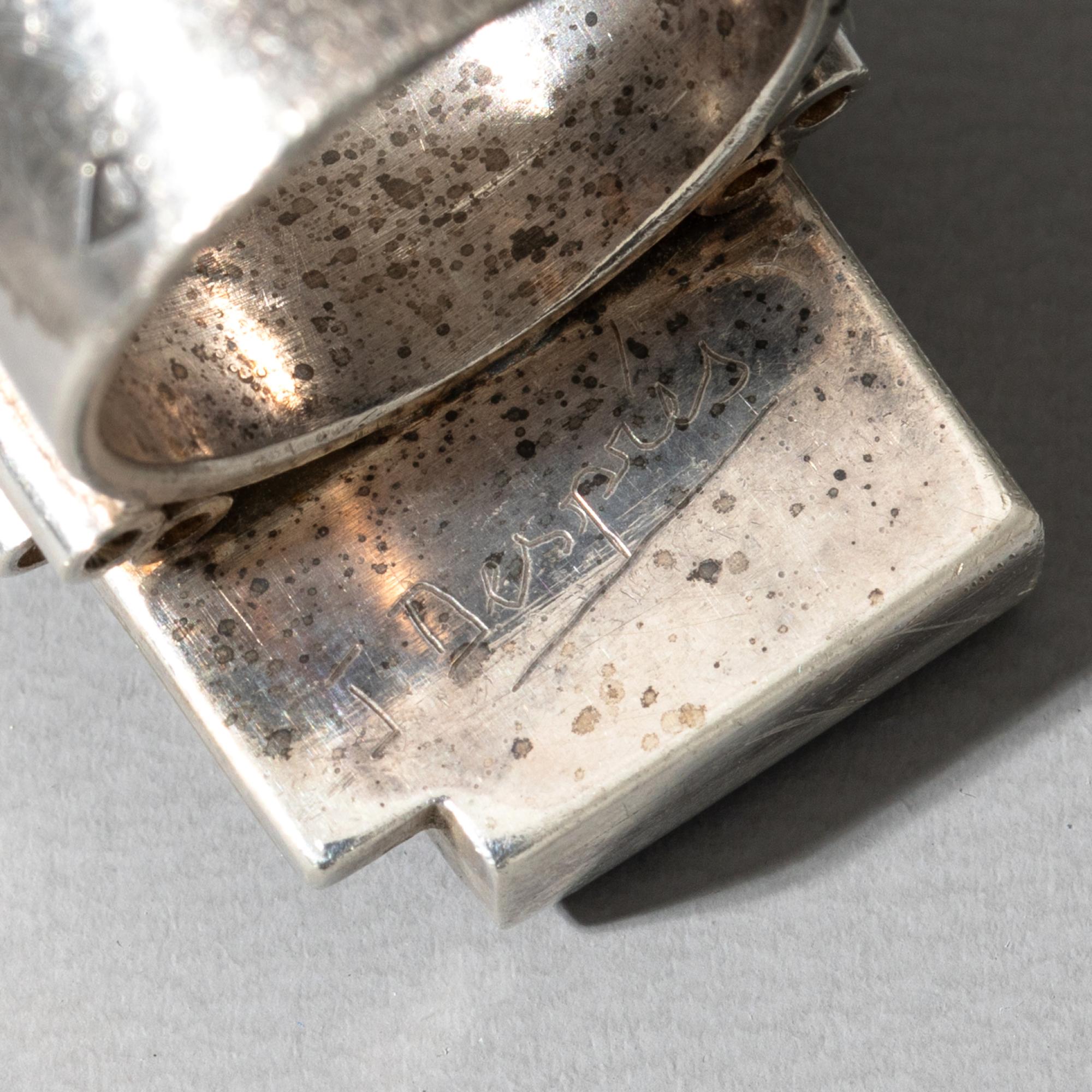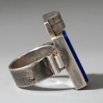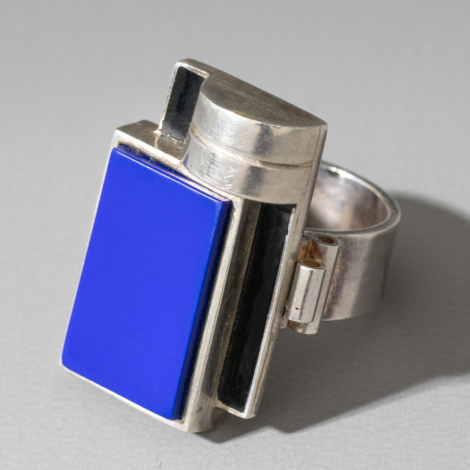 Silber, blauer Achat, schwarzer Lack. Insgesamt 20 Gramm. Innendurchmesser 16 mm. Bez.: J. Després. 27 x 21 x 26 cm. Gestempelt: Werkstattmarke (2x), Eberkopf.