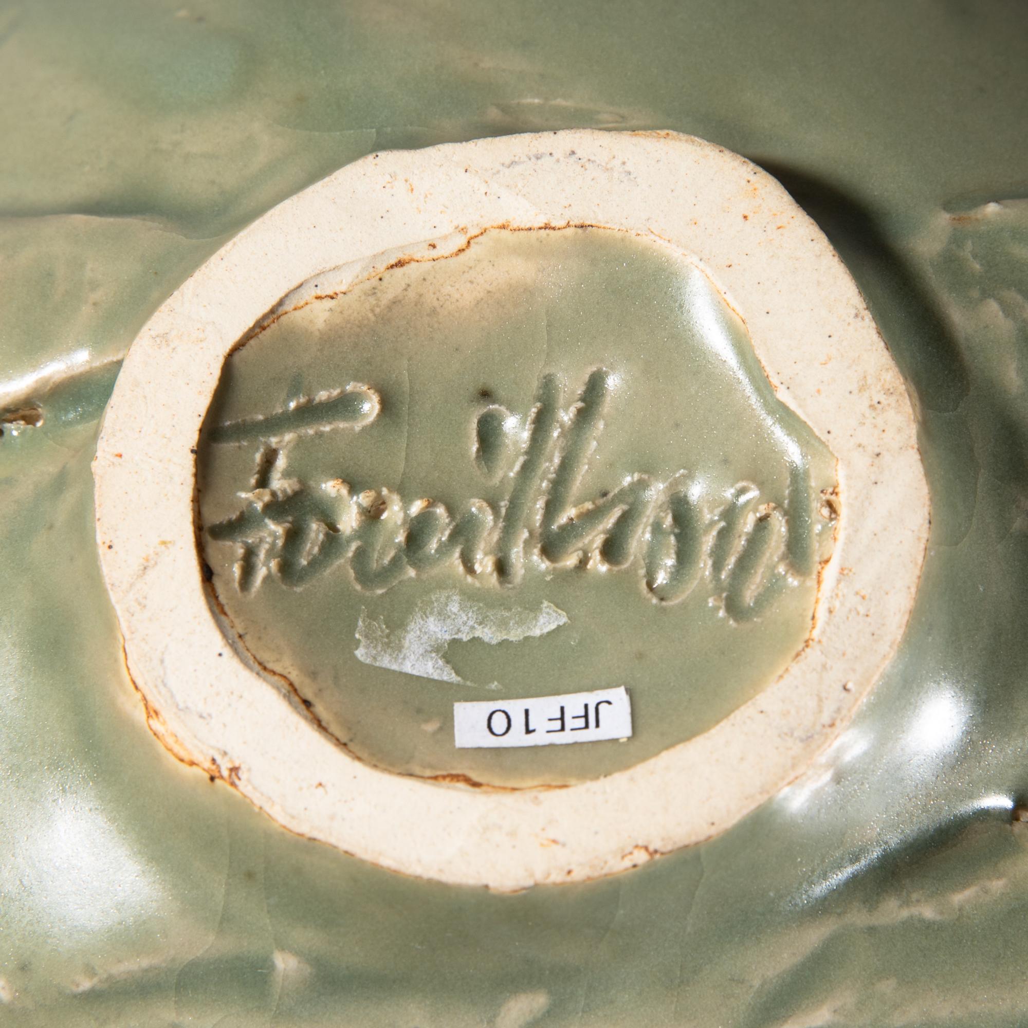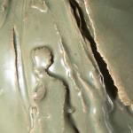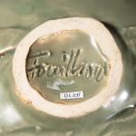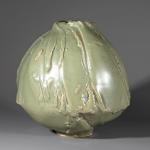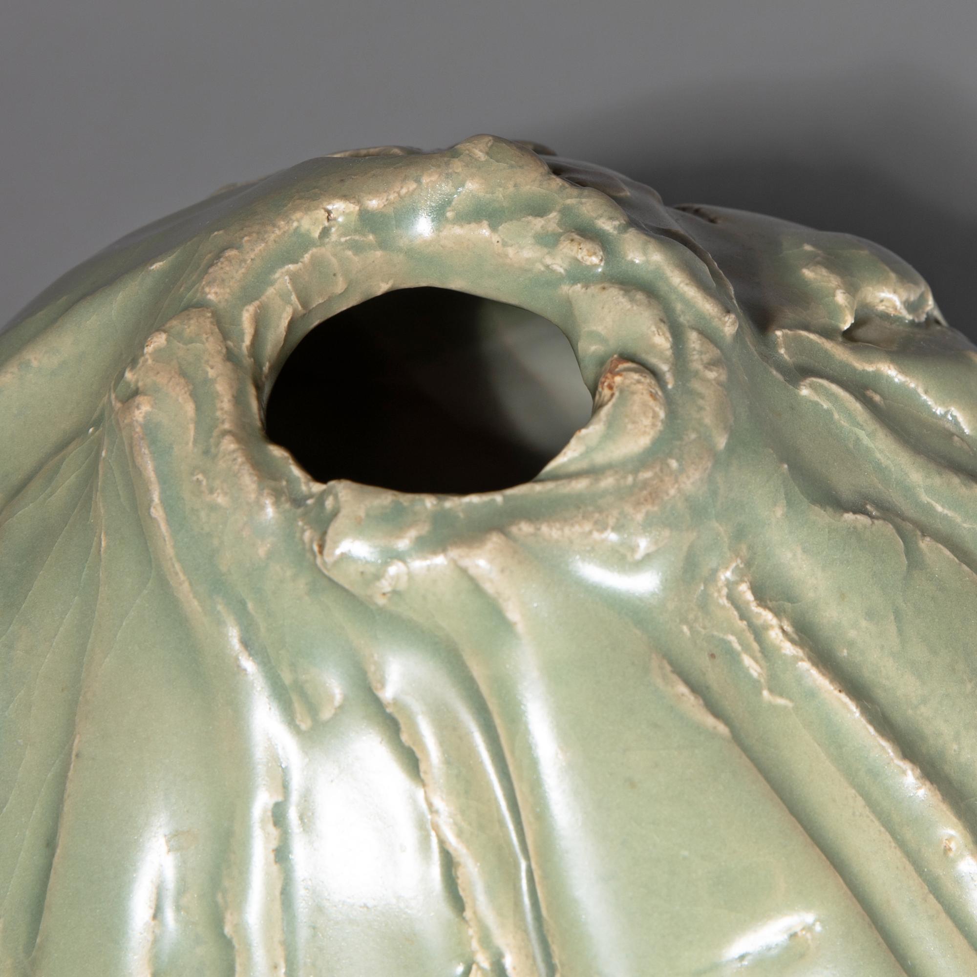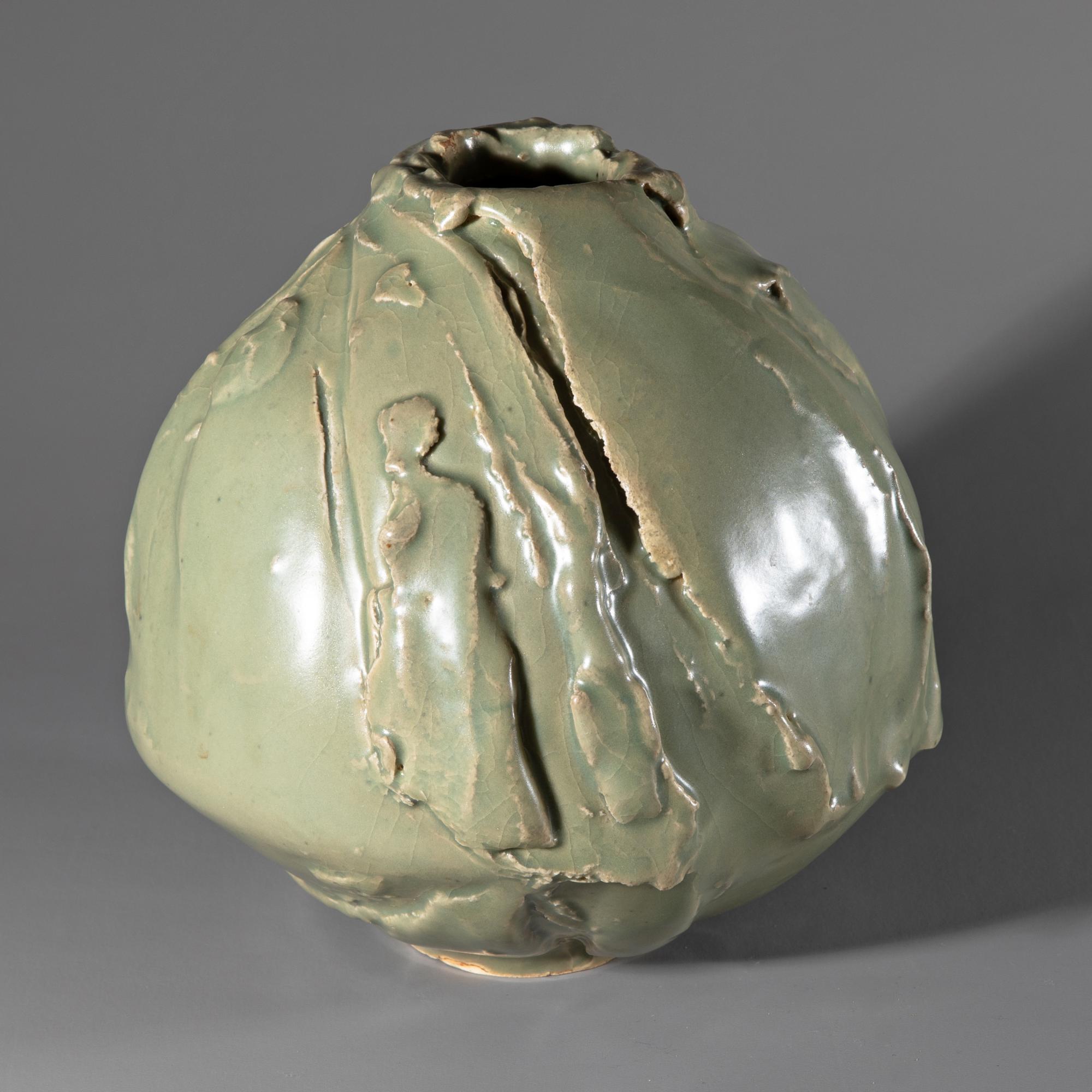 Keramik, strukturierte Wandung grünlich glasiert. H. 21 cm, D.21 cm. Unterseitig bezeichnet mit Ritzsignatur.