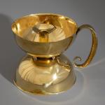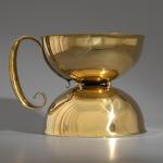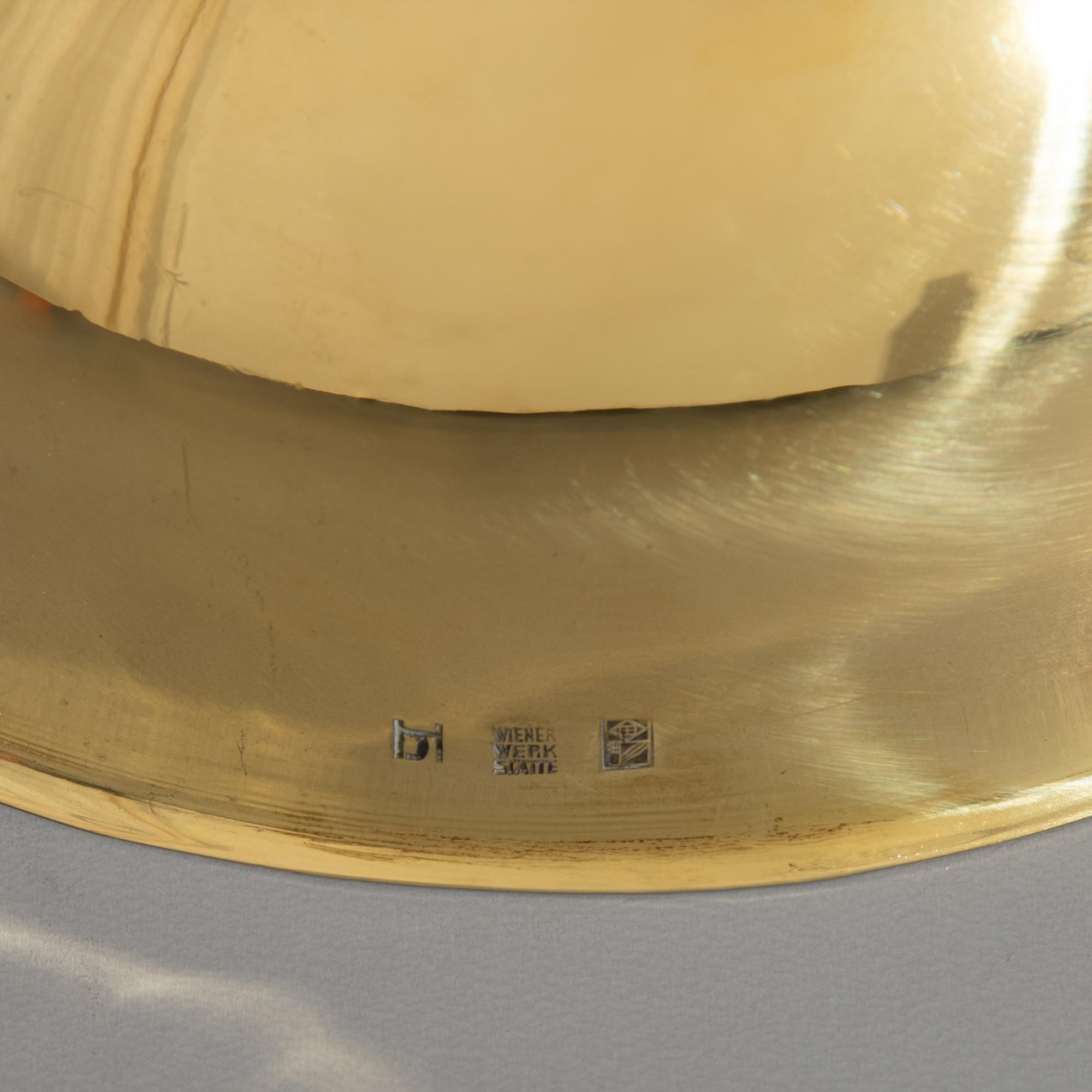 Entwurf Josef Hoffmann, 1911. Ausführung Wiener Werkstätte 1911. Kerzenleuchter M 1792. Messing. Der prachtvolle Leuchter besteht aus zwei umgekehrt aufeinander gesetzten Halbkugeln, die durch vier kleine Kugelelemente miteinander verbunden sind. In der oberen Schale befindet sich ein zylindrischer Einsatz mit Tülle für die Kerze. Ergänzt wird das Stück durch einen bandartig, geschwungenen und unten eingerollten Griff. 15,5 x 22 x 16,8 cm. Das Objekt ist am unteren Rand punziert mit Künstlermonogramm (JH) und zwei Punzen der Wiener Werkstätte (Rosenmarke und dreizeilige Wortmarke).