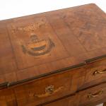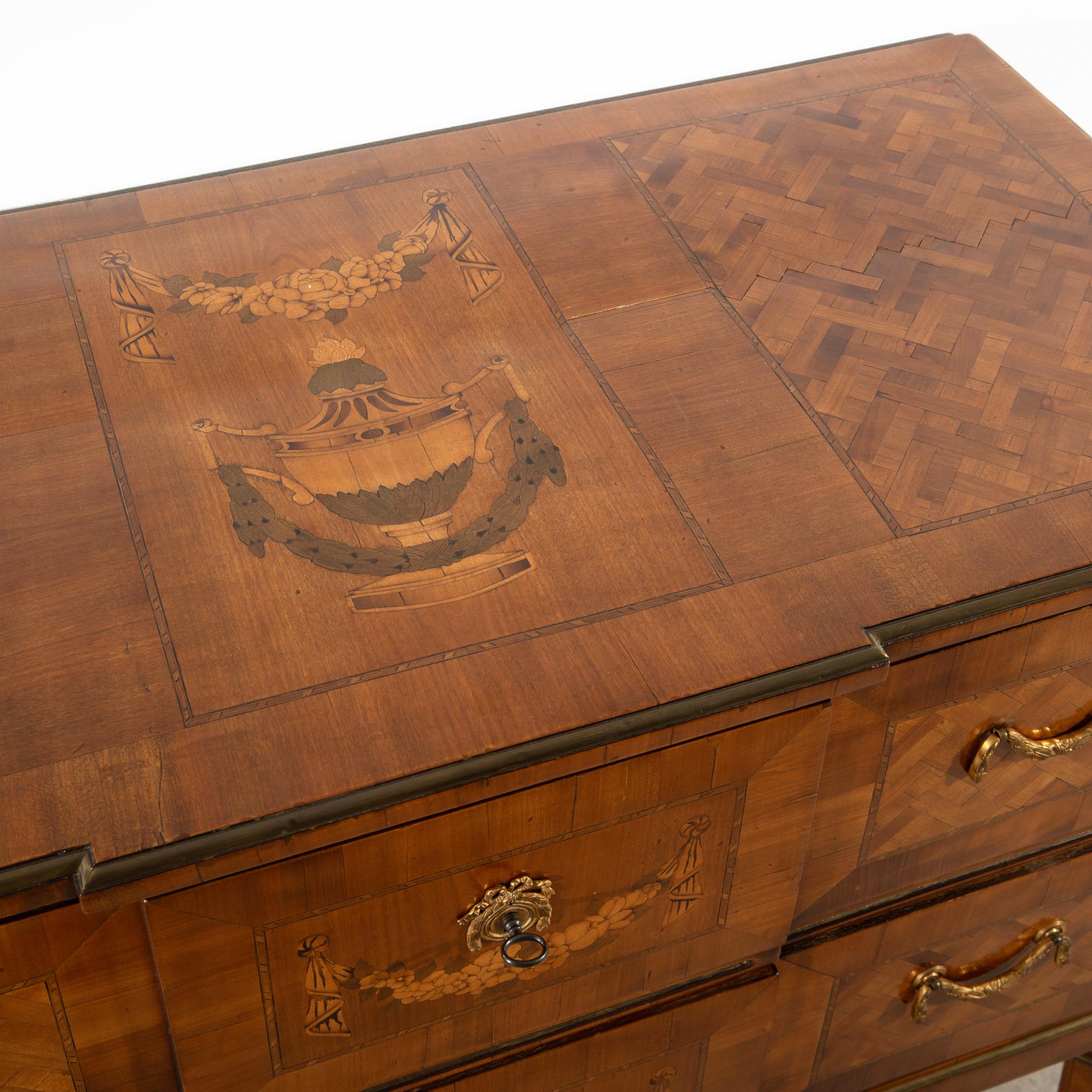 eingelegte Blütengirlanden, die Deckplatte mit einem zentralen Vasenmotiv.