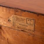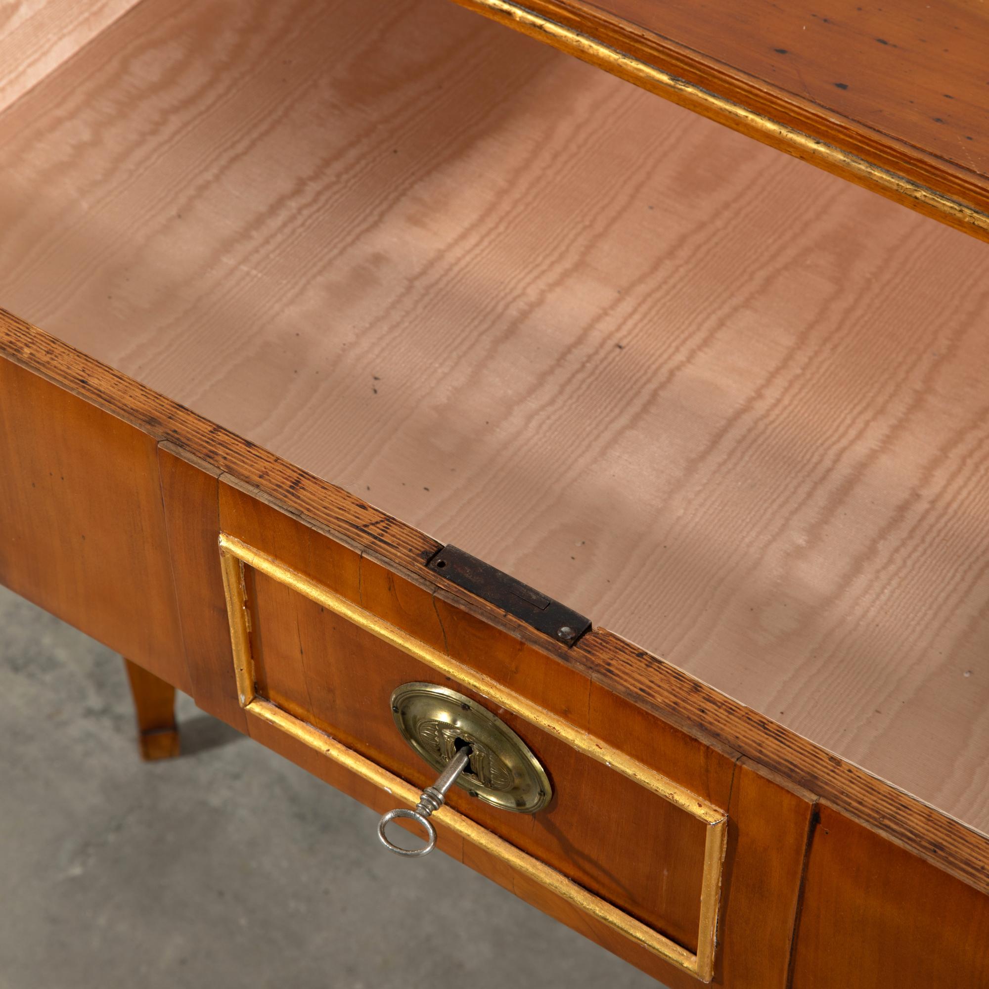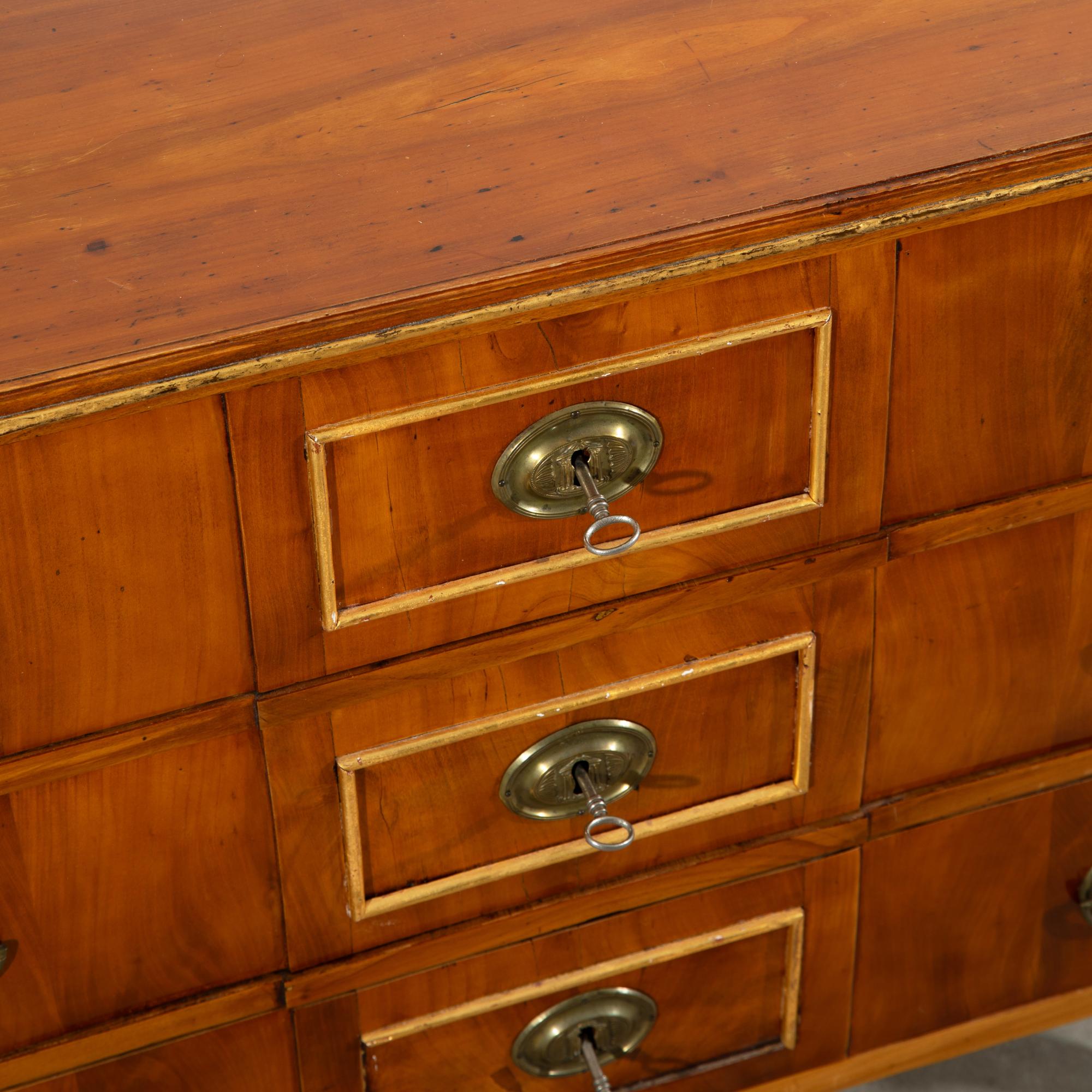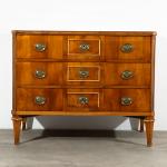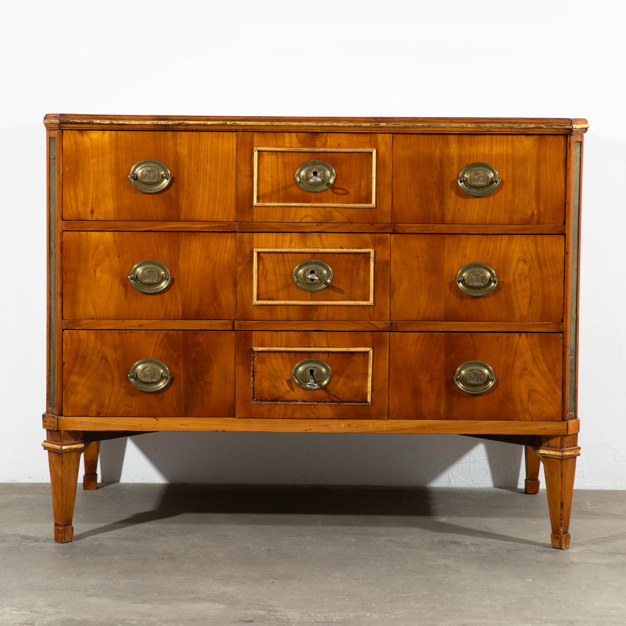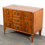 Kirschbaum auf Weichholz furniert. Gerader, querrechteckig angelegter Korpus, flankiert von abgeschrägten Ecklisenen, auf schräggestellten konischen Vierkantfüßen. In der gegliederten Front drei breite Schubladen, durch flachen Mittelrisalit verbunden, dieser zusätzlich durch mit vergoldeten Messingleisten eingefasste rechteckige Felder betont. Leicht überstehende Deckplatte. Messingbeschläge. 82 x 101 x 55 cm.
