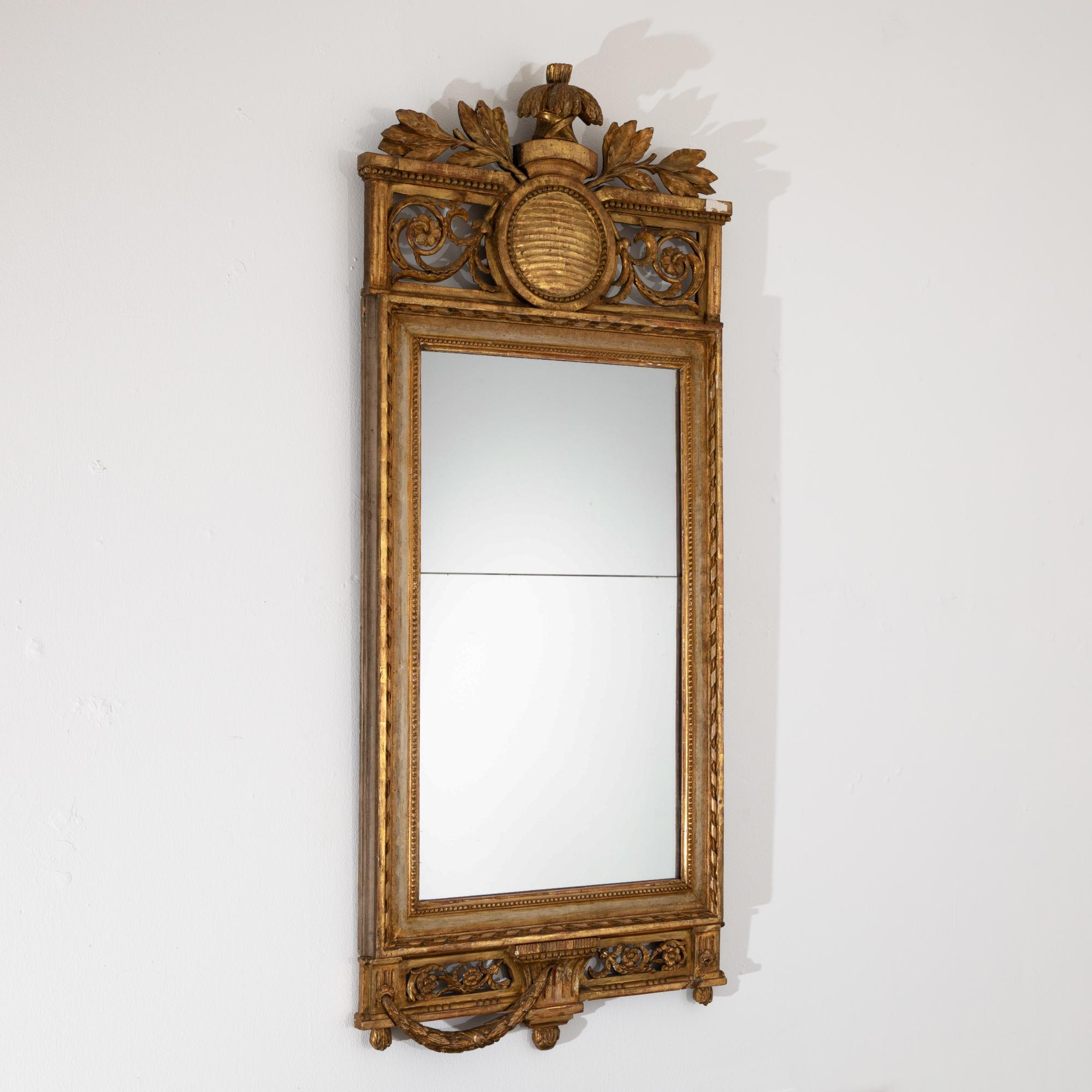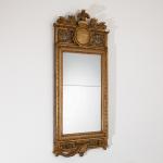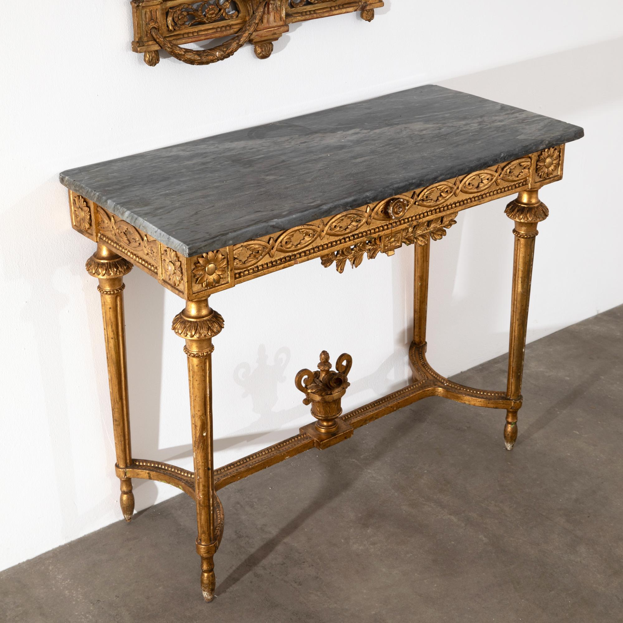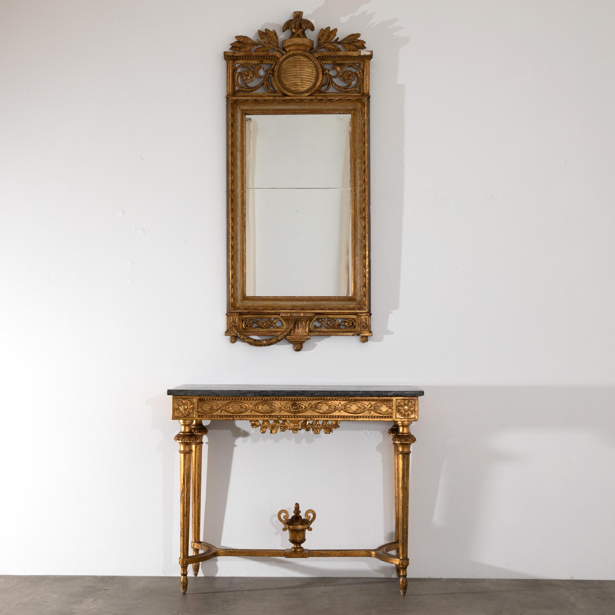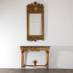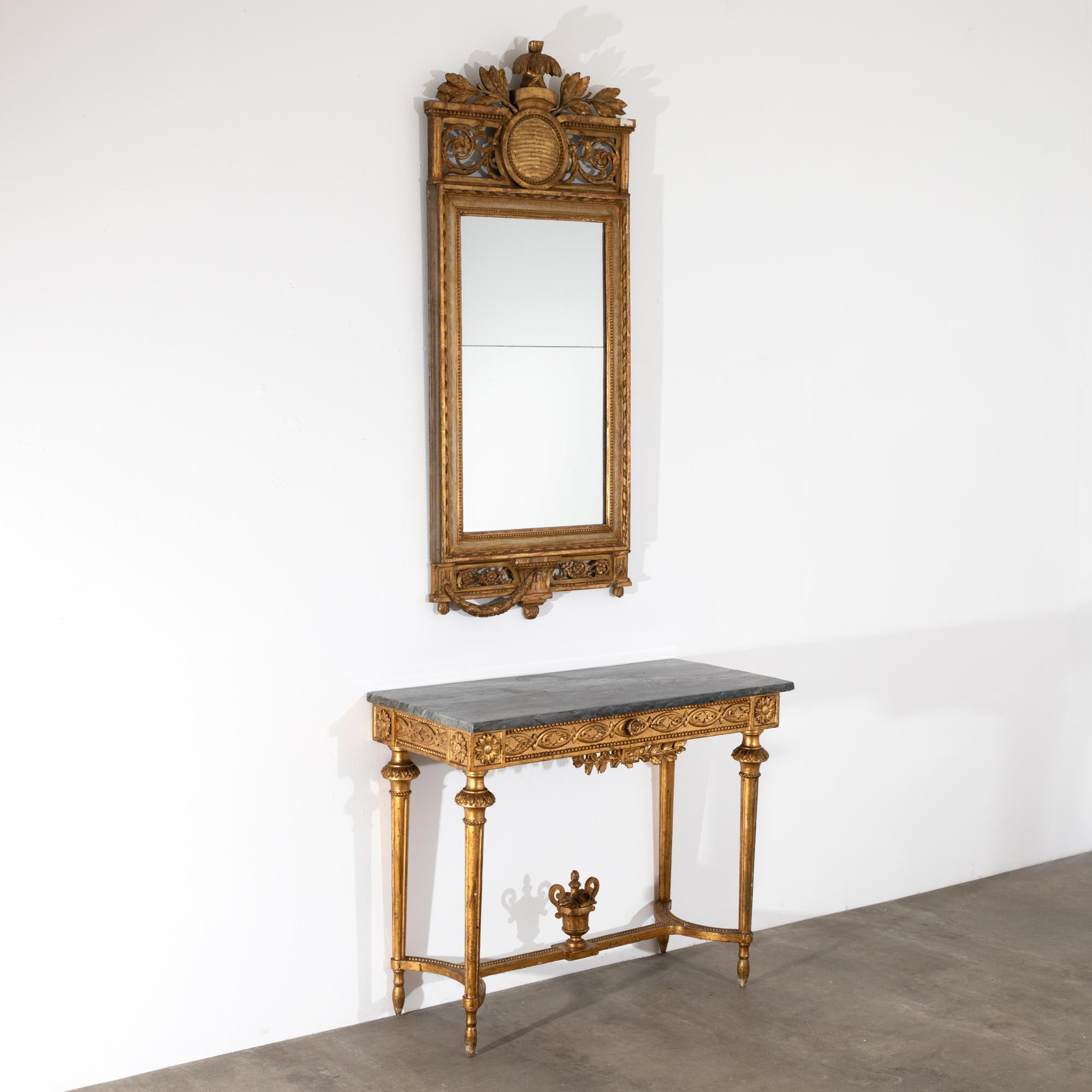 Weichholz, geschnitzt, gefasst und vergoldet. Spiegel: 145 x 62,5 cm. Der Konsoltisch (80 x 89 x 46 cm) auf mehrfach gegliederten, kannelierten Balusterbeinen unterhalb durch gebogten Steg mit zentraler urnenförmiger Vase verbunden. Die gerade, profilierte Zarge allseitig mit Mäanderfries und Rosetten. Rechteckige, gering überstehende Deckplatte aus grauem Marmor. Der korrespondierende hochrechteckige Spiegel mit profiliertem Rand und durchbrochen gearbeitetem oberen Abschluss mit runder Kartusche sowie plastisch gearbeiteten Lorbeerzweigen. Der untere Abschluss mit ebenfalls plastisch gearbeiteten Lorbeerfestons. Zweiteiliges Spiegelglas.