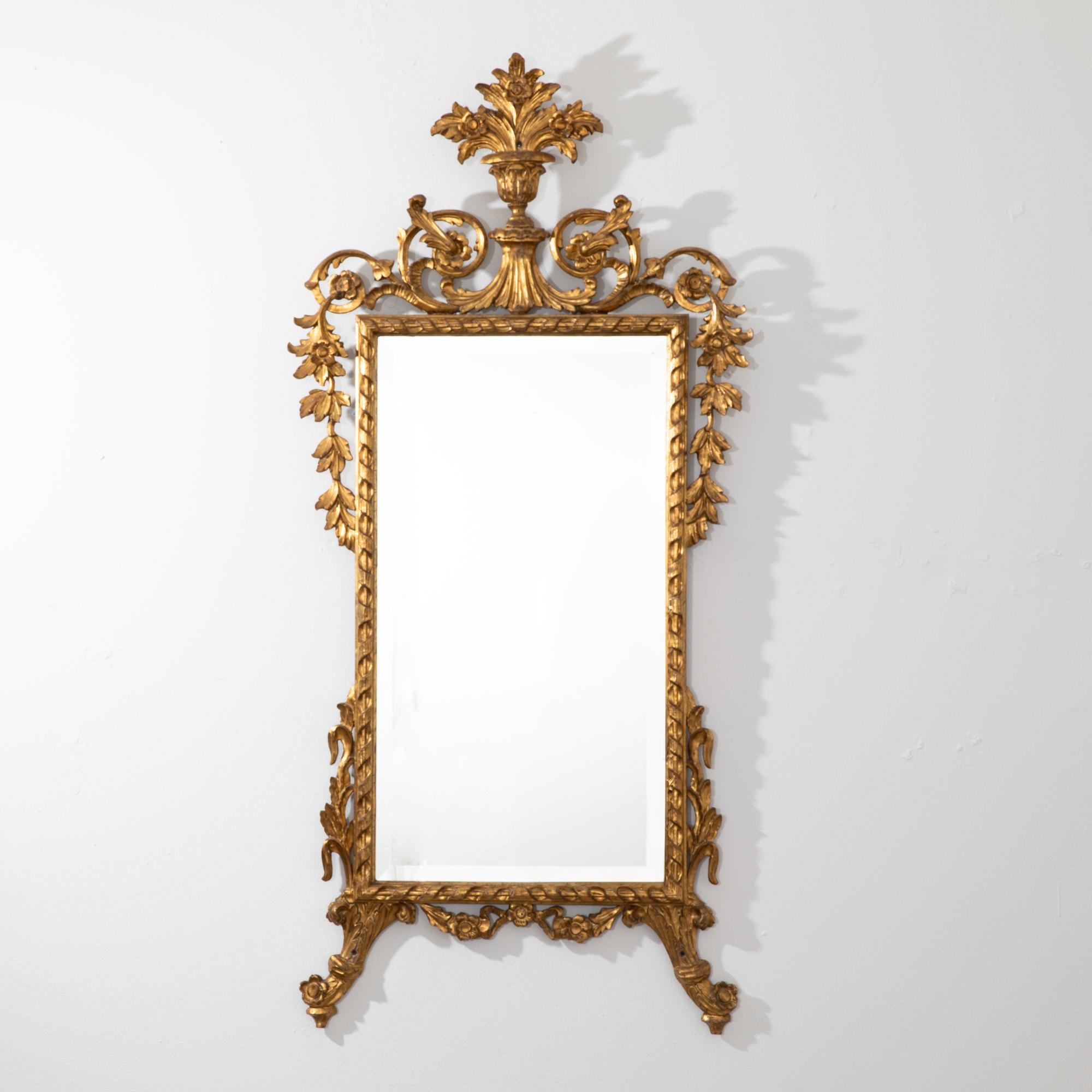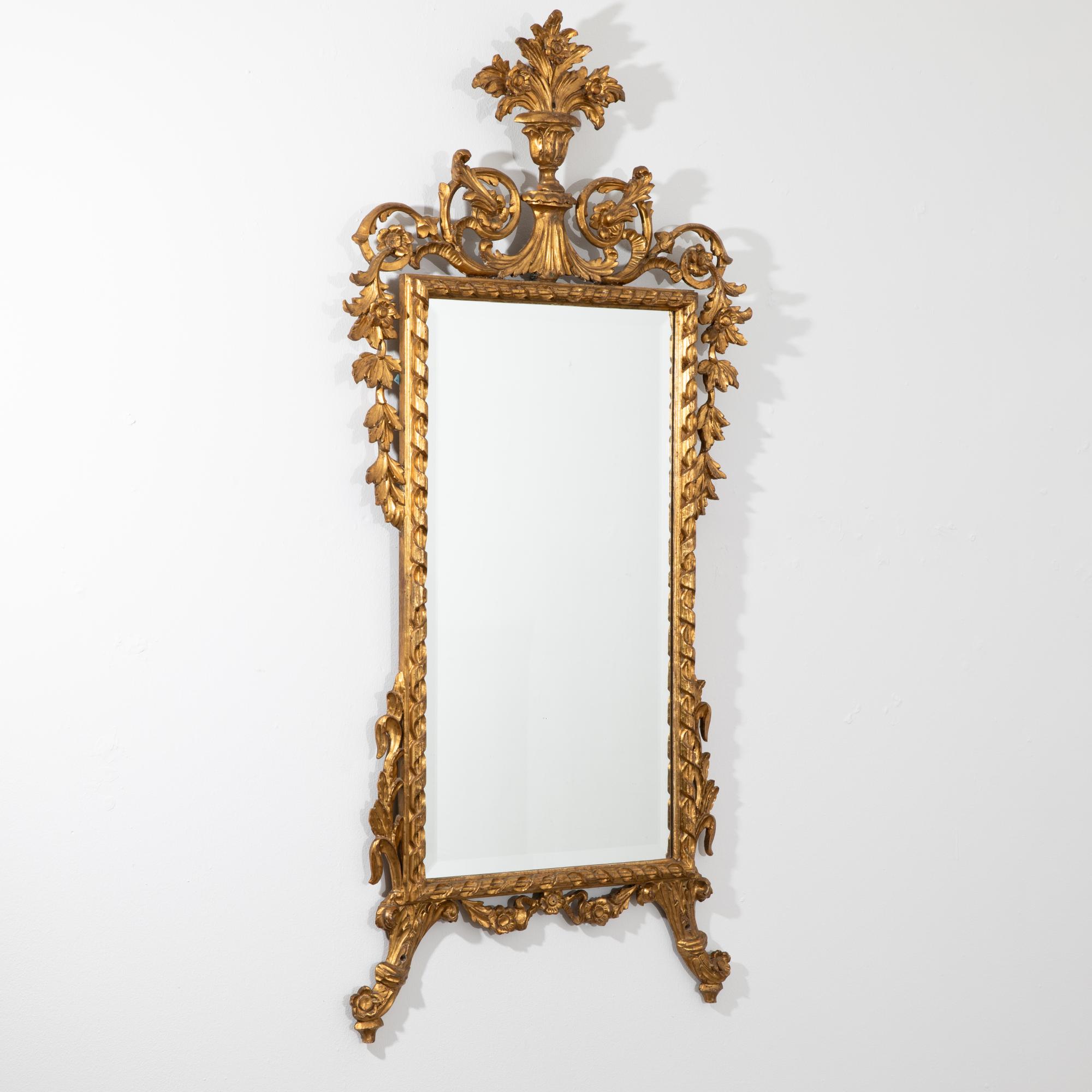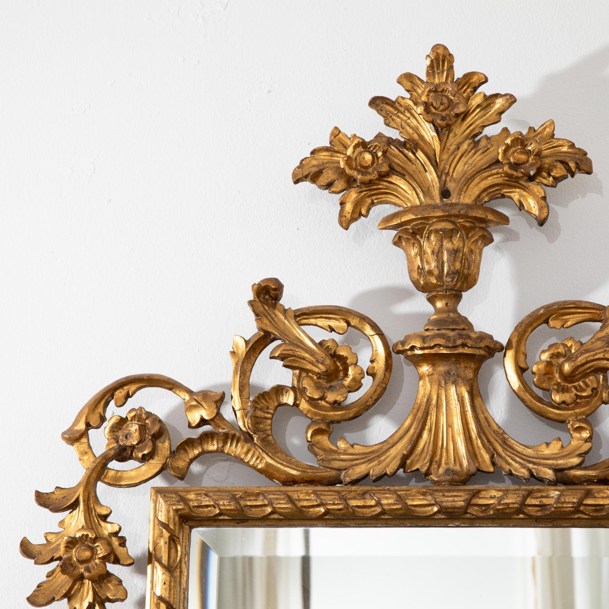 mit durchbrochen gearbeiteter Bekrönung mit Blattranken und Vasenmotiv. Korrespondierender unterer Abschluss. Facettiertes Spiegelglas. 150 x 72 cm (Spiegel: 84 x 45 cm).