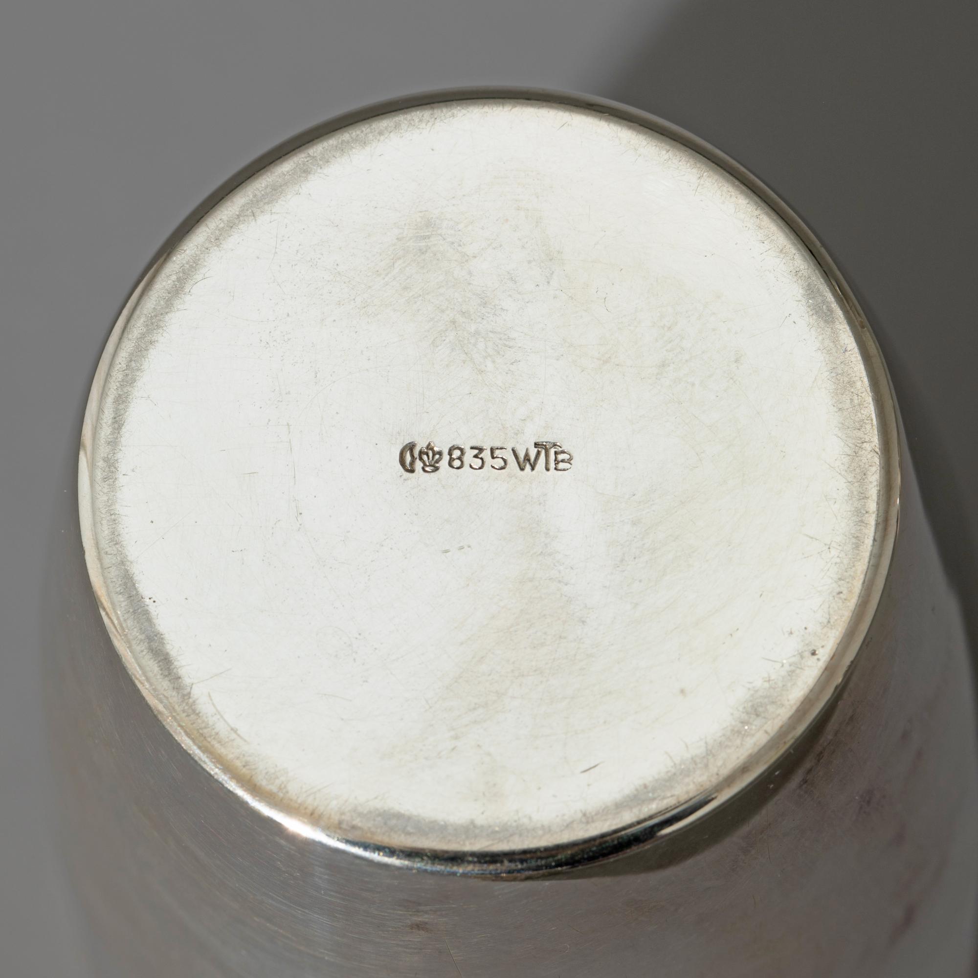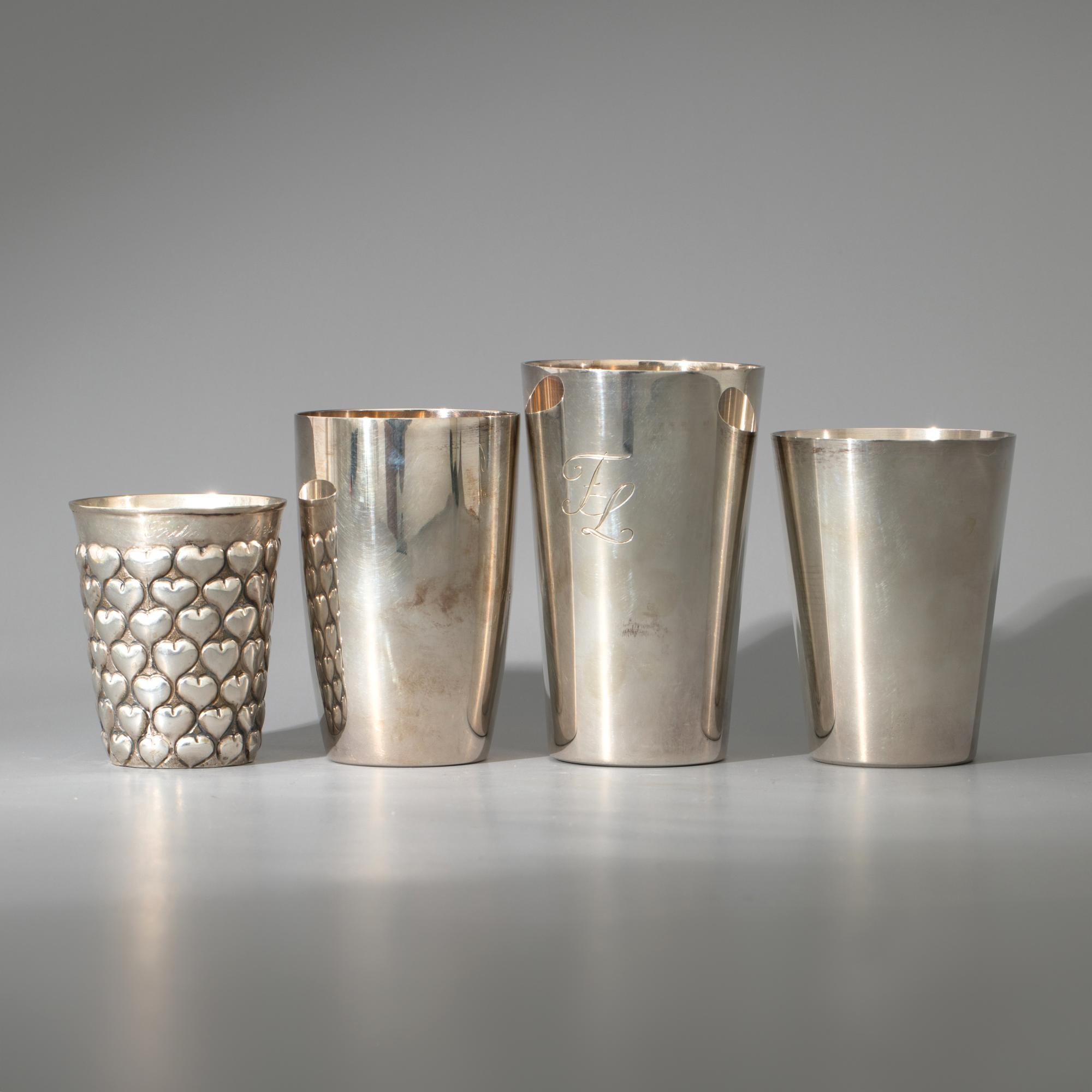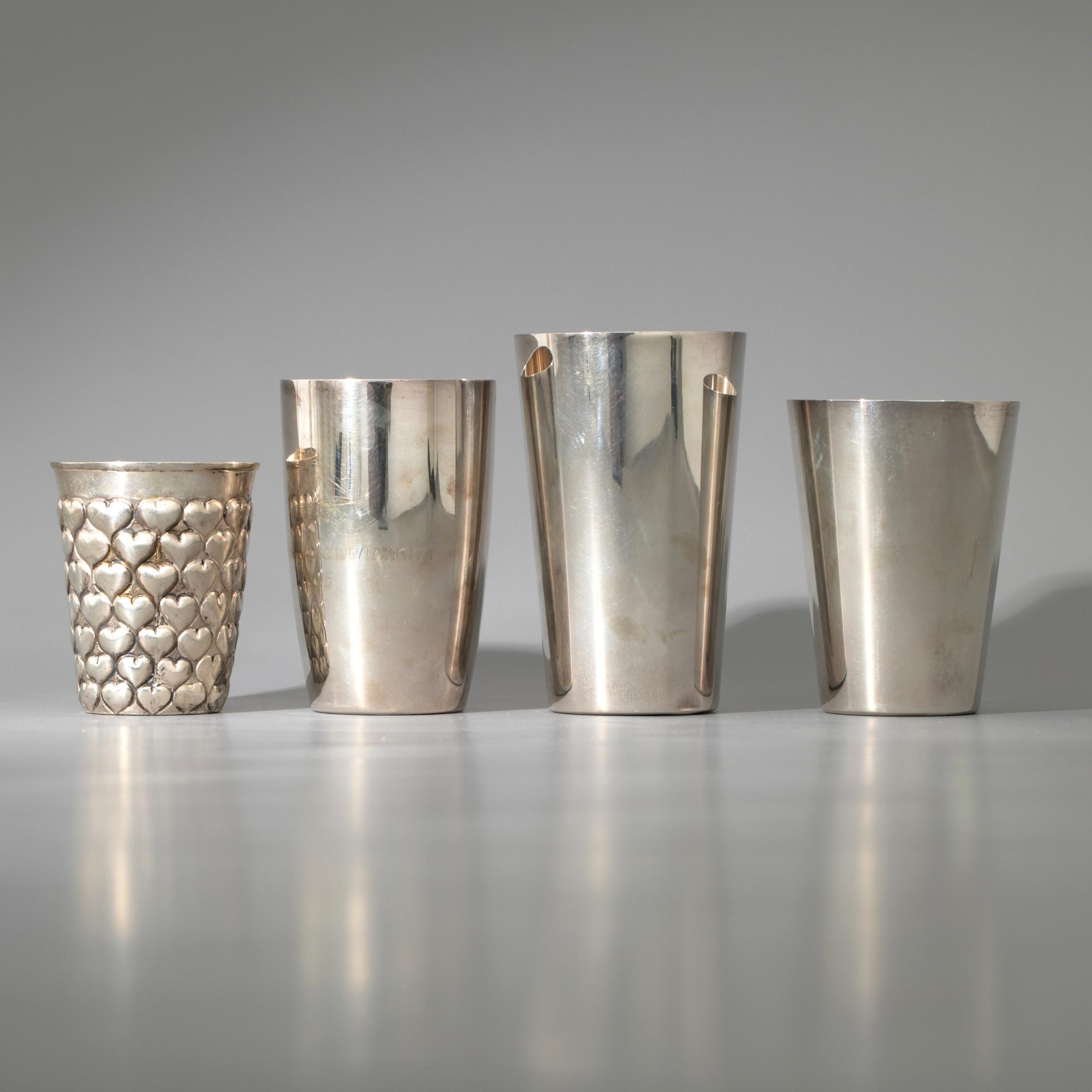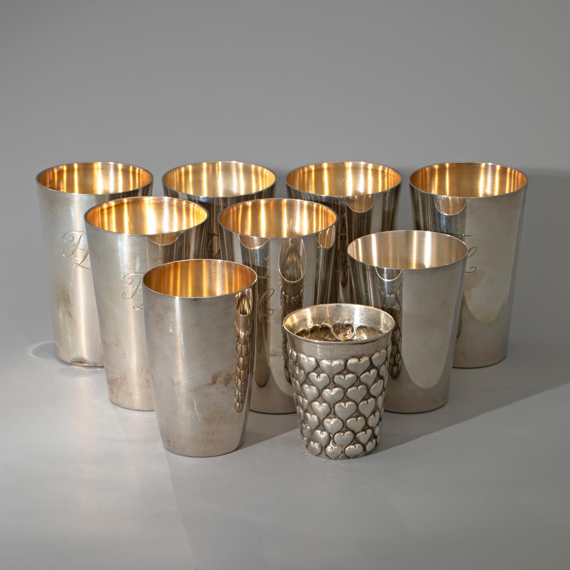 Silber. 6 Becher, monogrammiert, 925er Silber, Gayer & Krauss, Schwäbisch Gmünd / 1 Silberbecher unterseitig graviert: DB LUX 2012 2. Netto, 925er Silber, M.H. Wilkens & Söhne, Bremen / 1 Becher mit graviertem Segelboot und Inschrift: Friedrich Landwehrmann 1995, 835er Silber, Wilhelm Binder, Schwäbisch Gmünd / Herzbecher mit Gravur: Fritz-Andrea 25.5.1991, 800er Silber, Deutschland. H. 8 cm - 12 cm. Gewicht: 1.340 g. (9)
