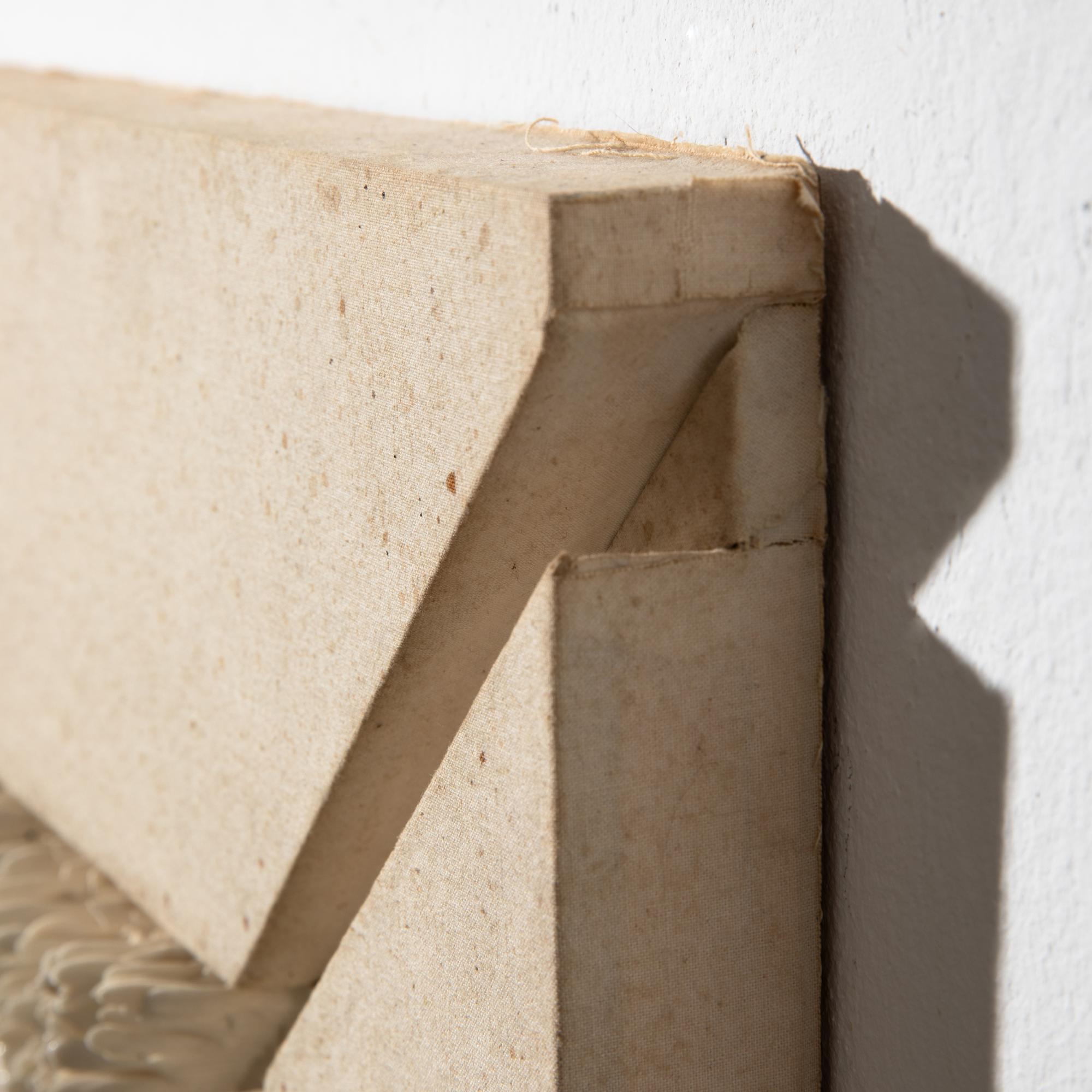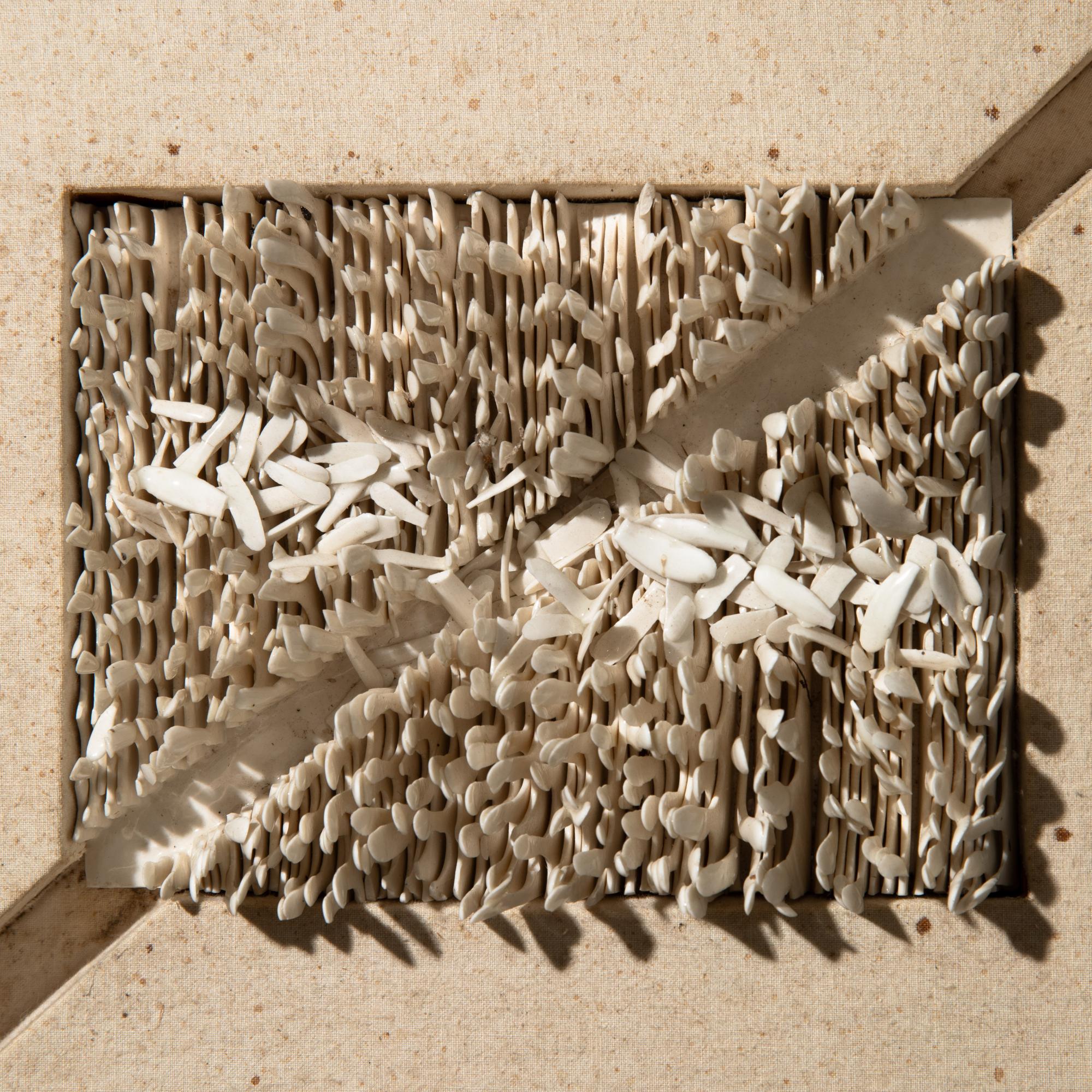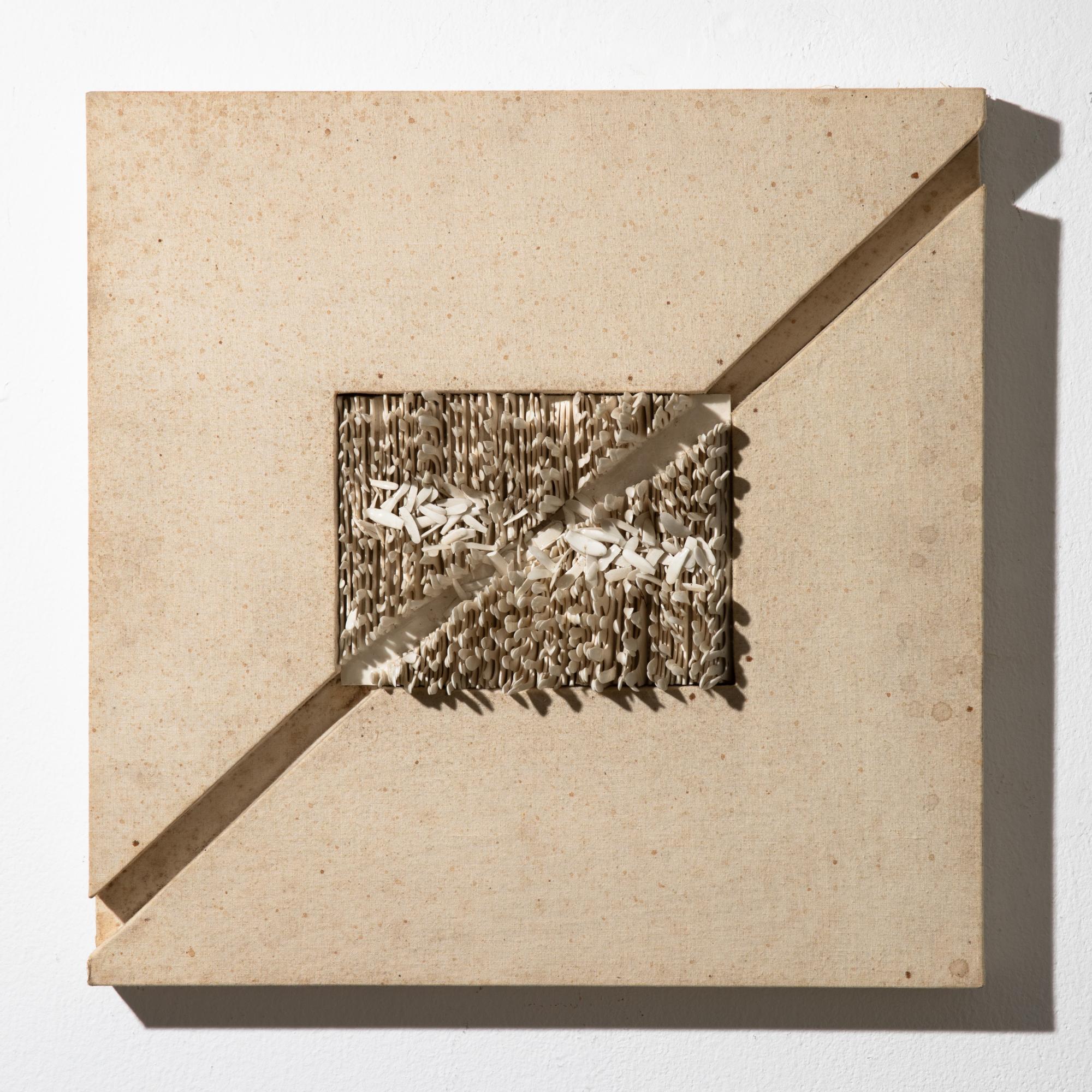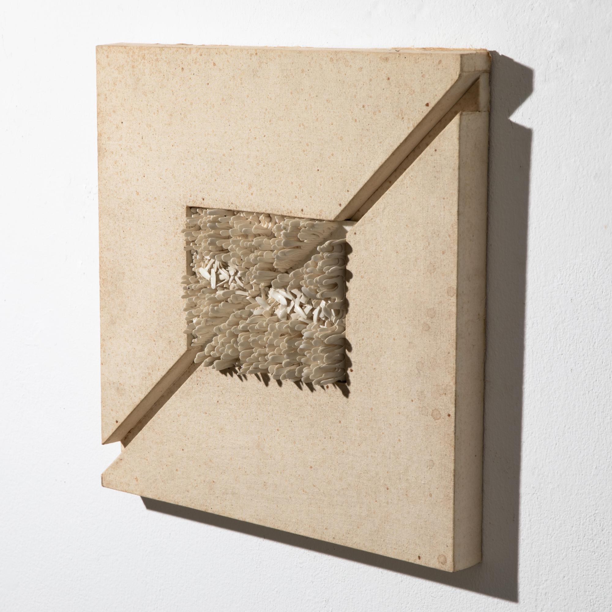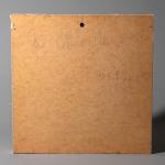 - Porzellan auf Leinwand, ungerahmt. 13 cm x 18 cm (Porzellanobjekt), 40 cm x 40 cm (gesamt). Es soll sich um ein Geschenk für das Keramiker-Paar Elly und Wilhelm Kuch handeln. Rückseitig entsprechend bezeichnet: für Elli + Willi / Kurt 76.