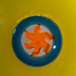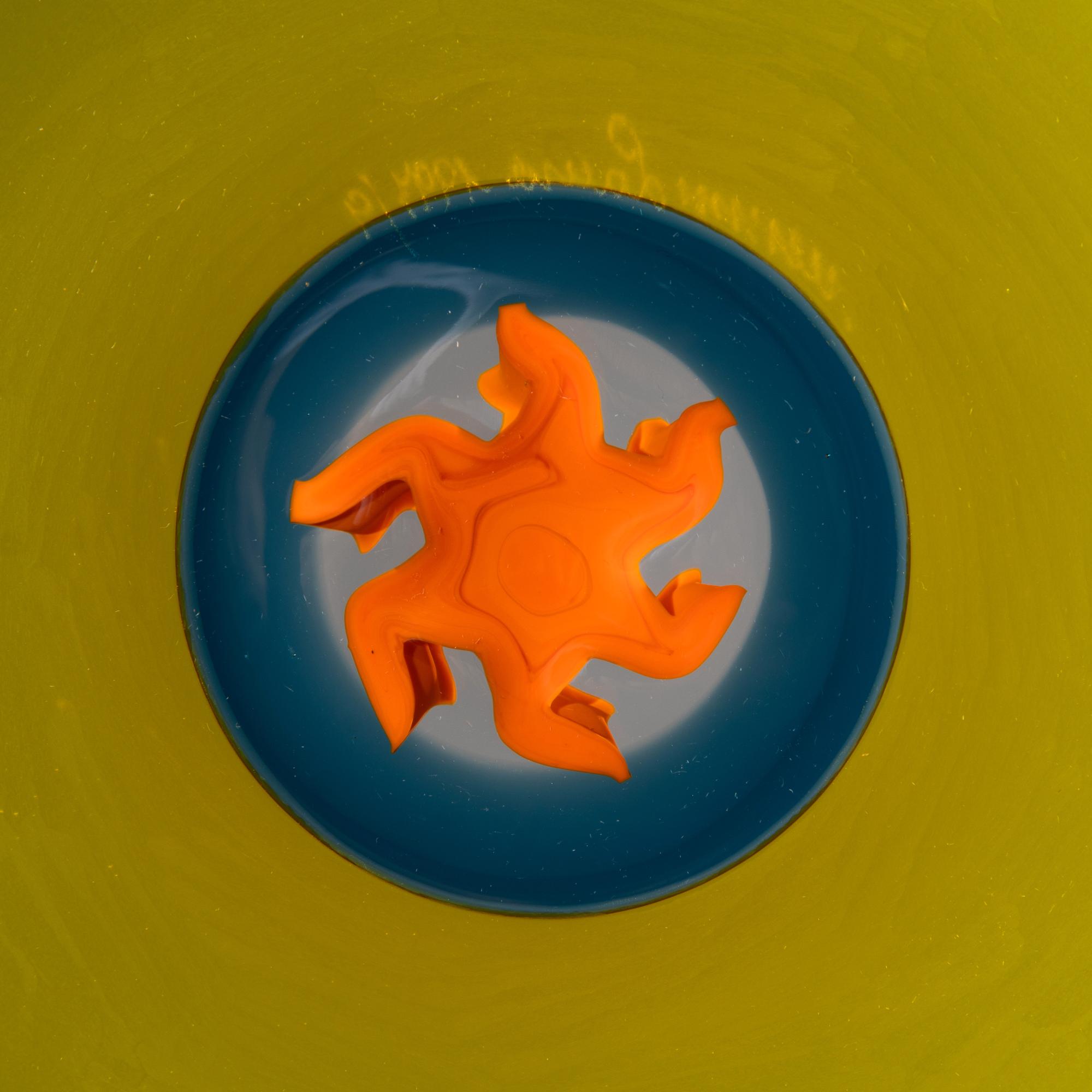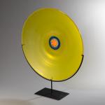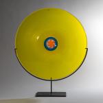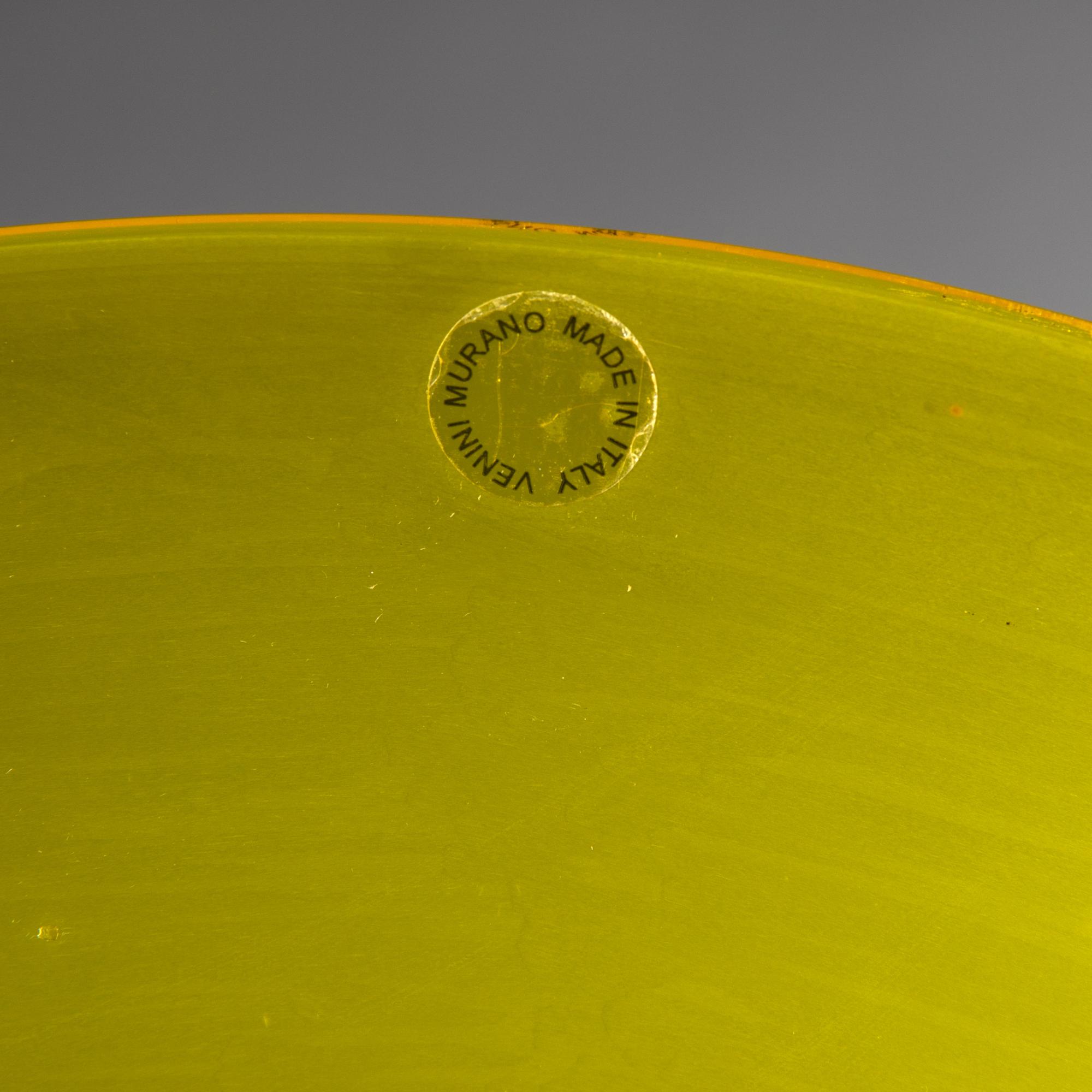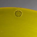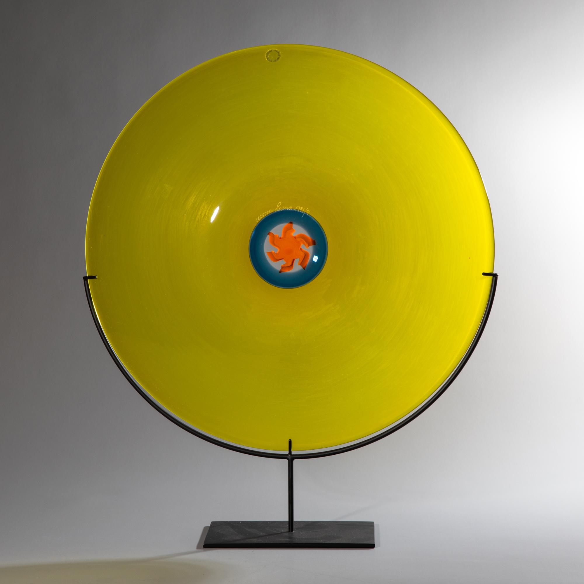 Aus der Serie 'Pianeti'. Entwurf 1986. Ausführung Venini, Murano, 1997. Überfangglas farblos, gelb, gesamte Oberfläche matt geschliffen, im Zentrum Murrine, farblos, blau, orange. D. 39 cm. Auf der Rückseite bez.: venini Laura 1997/9 (graviert); Herstelleretikett.