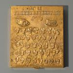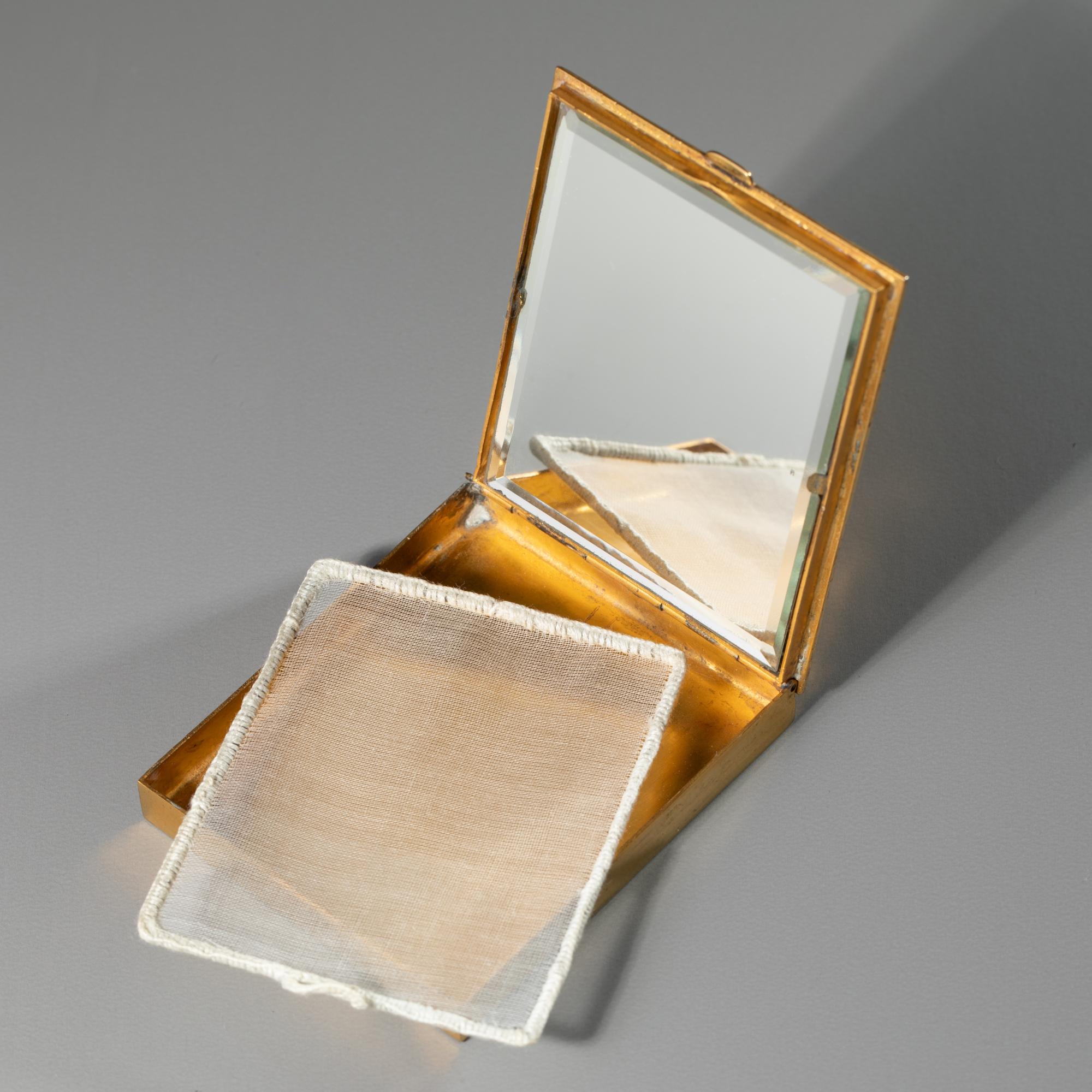Bronze, vergoldet. Scharniertes Döschen mit Spiegel im Deckel und textilem Pudergittereinsatz. 1 x 6,1 x 7,3 cm. Unterseitig bezeichnet mit Line Vautrin.